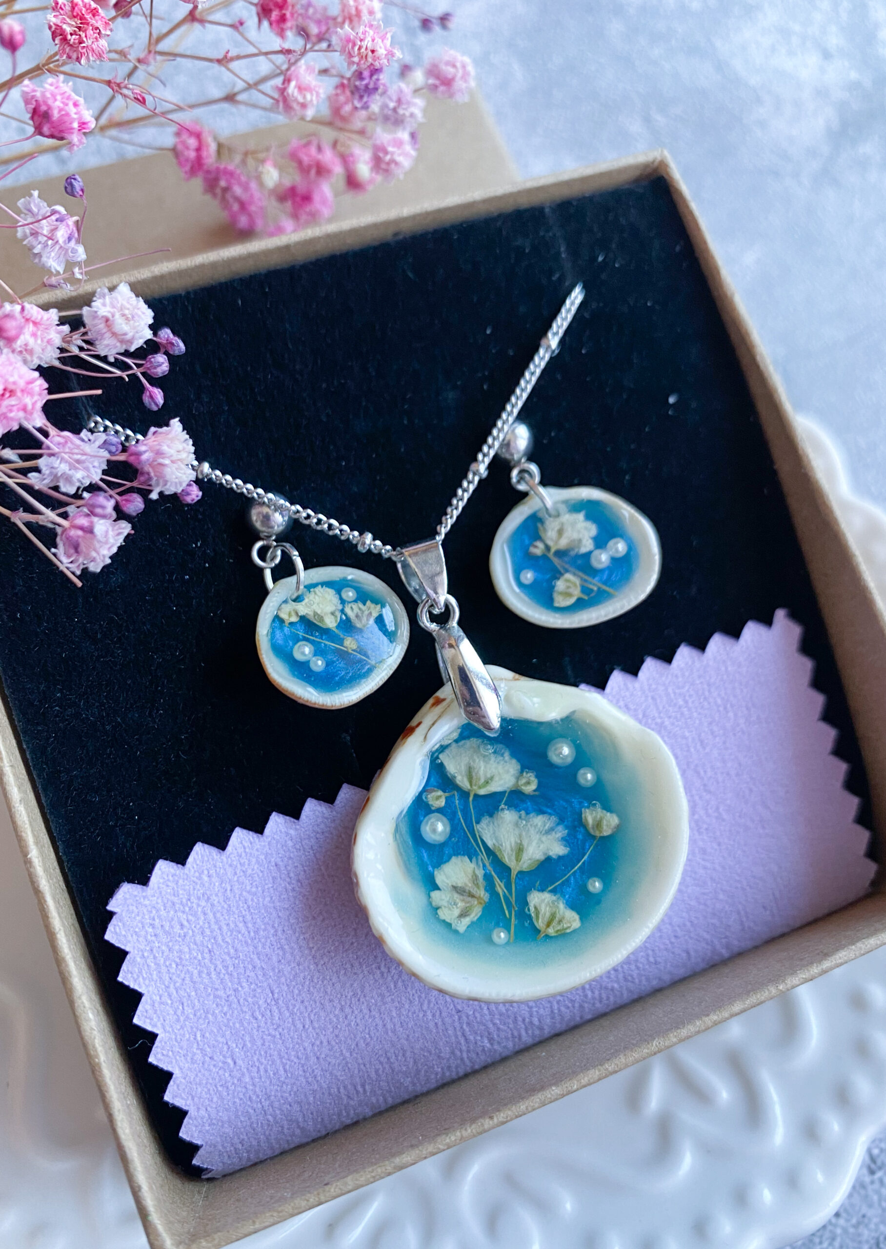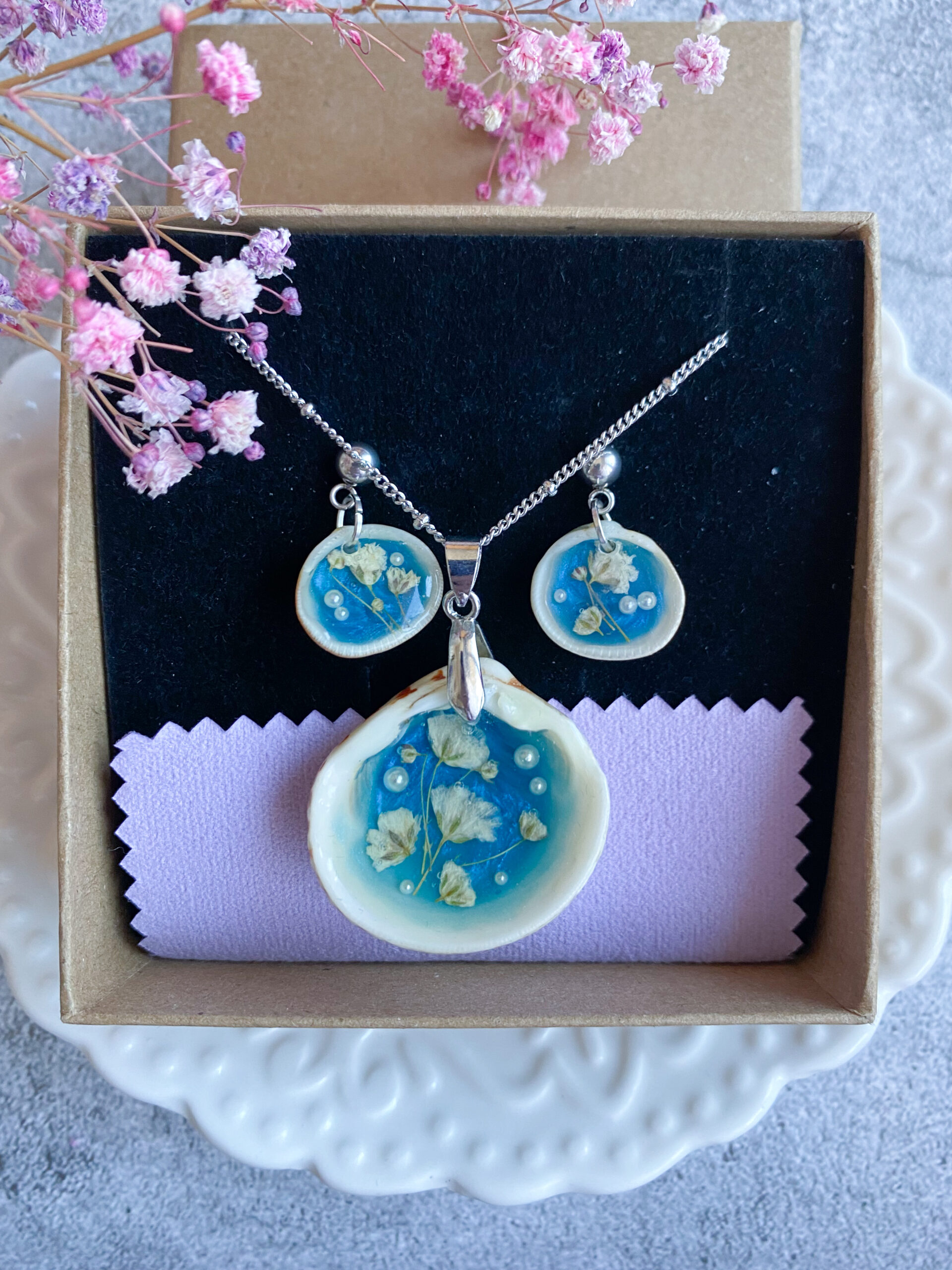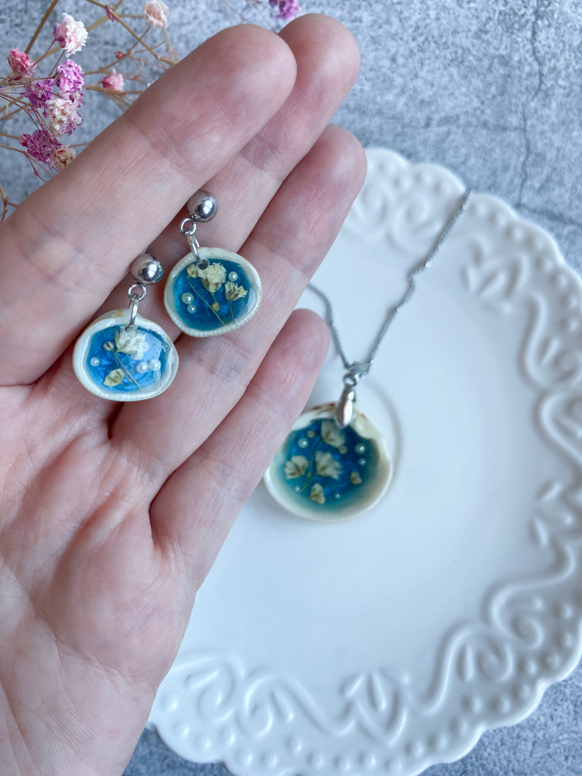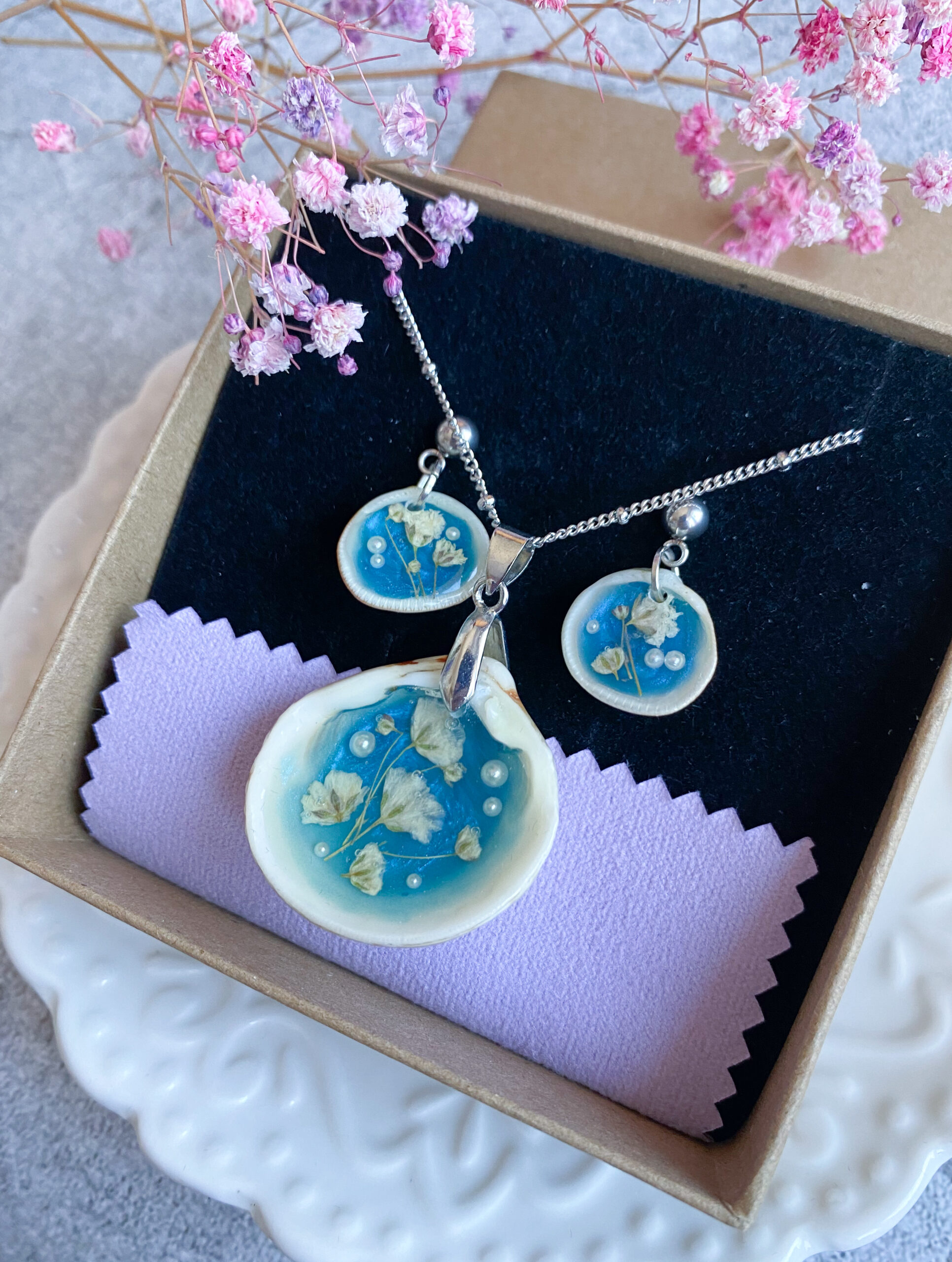Opis: Ręcznie wykonany dwuelementowy zestaw biżuterii składający się z kolczyków na ozdobnych biglach oraz zawieszki. W prawdziwych muszelkach zatopione zostały kwiaty białej gipsówki z perełkami na granatowym tle.
