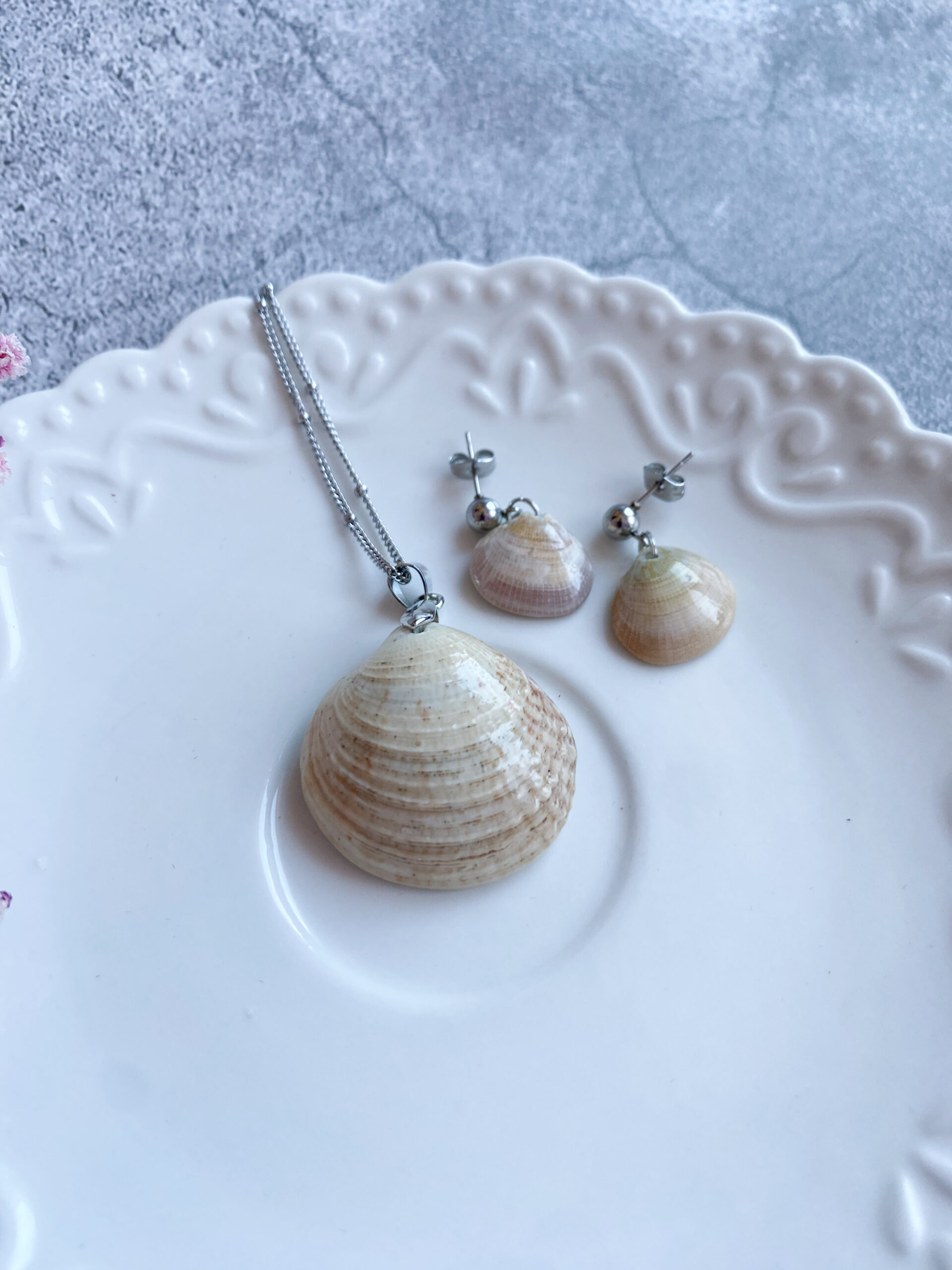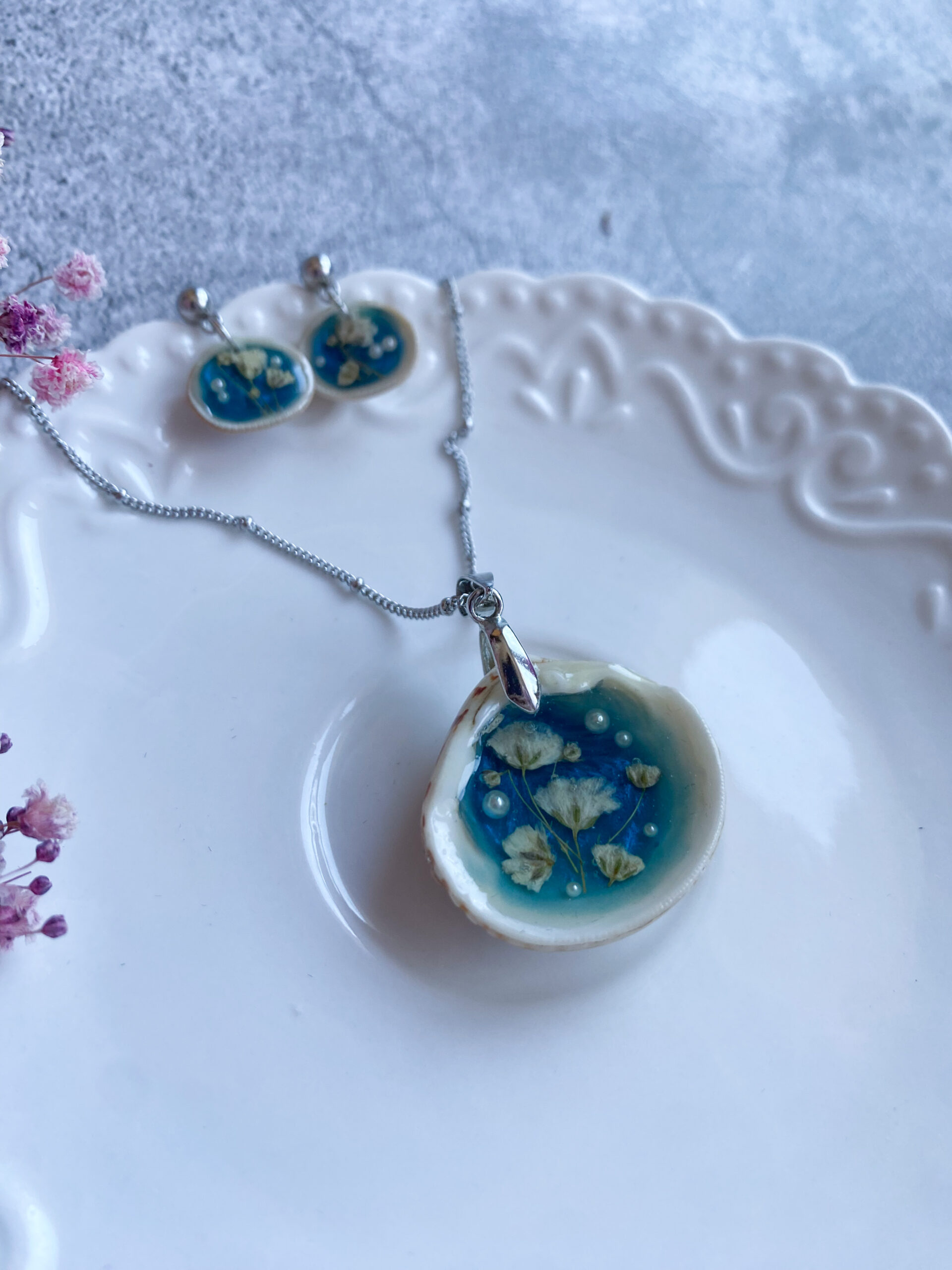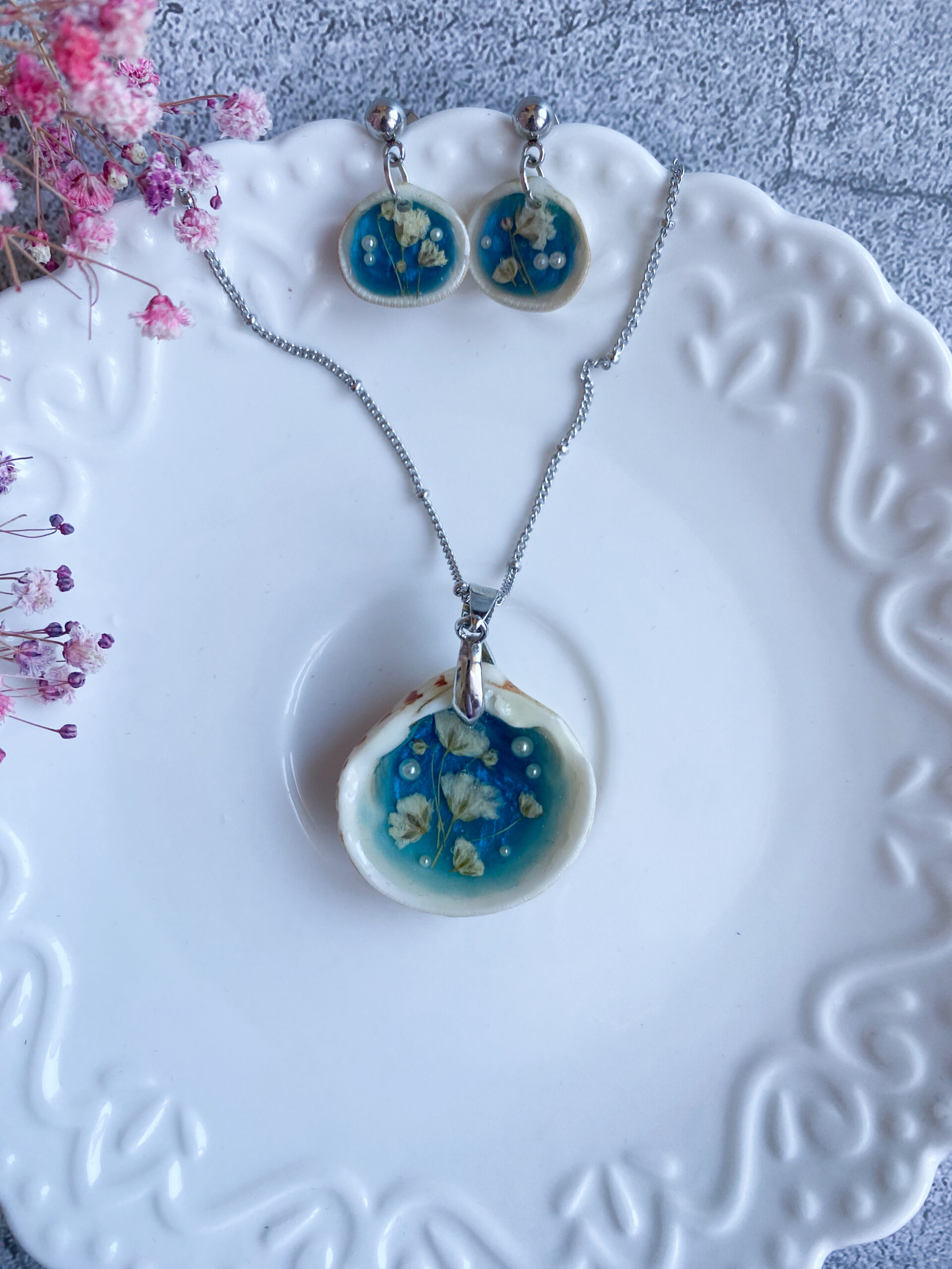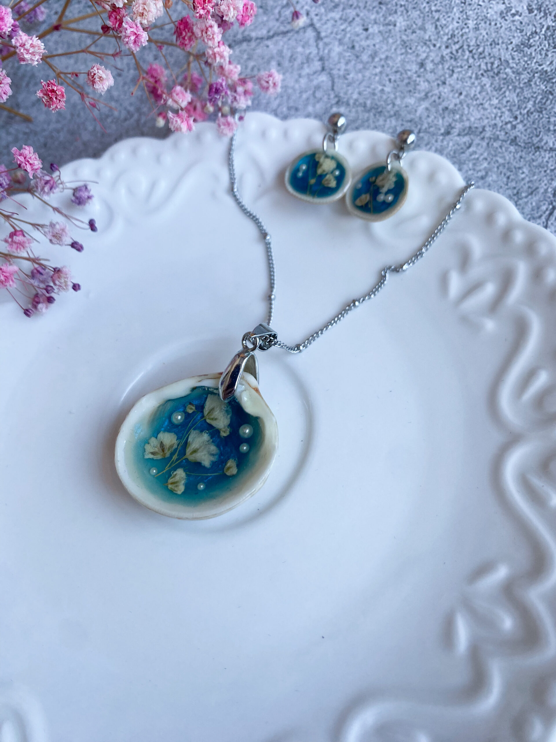 Opis: Ręcznie wykonany dwuelementowy zestaw biżuterii składający się z kolczyków na ozdobnych biglach oraz zawieszki. W prawdziwych muszelkach zatopione zostały kwiaty białej gipsówki z perełkami na granatowym tle.