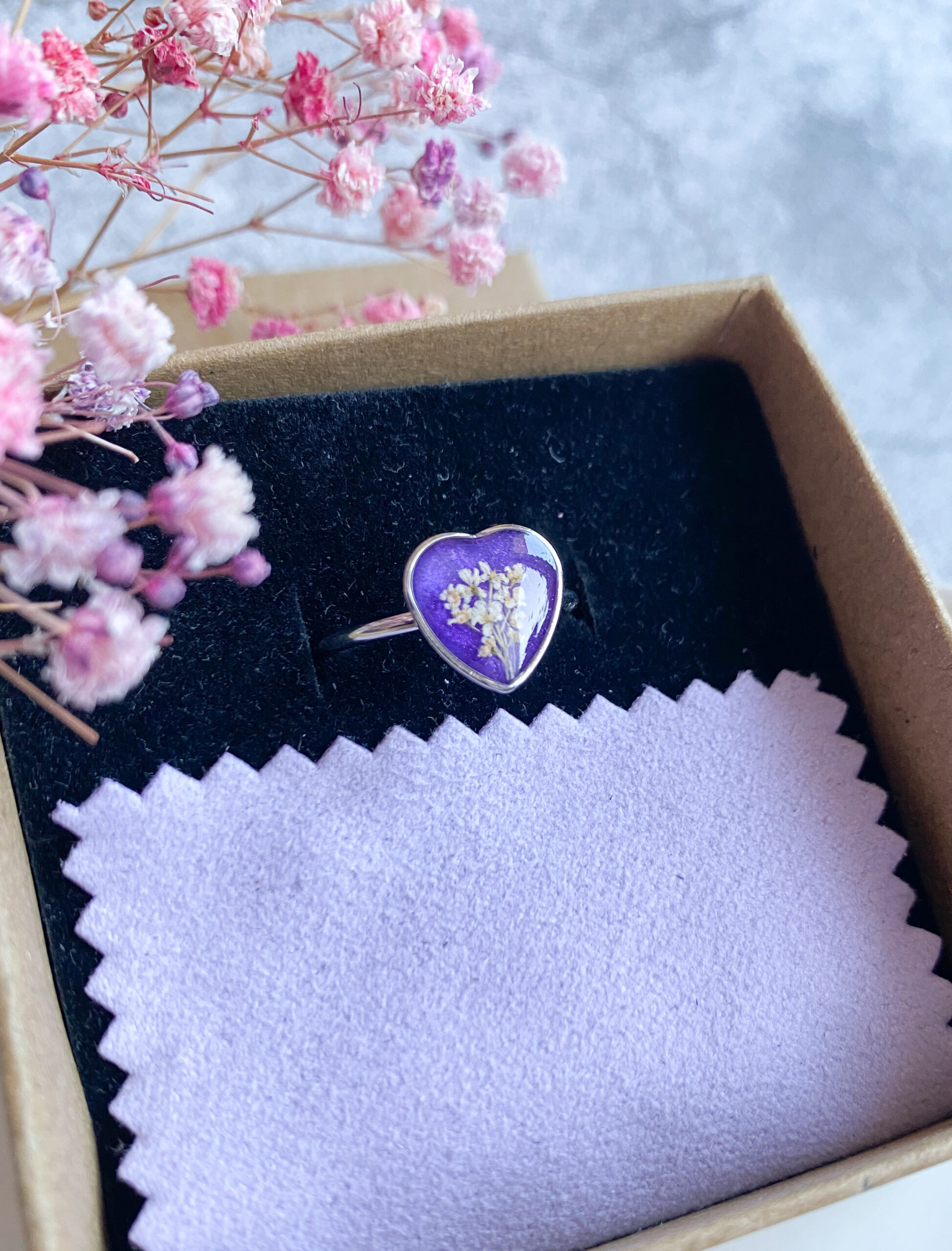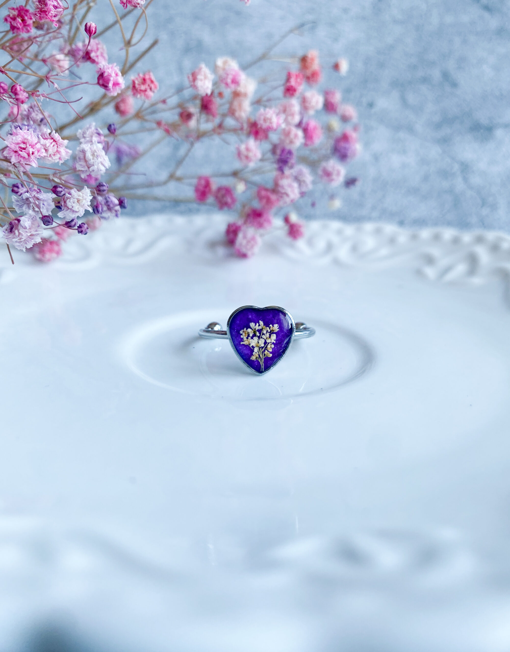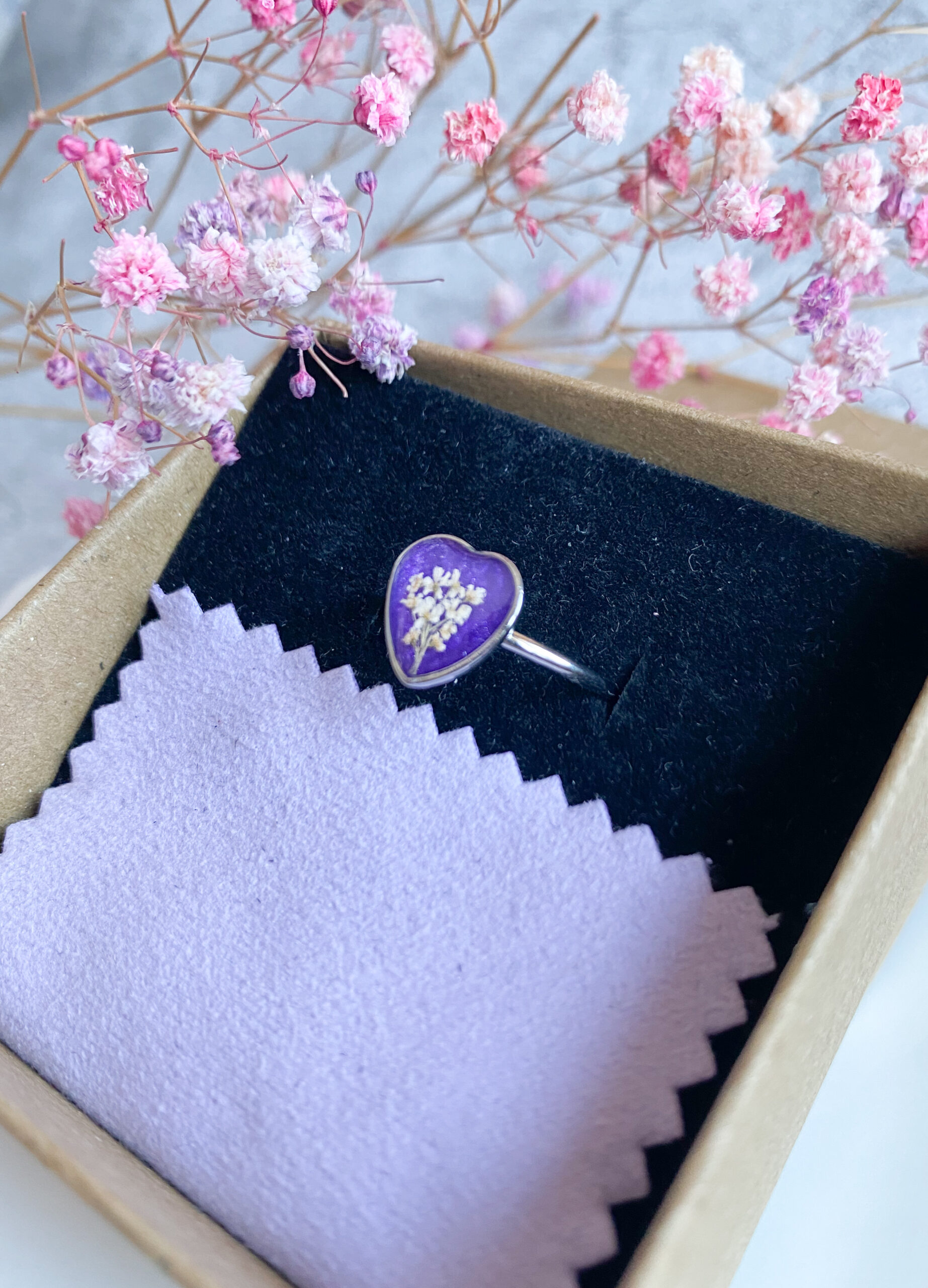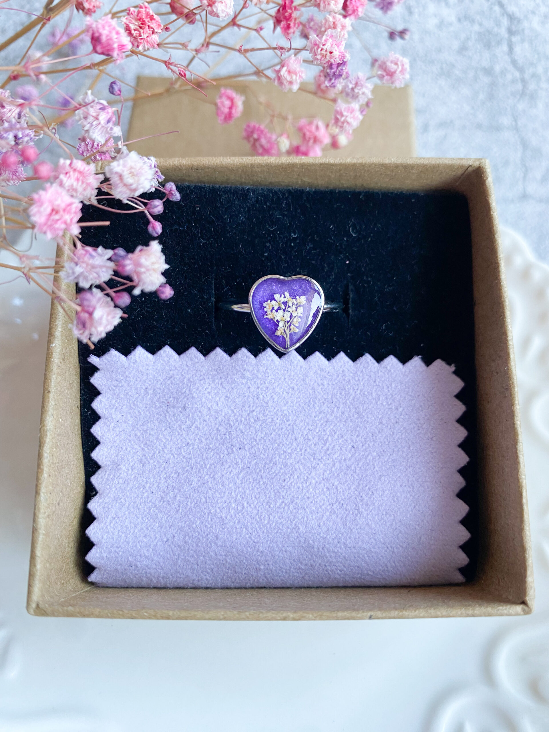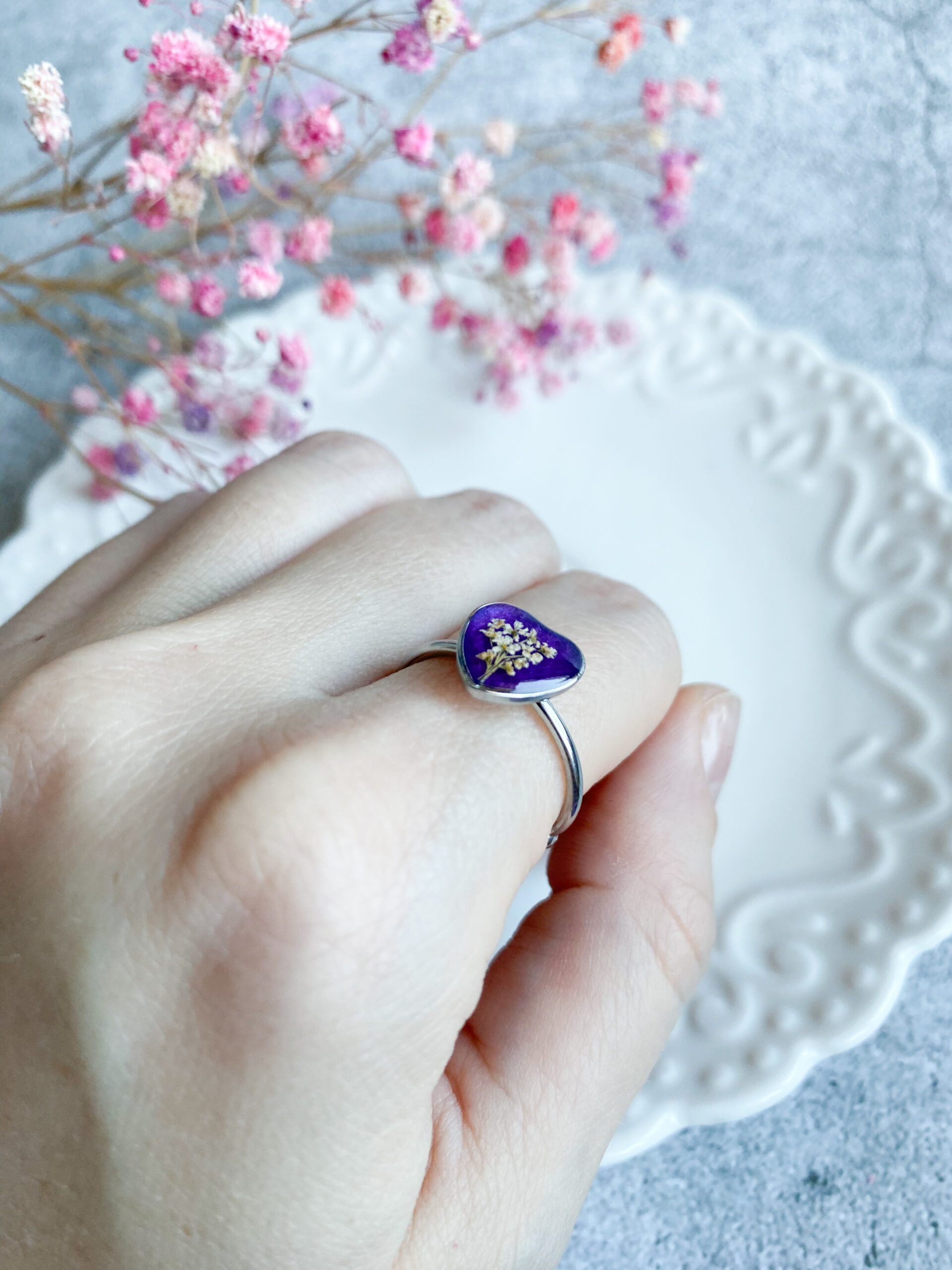 Opis: Ręcznie wykonany regulowany pierścionek w kształcie serca. W biżuterii zatopione zostały kwiaty białej marchwii na fioletowym tle.