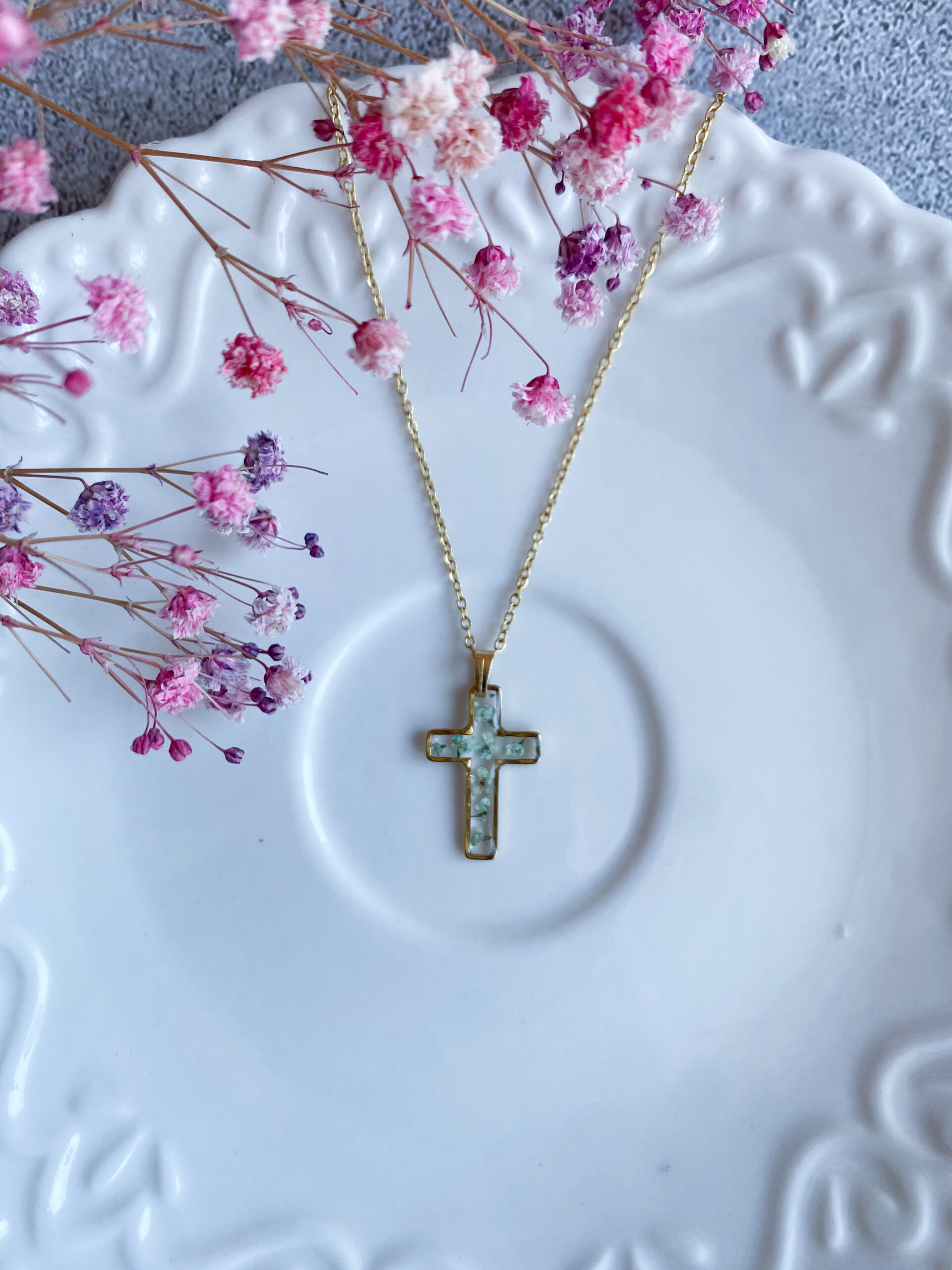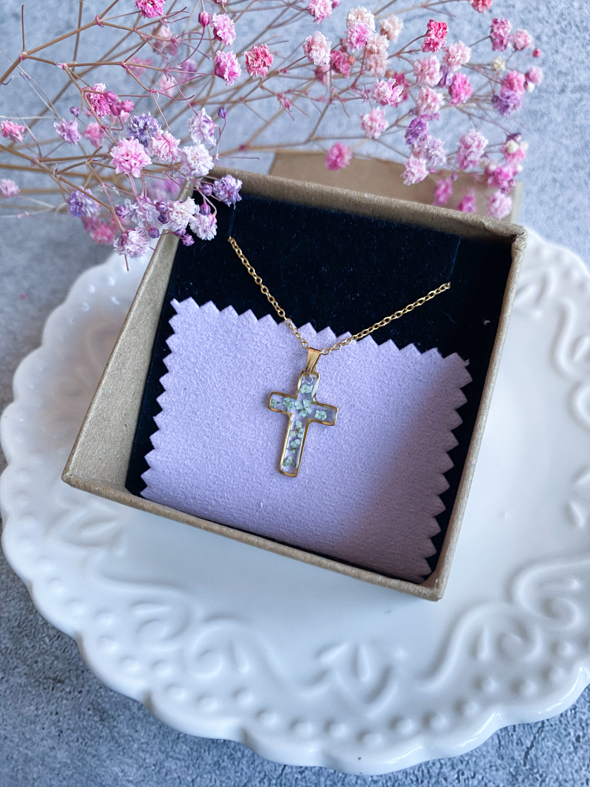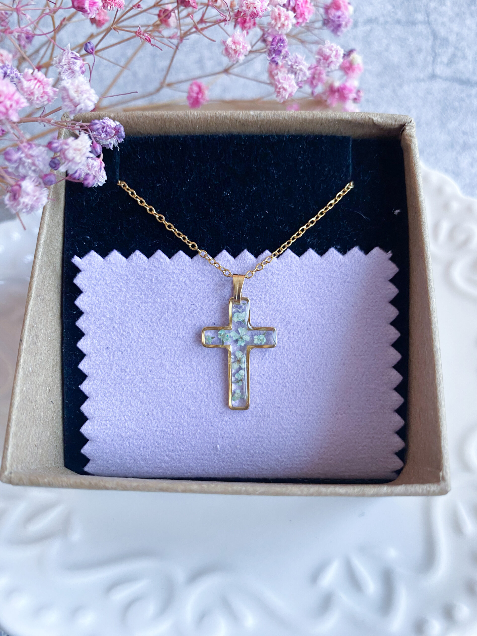 Opis: Ręcznie wykonana zawieszka w kształcie krzyżyka. W biżuterii zatopione zostały kwiaty miętowej marchwii.