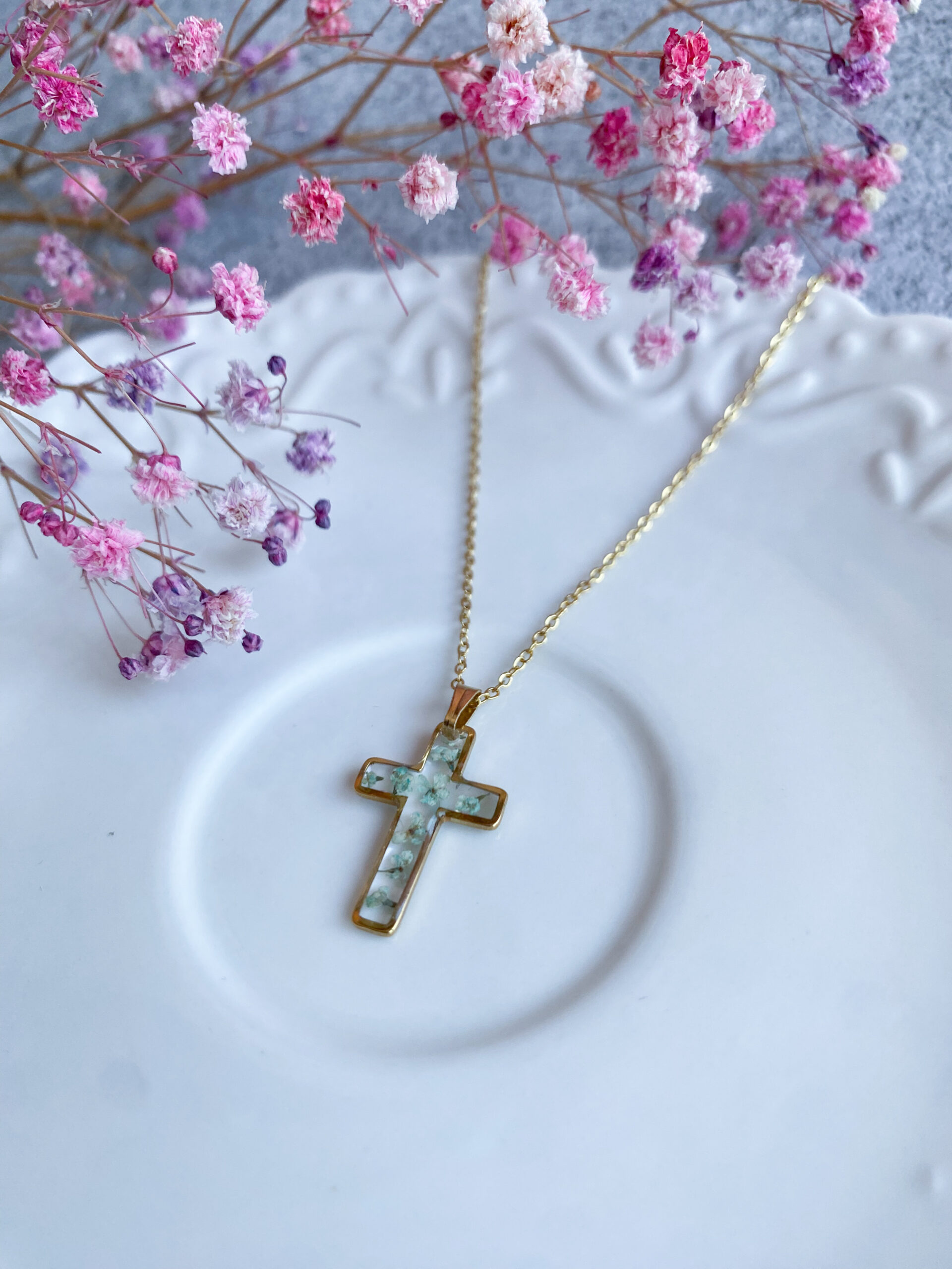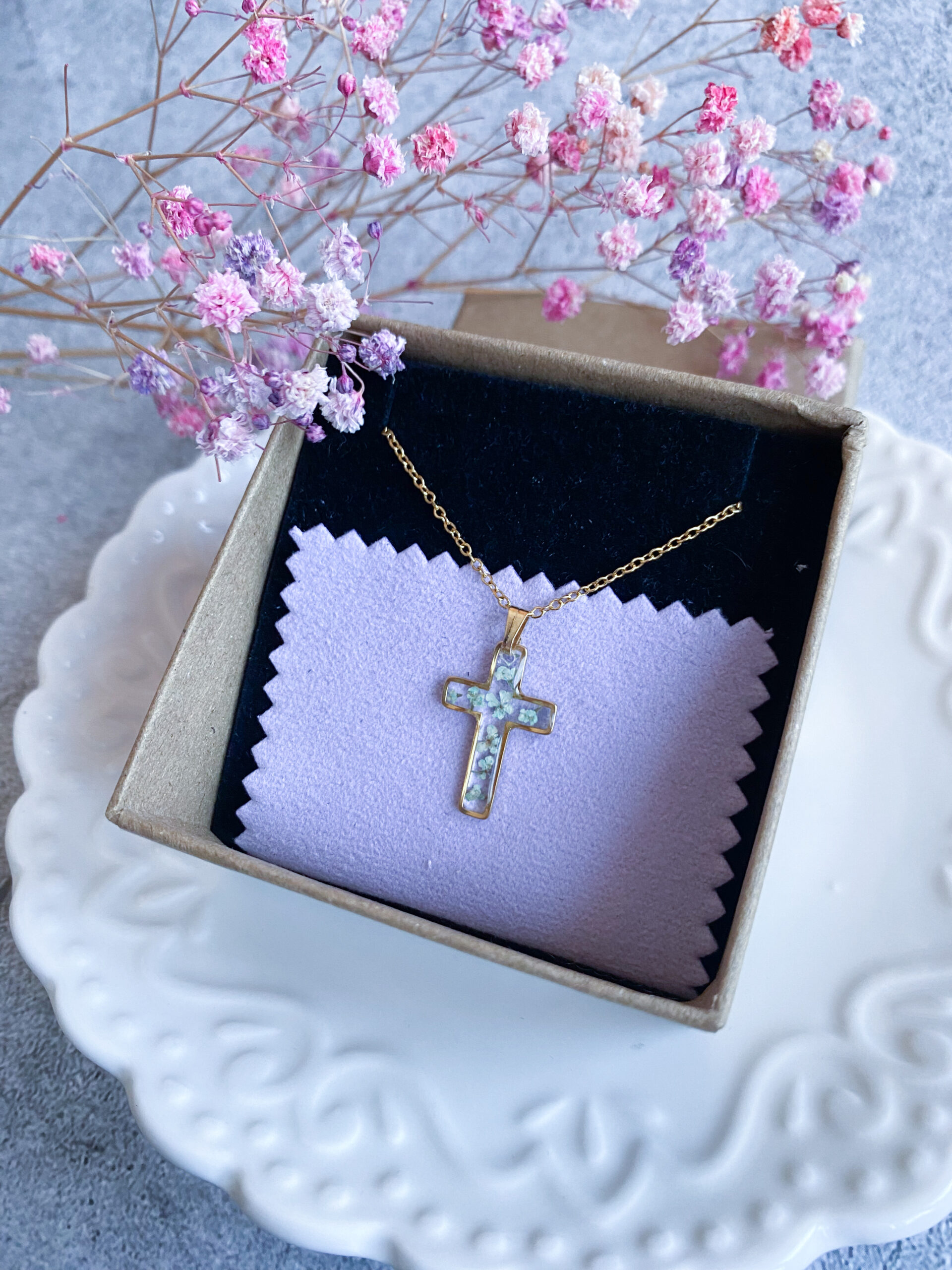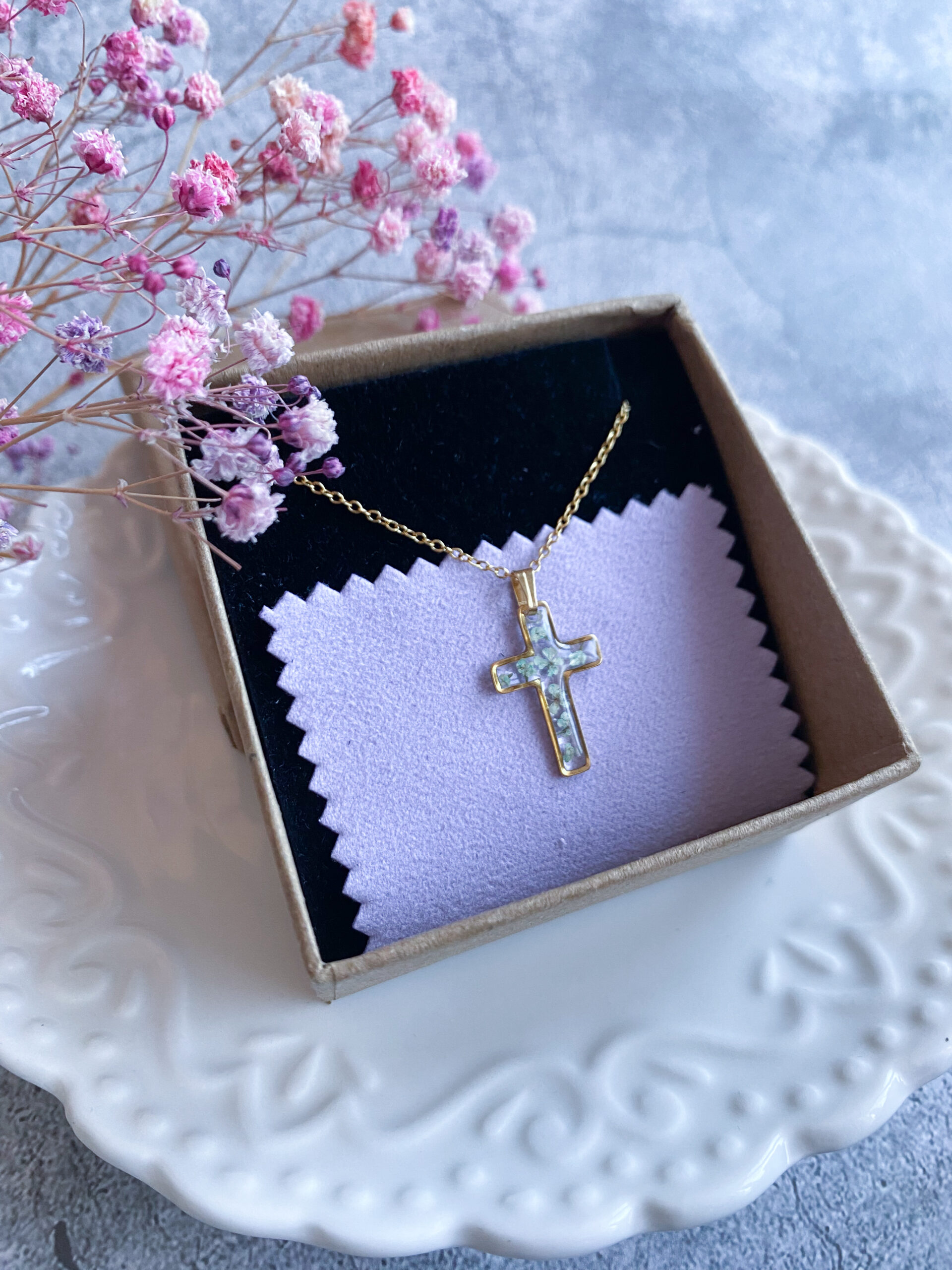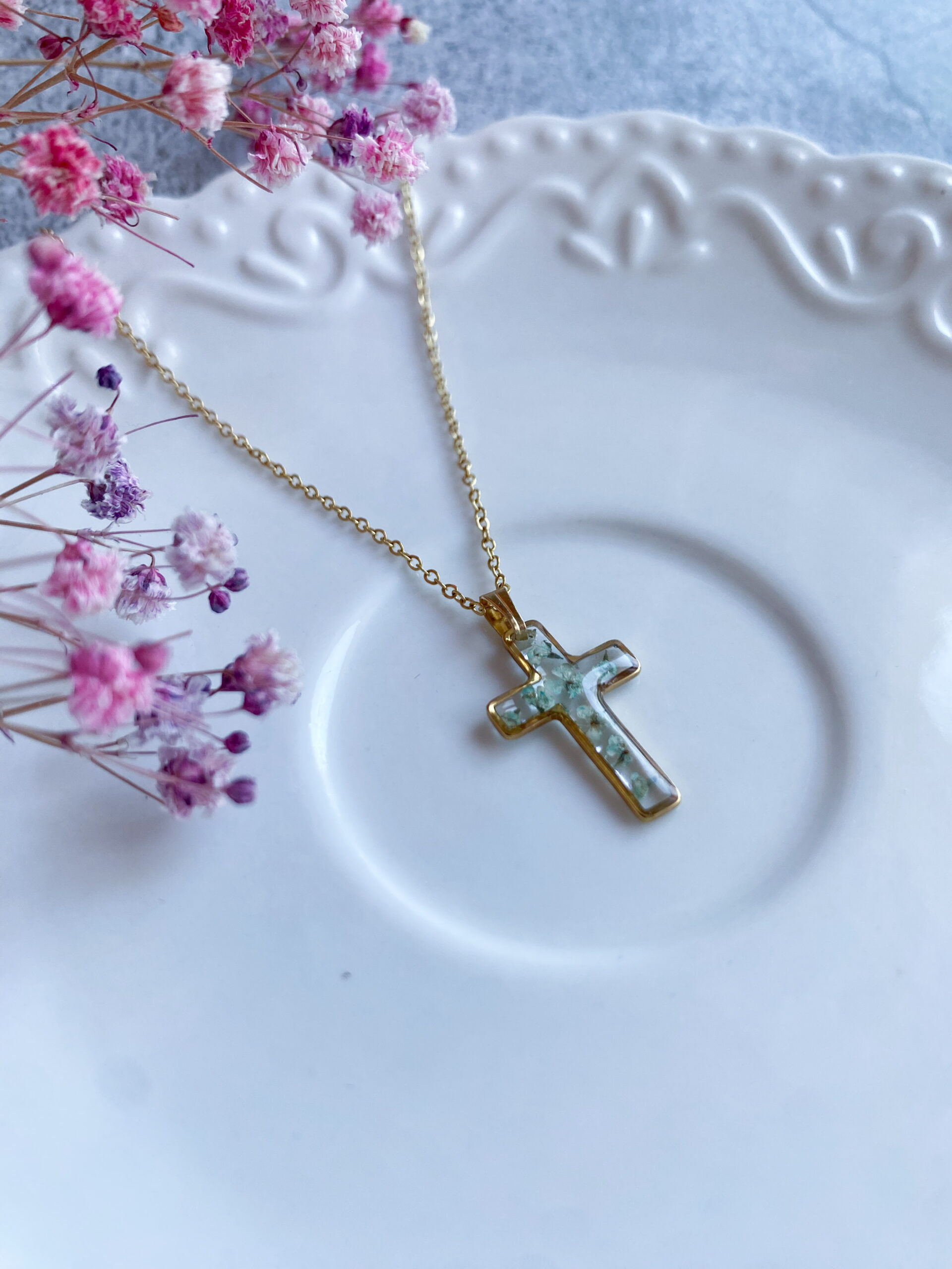 Opis: Ręcznie wykonana zawieszka w kształcie krzyżyka. W biżuterii zatopione zostały kwiaty miętowej marchwii.