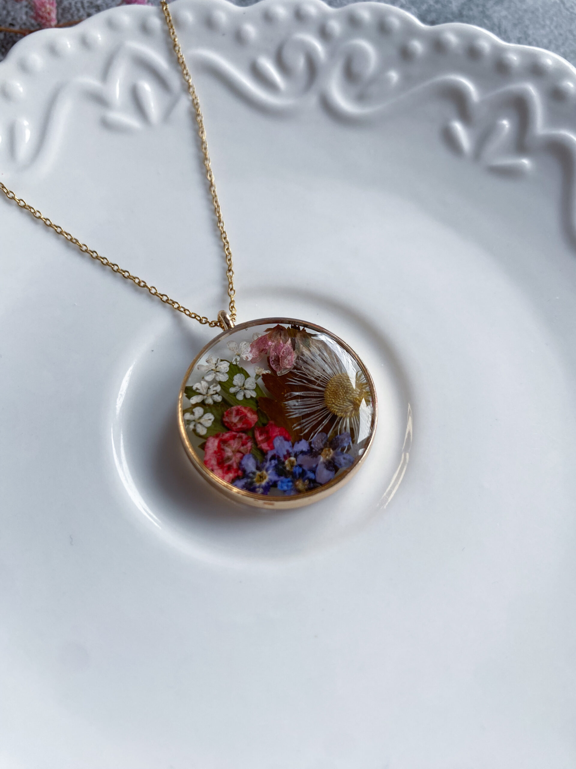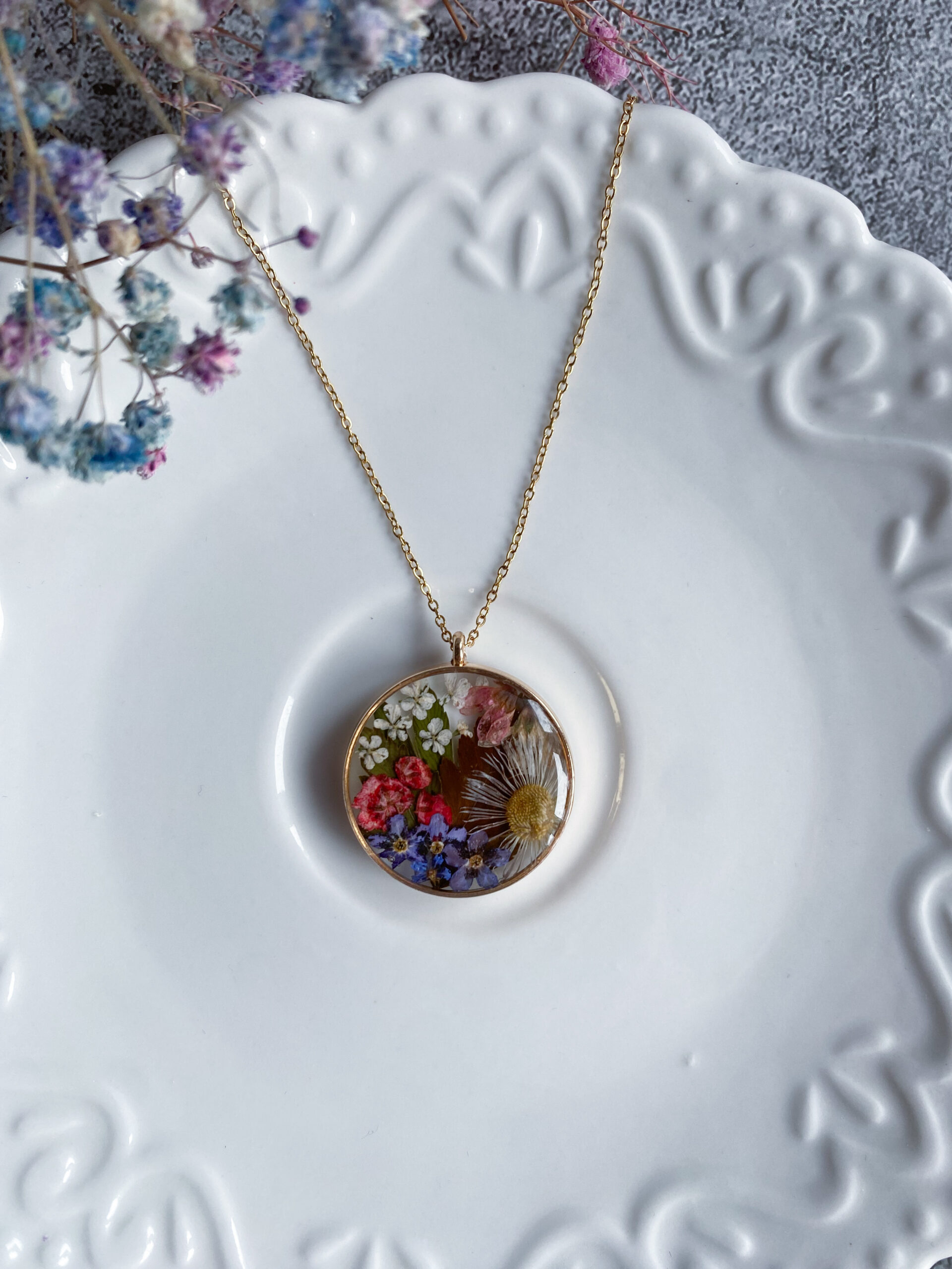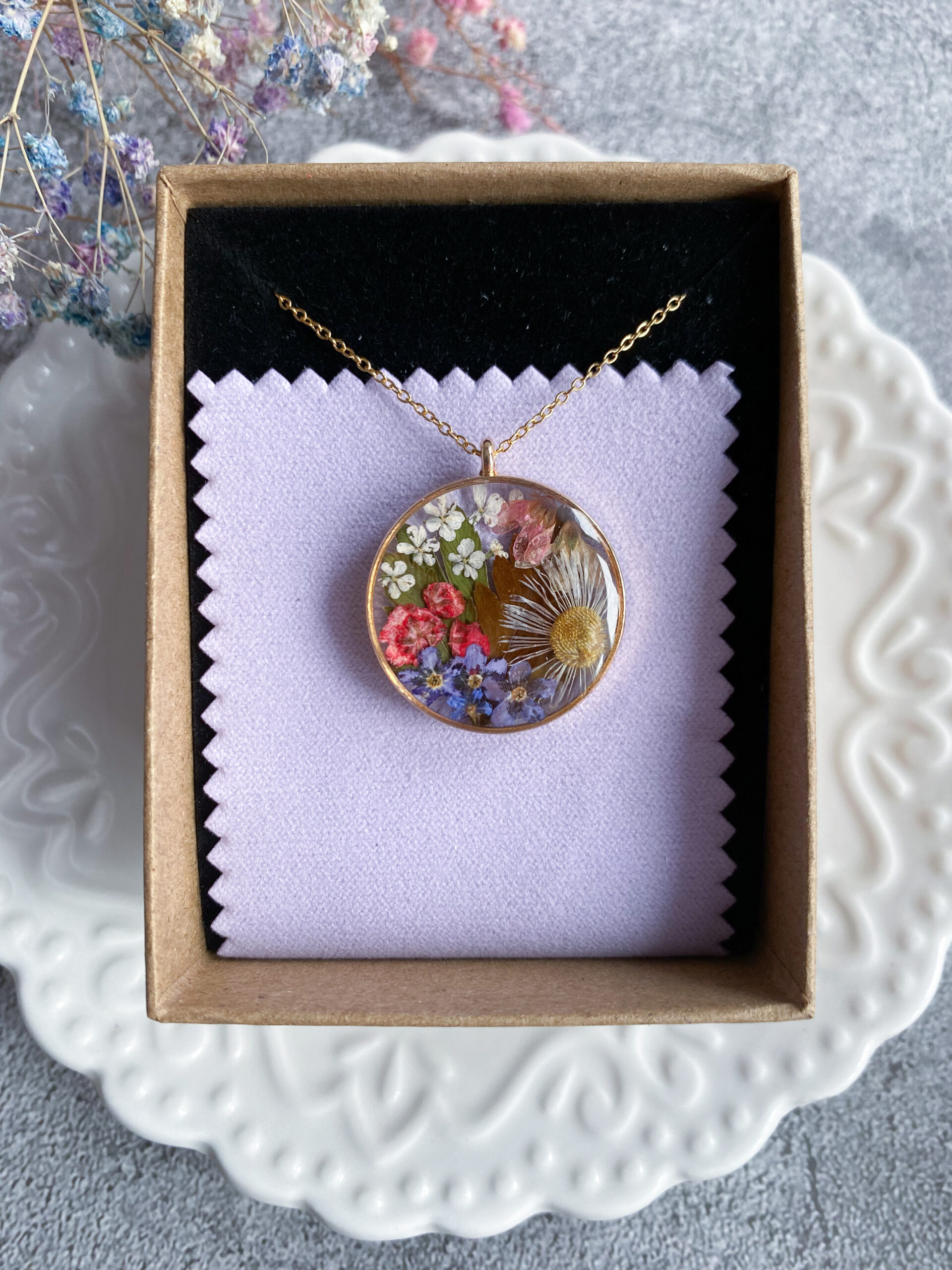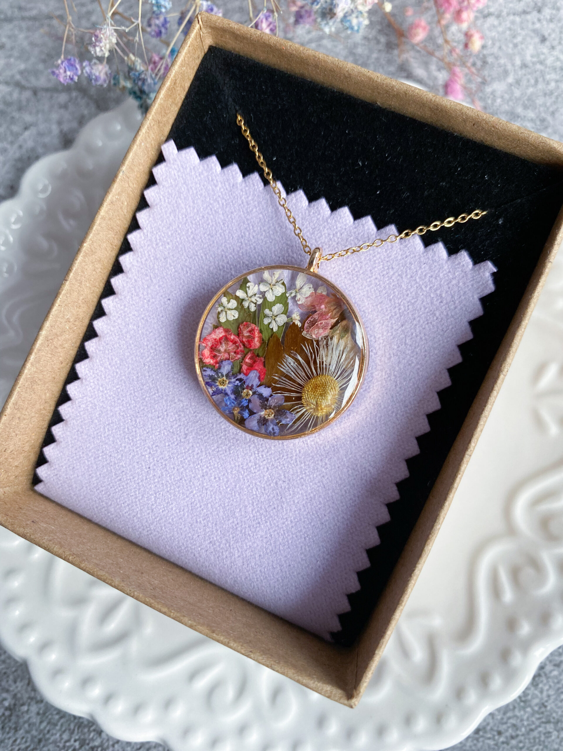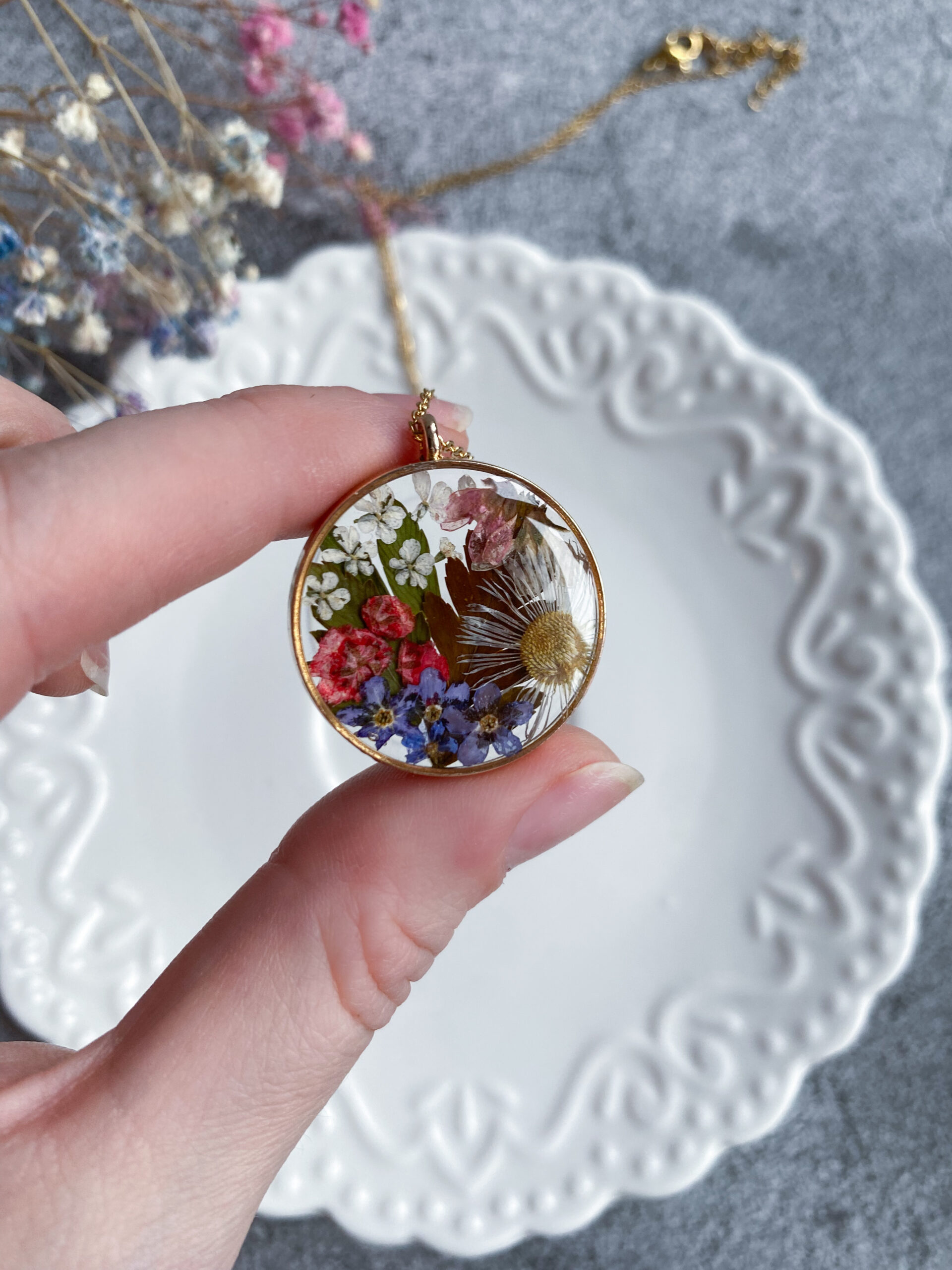 Opis: Ręcznie wykonana okrągła zawieszka z polnymi kwiatami.