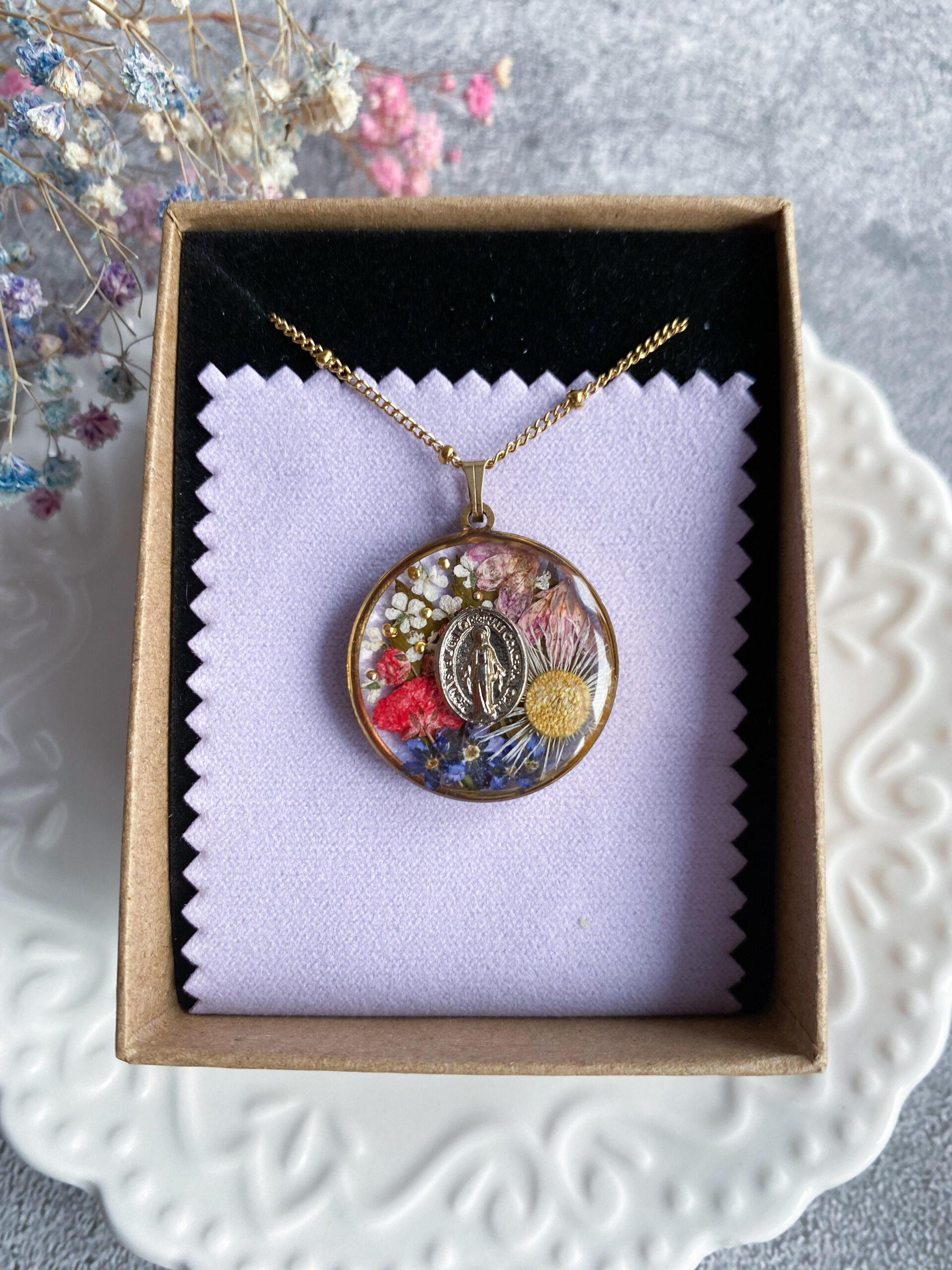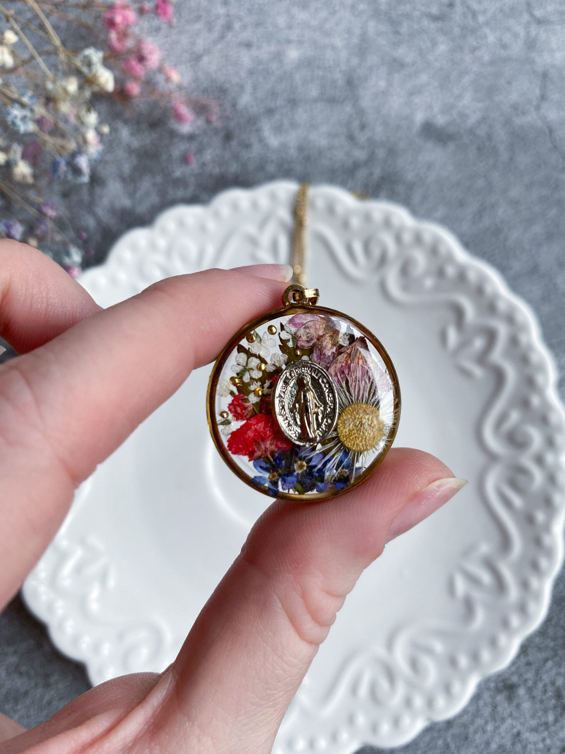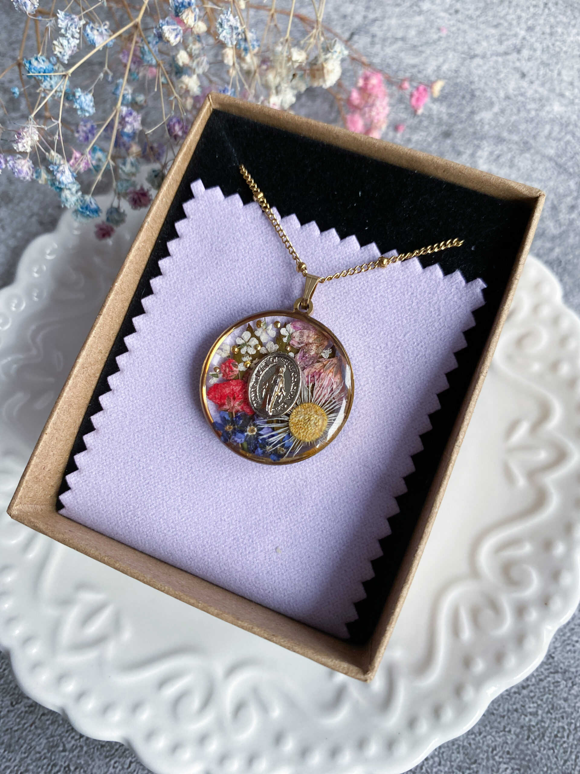 Opis: Ręcznie wykonana okrągła zawieszka z medalikiem Matki Bożej. W biżuterii zatopione zostały różnokolorowe kwiaty łąkowe i złote kuleczki.