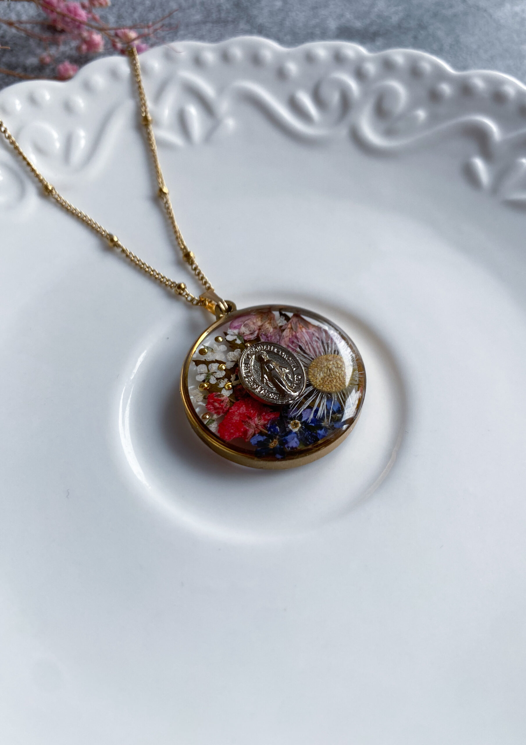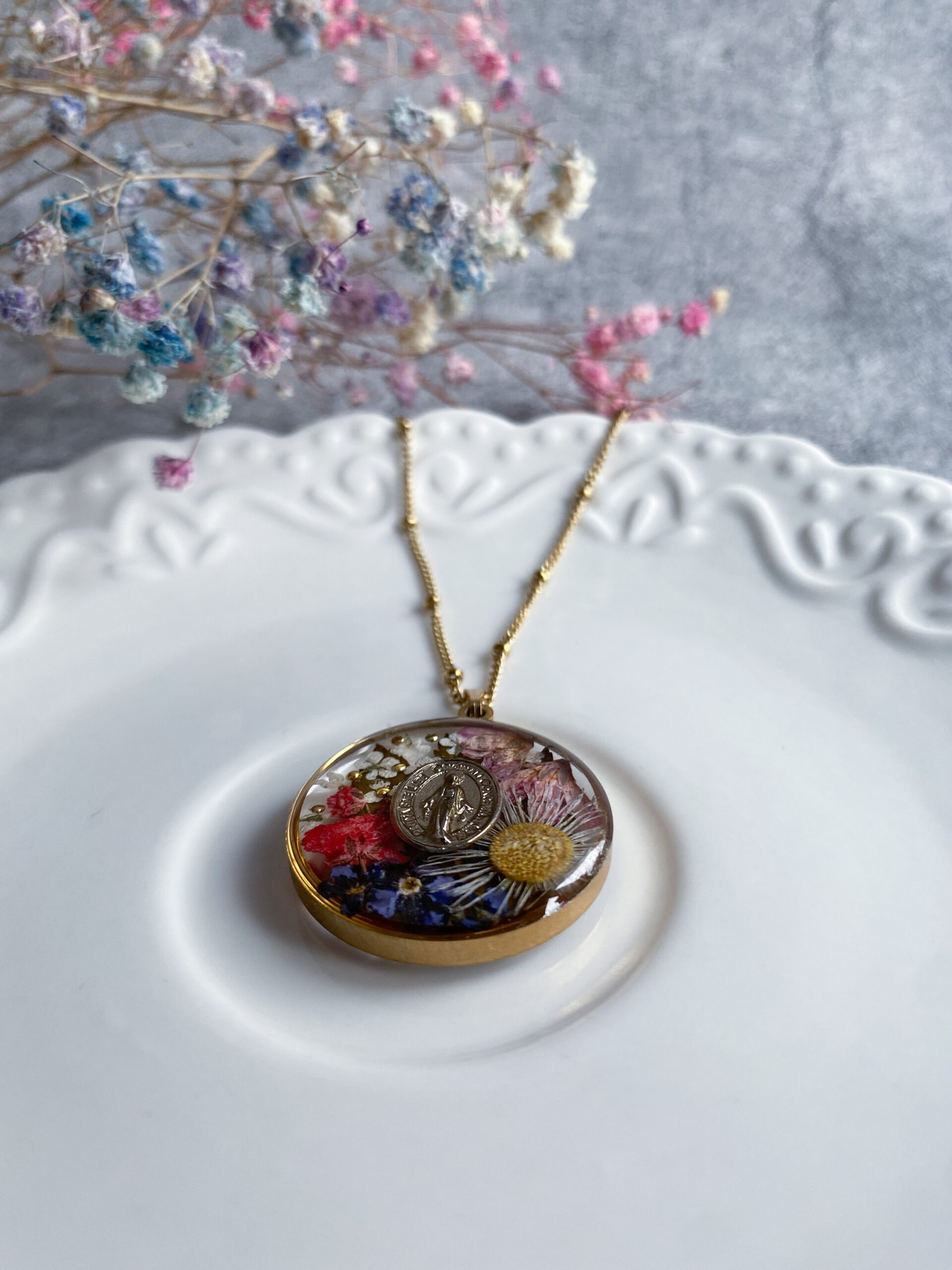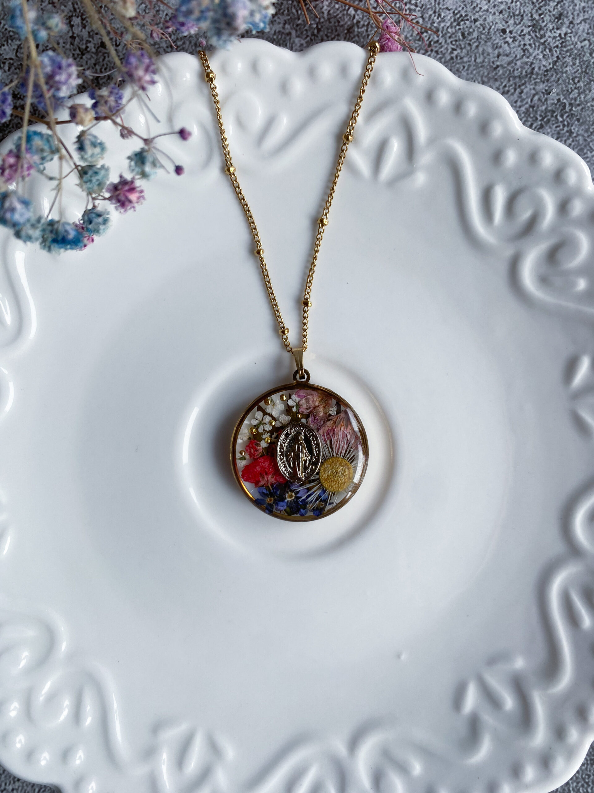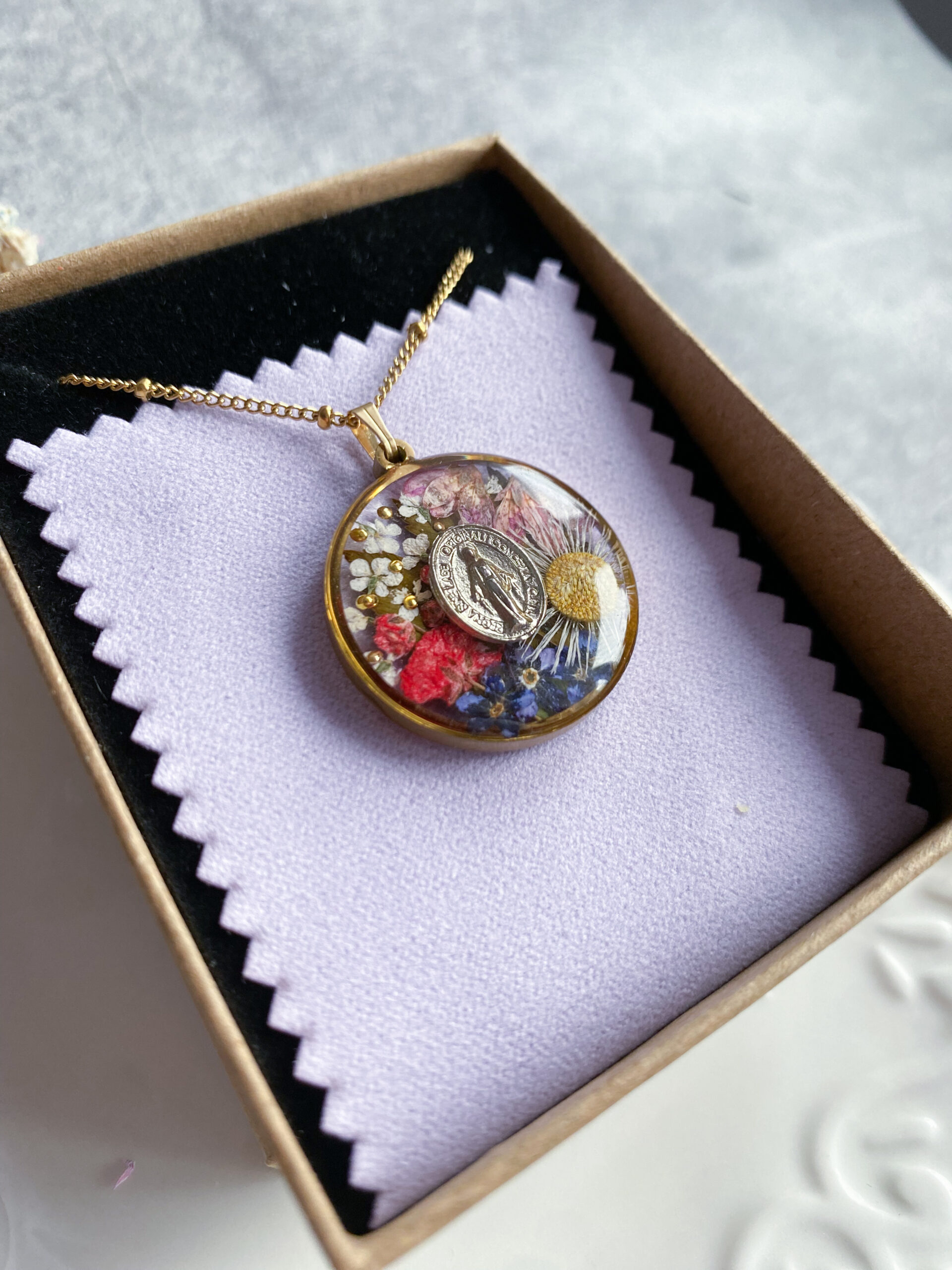 Opis: Ręcznie wykonana okrągła zawieszka z medalikiem Matki Bożej. W biżuterii zatopione zostały różnokolorowe kwiaty łąkowe i złote kuleczki.