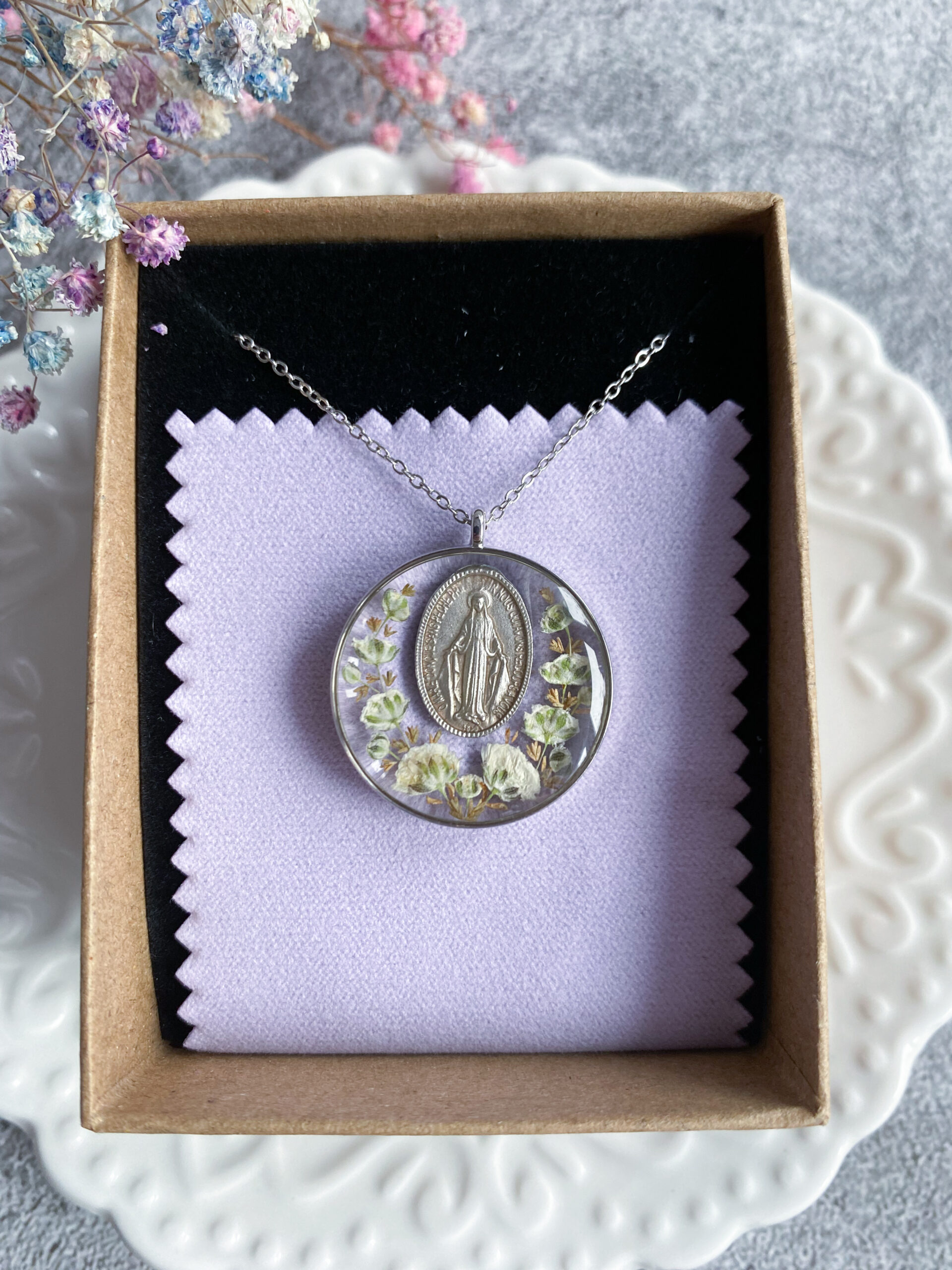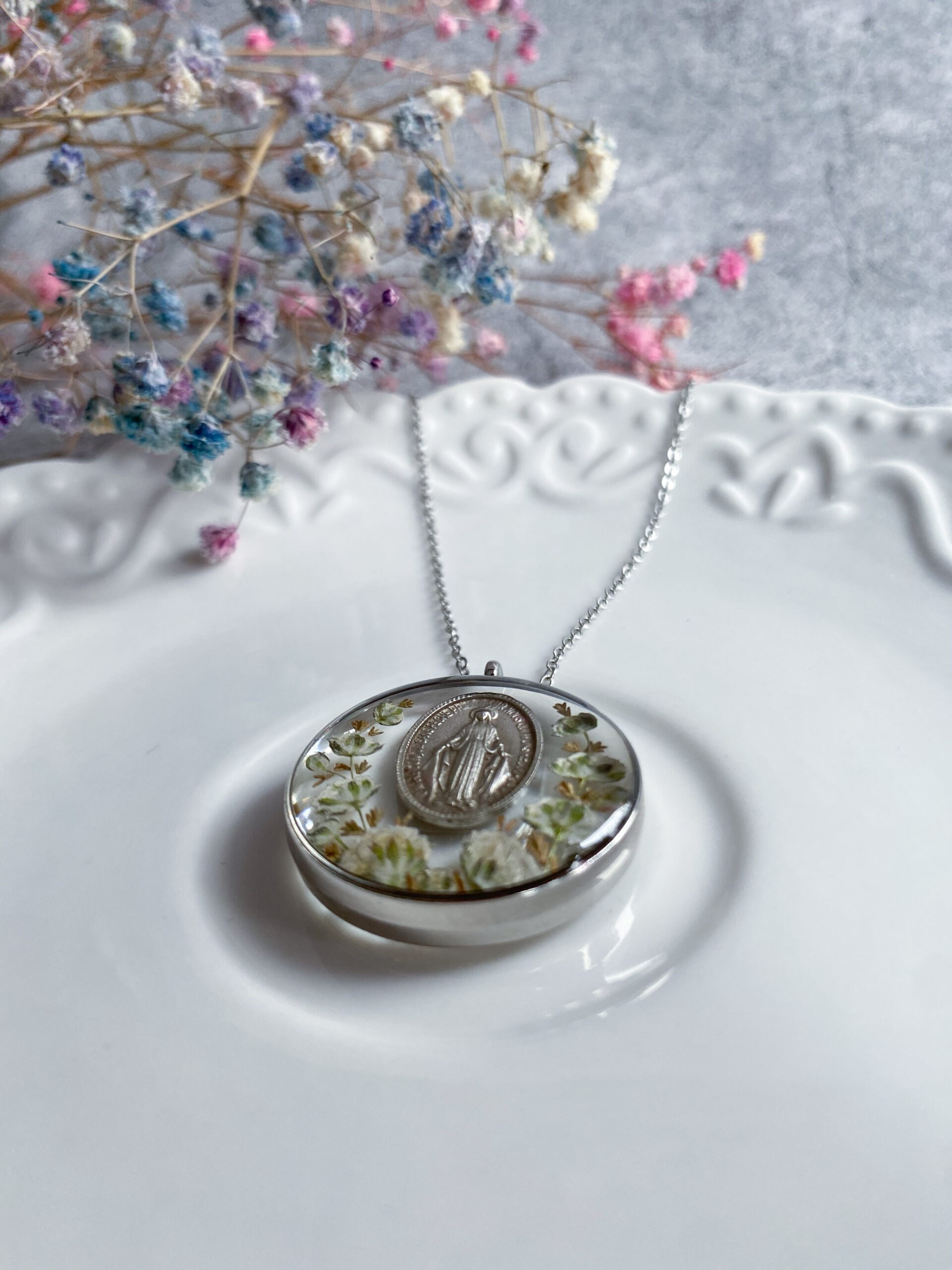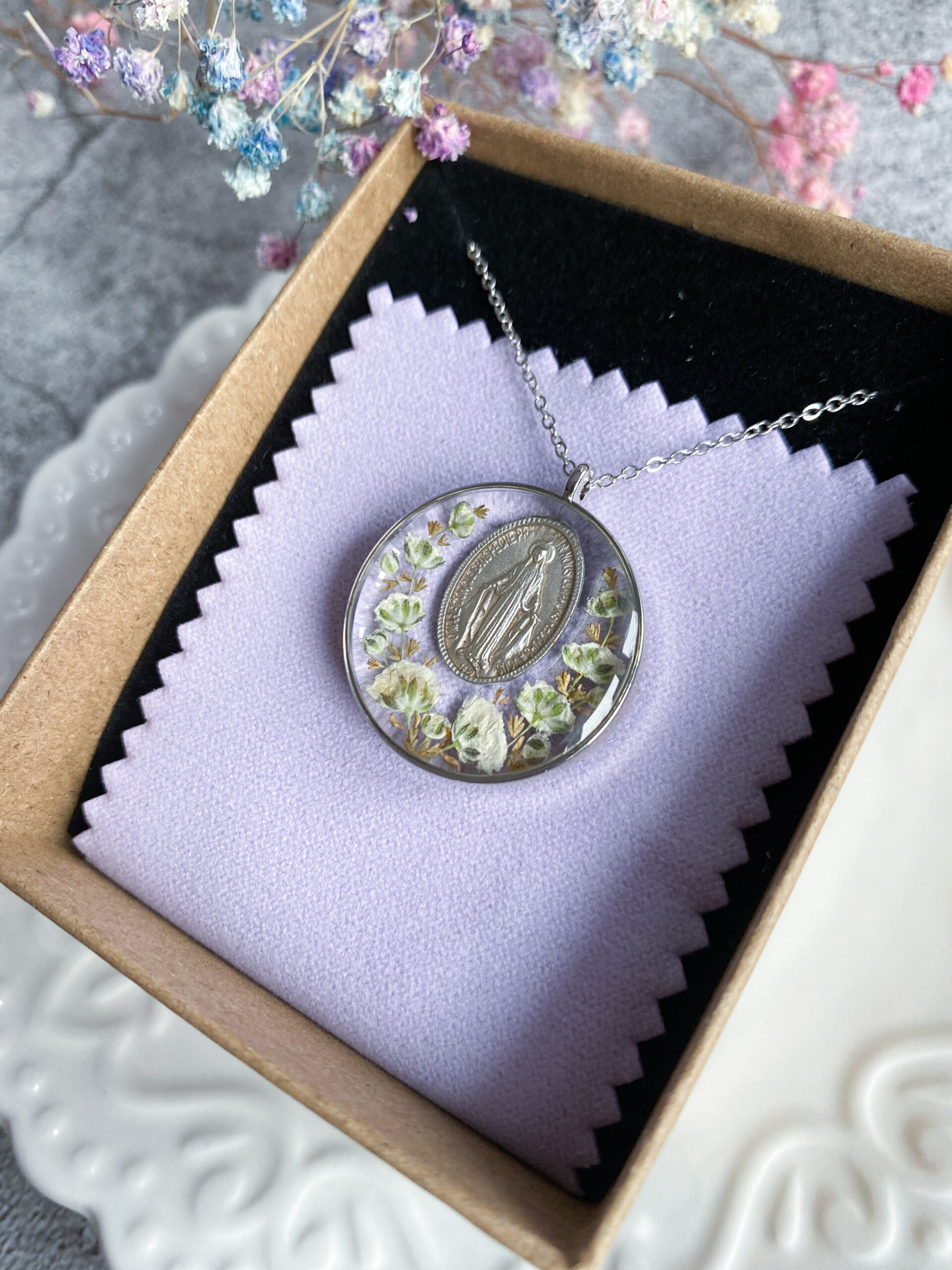 Opis: Ręcznie wykonana okrągła zawieszka z medalikiem Matki Bożej. W biżuterii zatopione zostały kwiaty białej gipsówki i gałązki brązowego wrzosu.