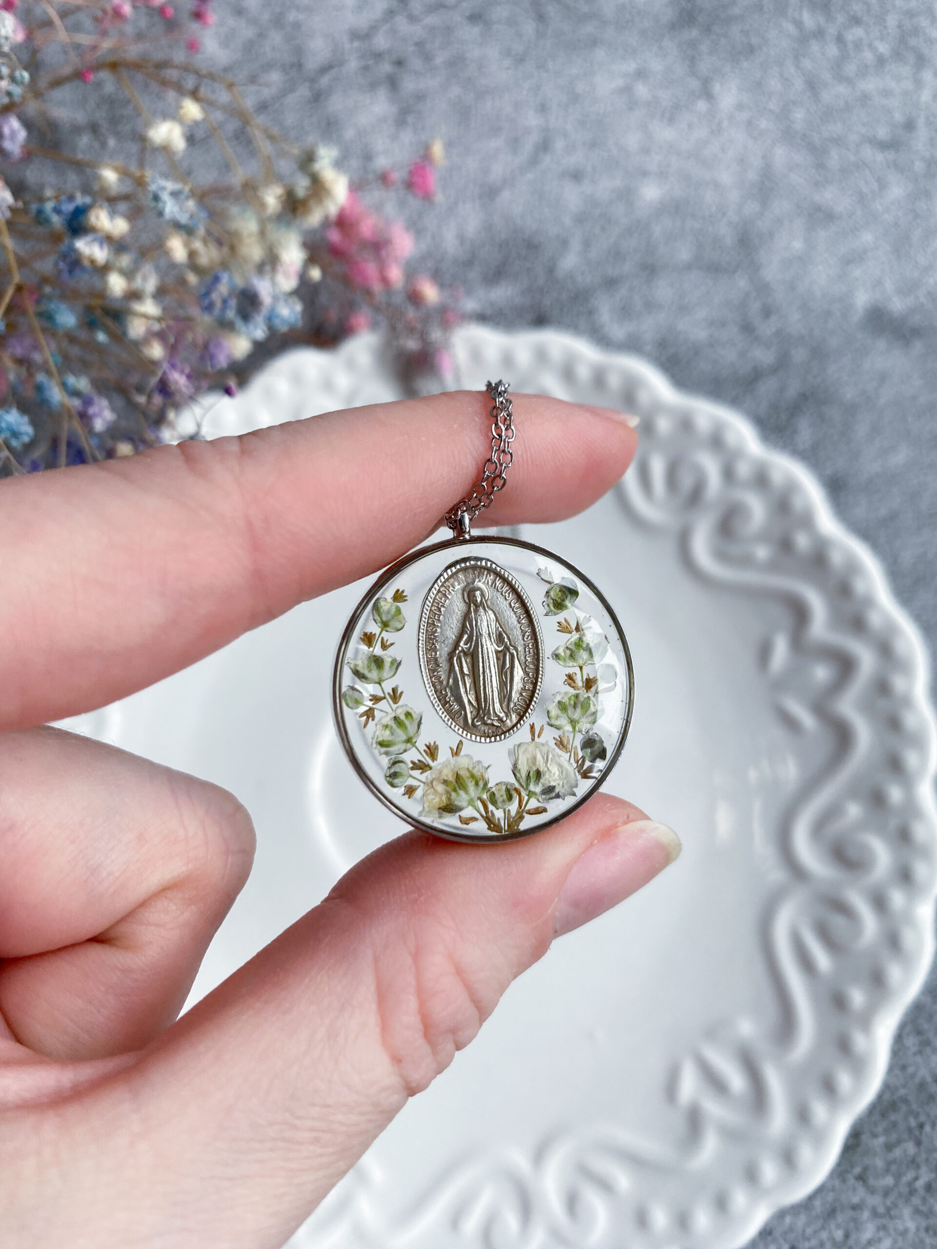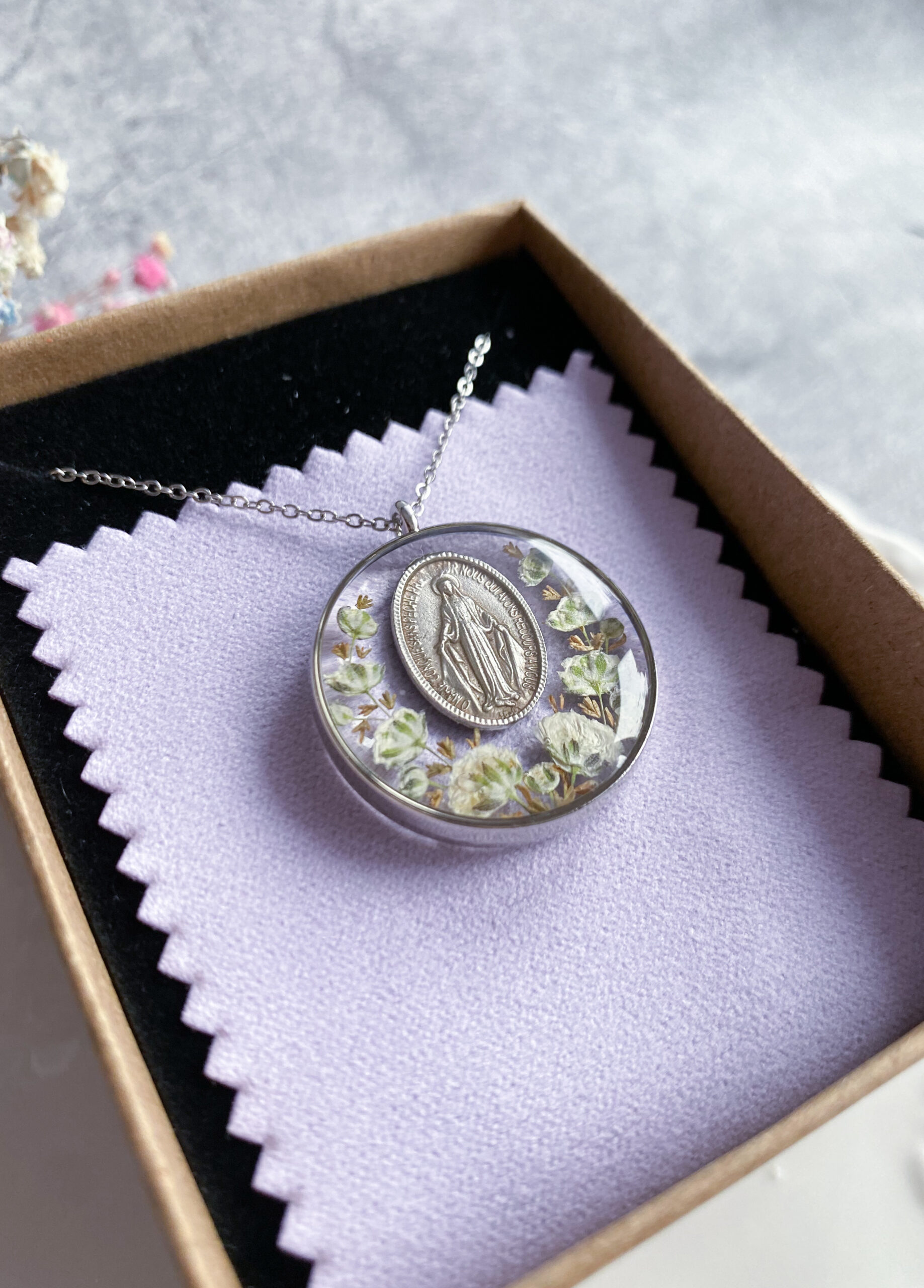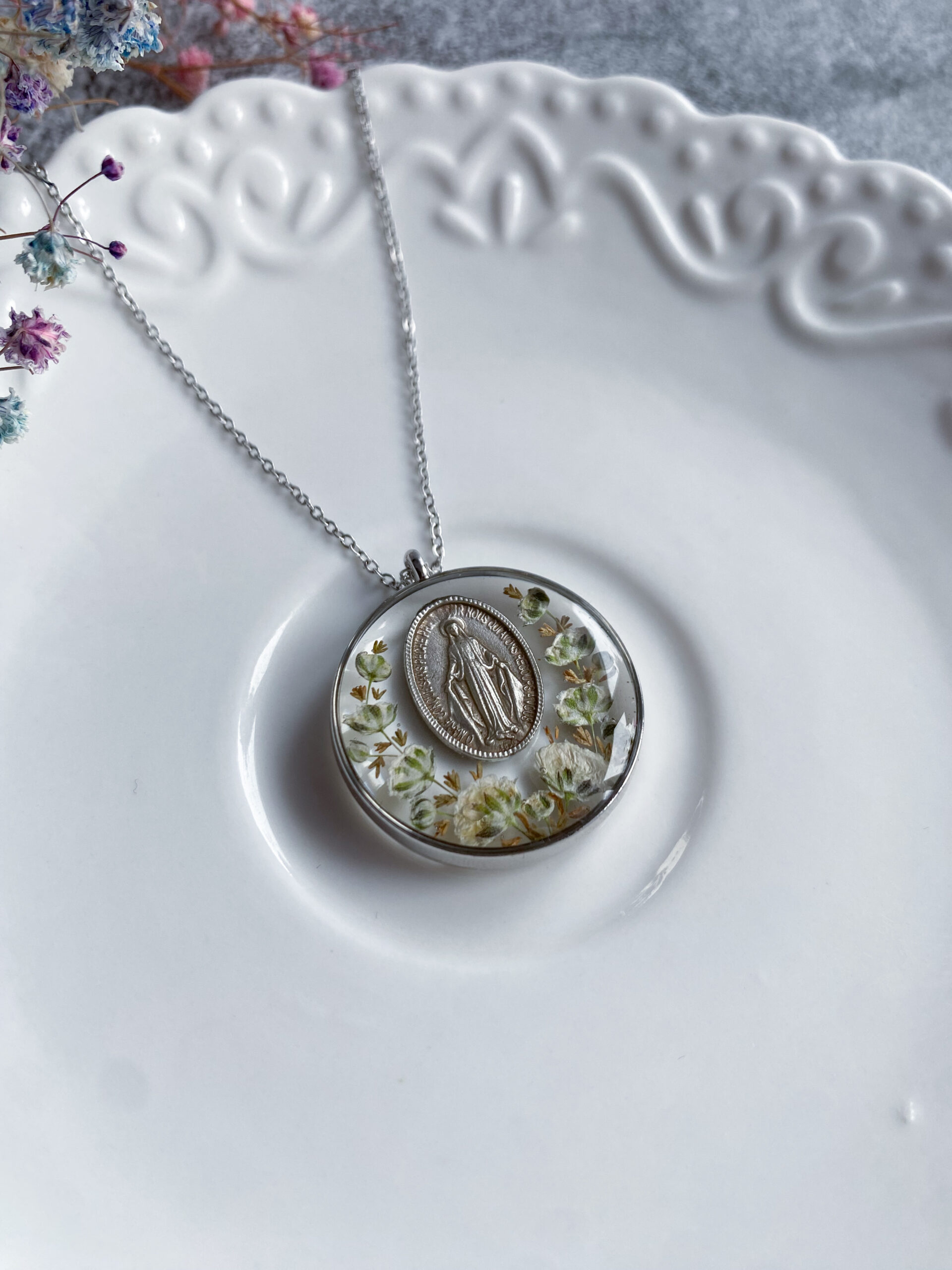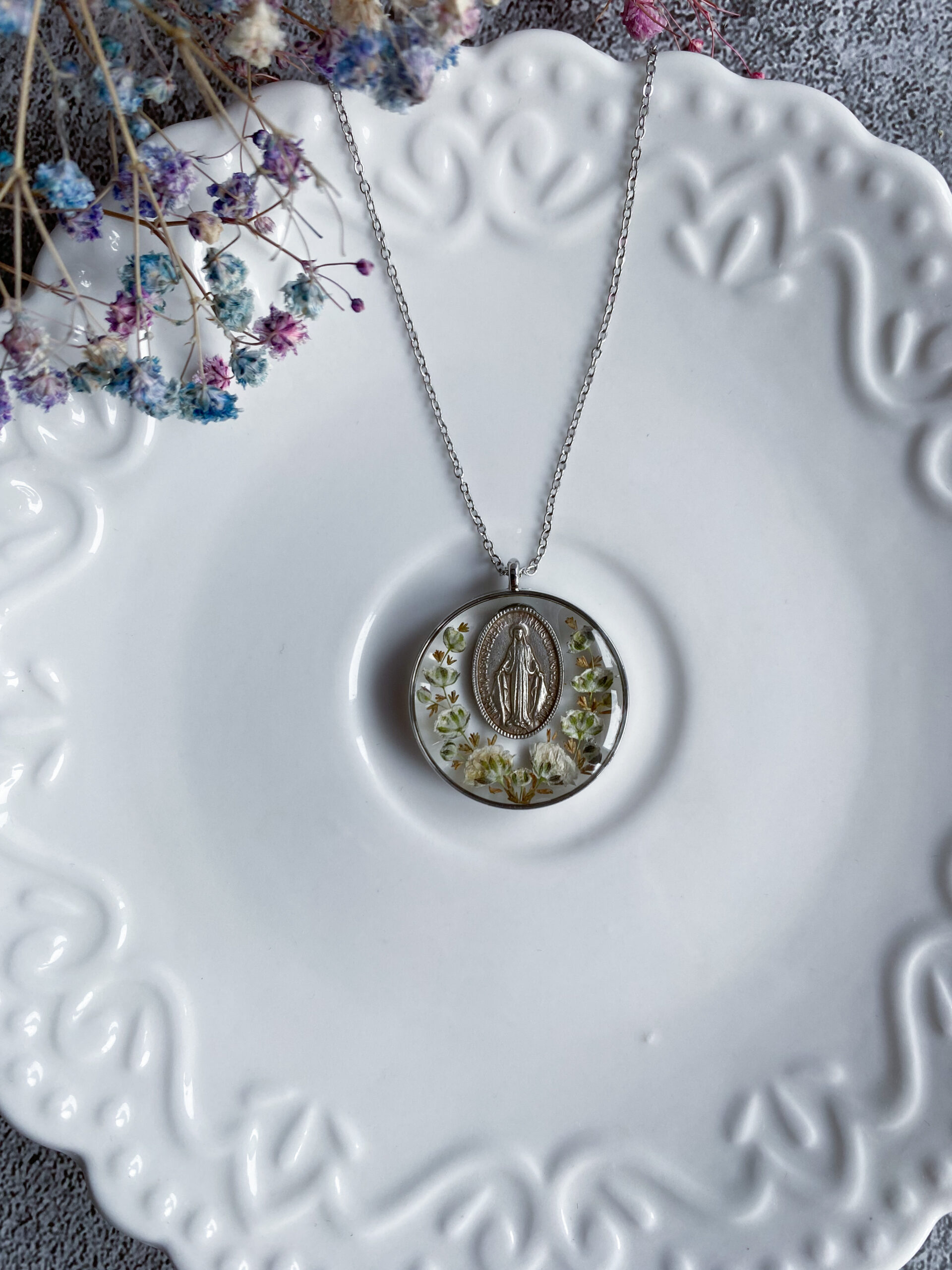 Opis: Ręcznie wykonana okrągła zawieszka z medalikiem Matki Bożej. W biżuterii zatopione zostały kwiaty białej gipsówki i gałązki brązowego wrzosu.
