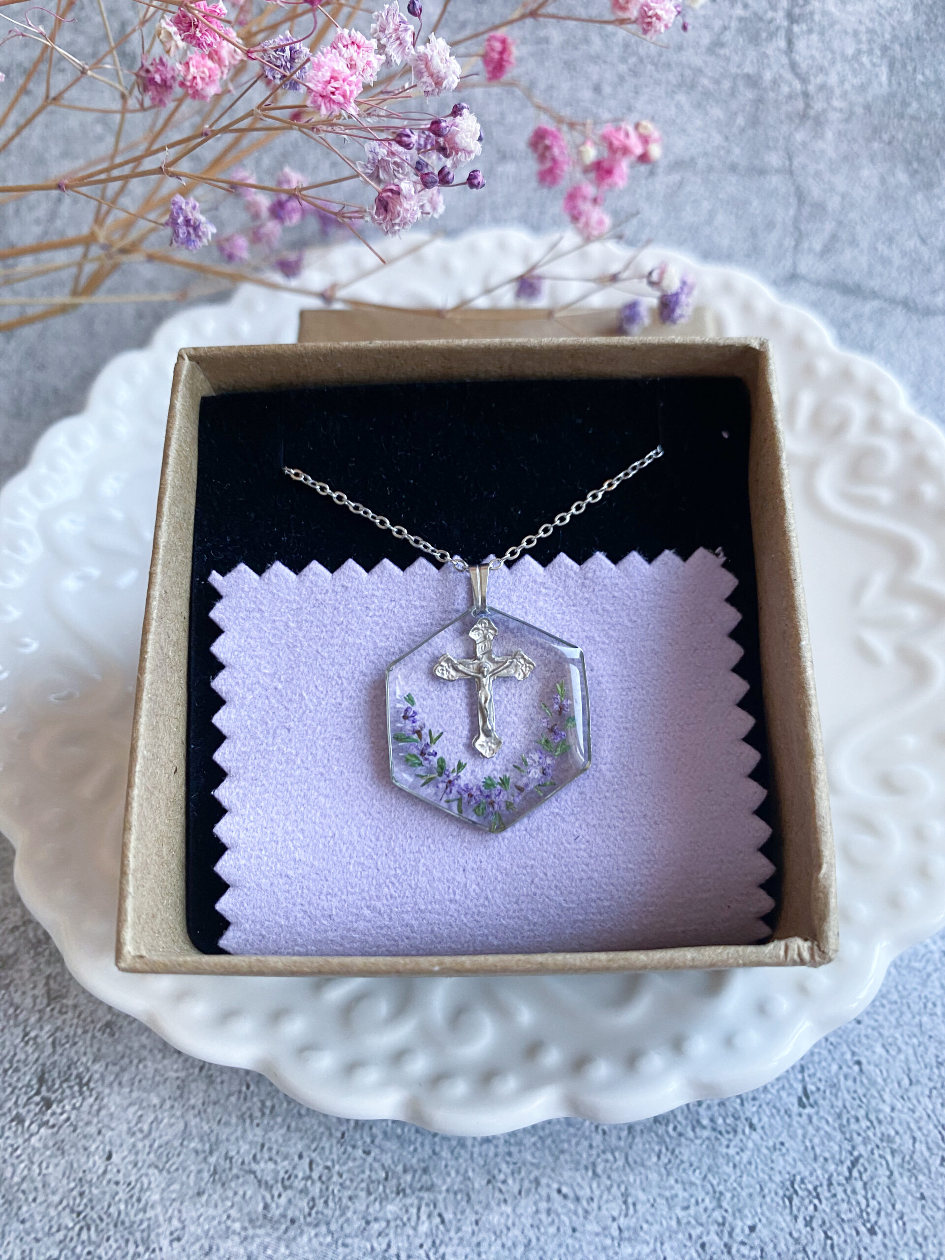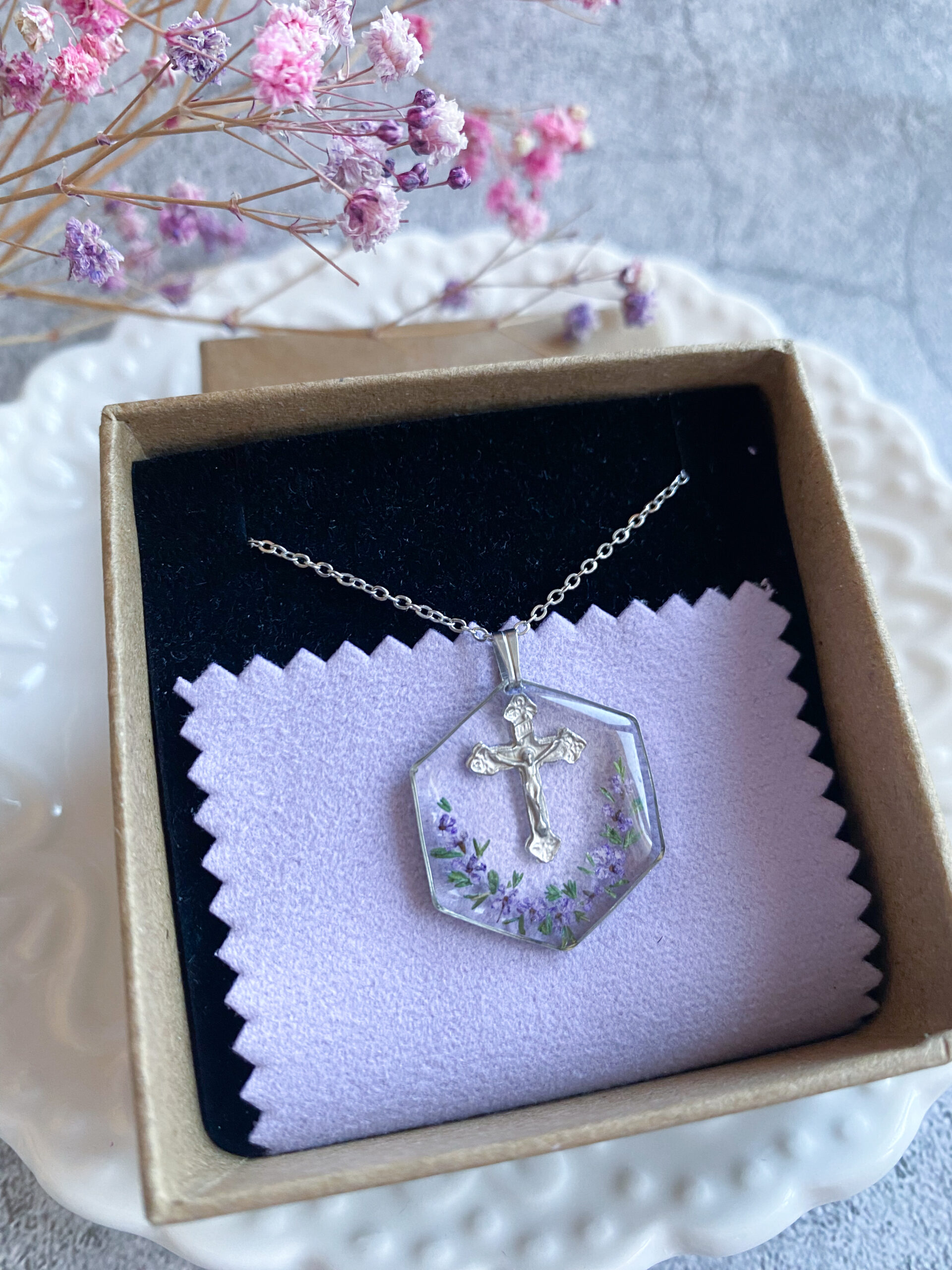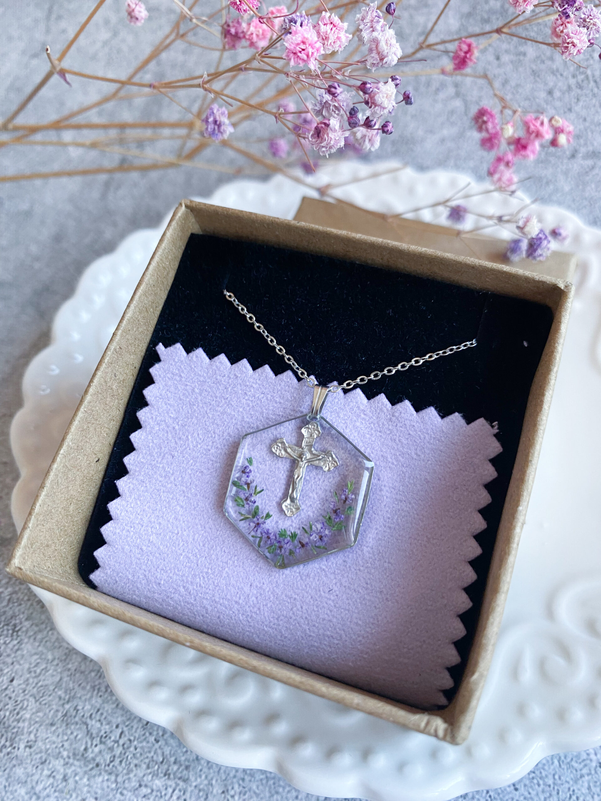 Opis: Ręcznie wykonana zawieszka w kształcie sześcianu z krzyżykiem. W biżuterii zatopione zostały kwiaty fioletowej marchwii.