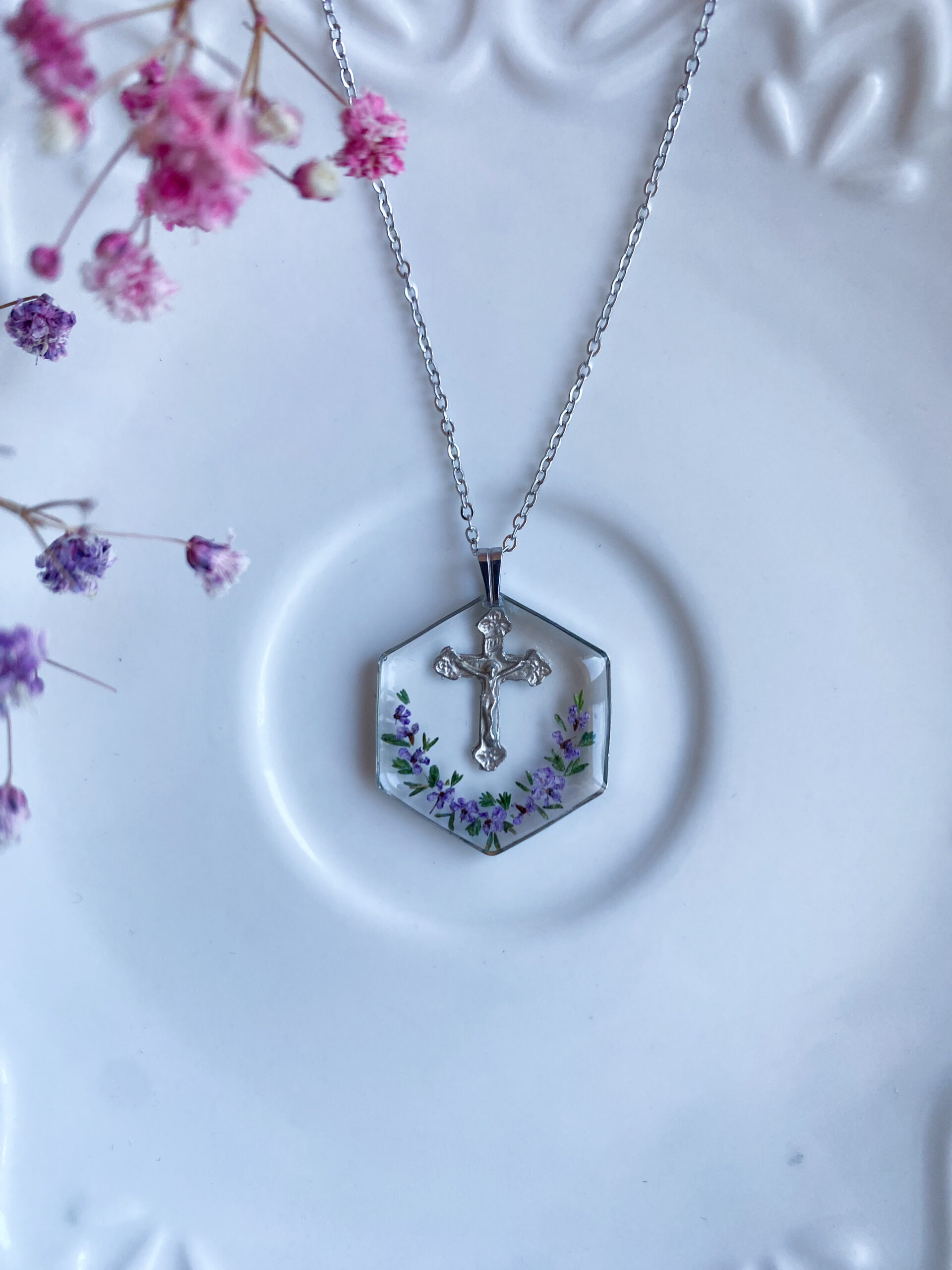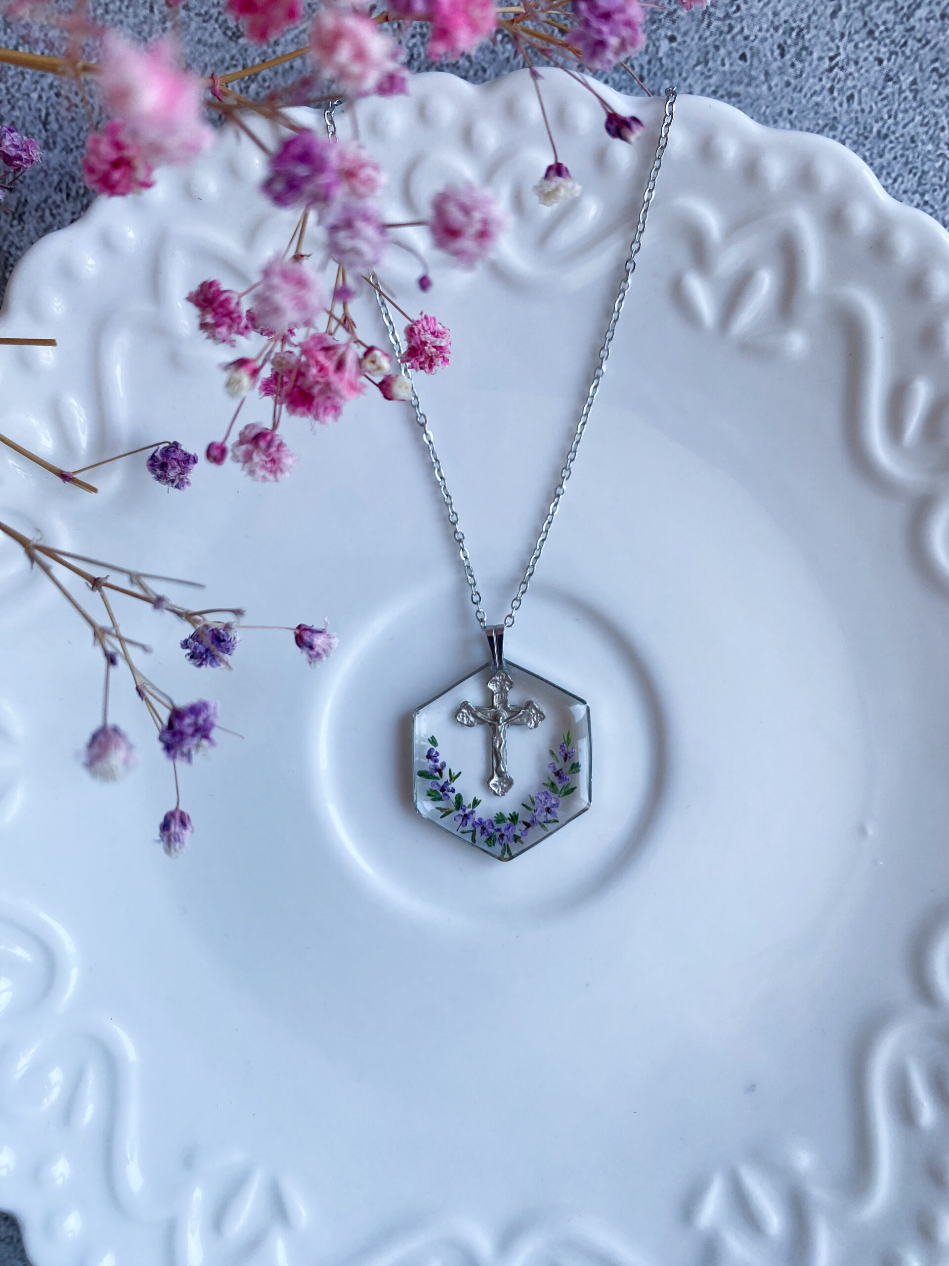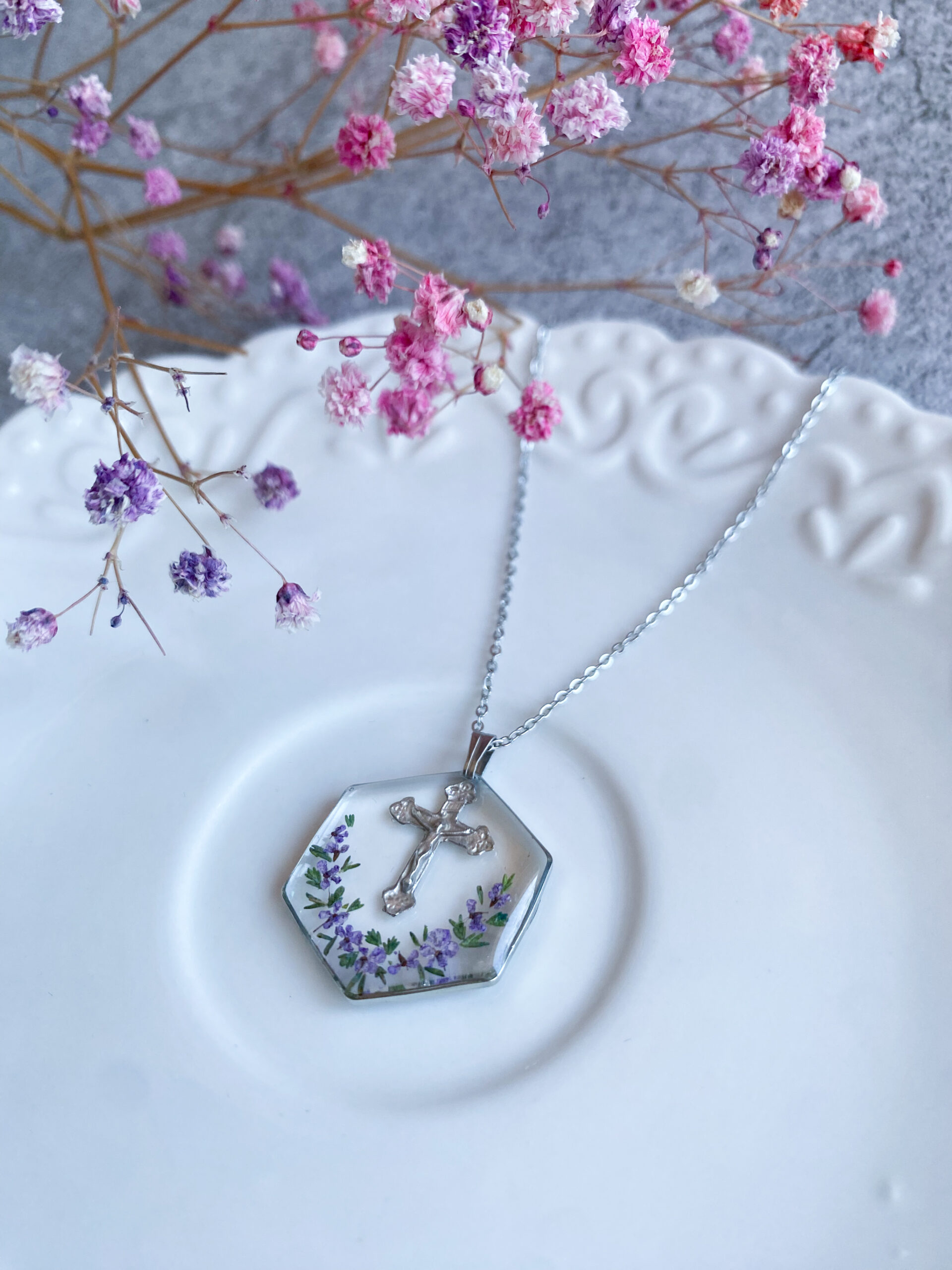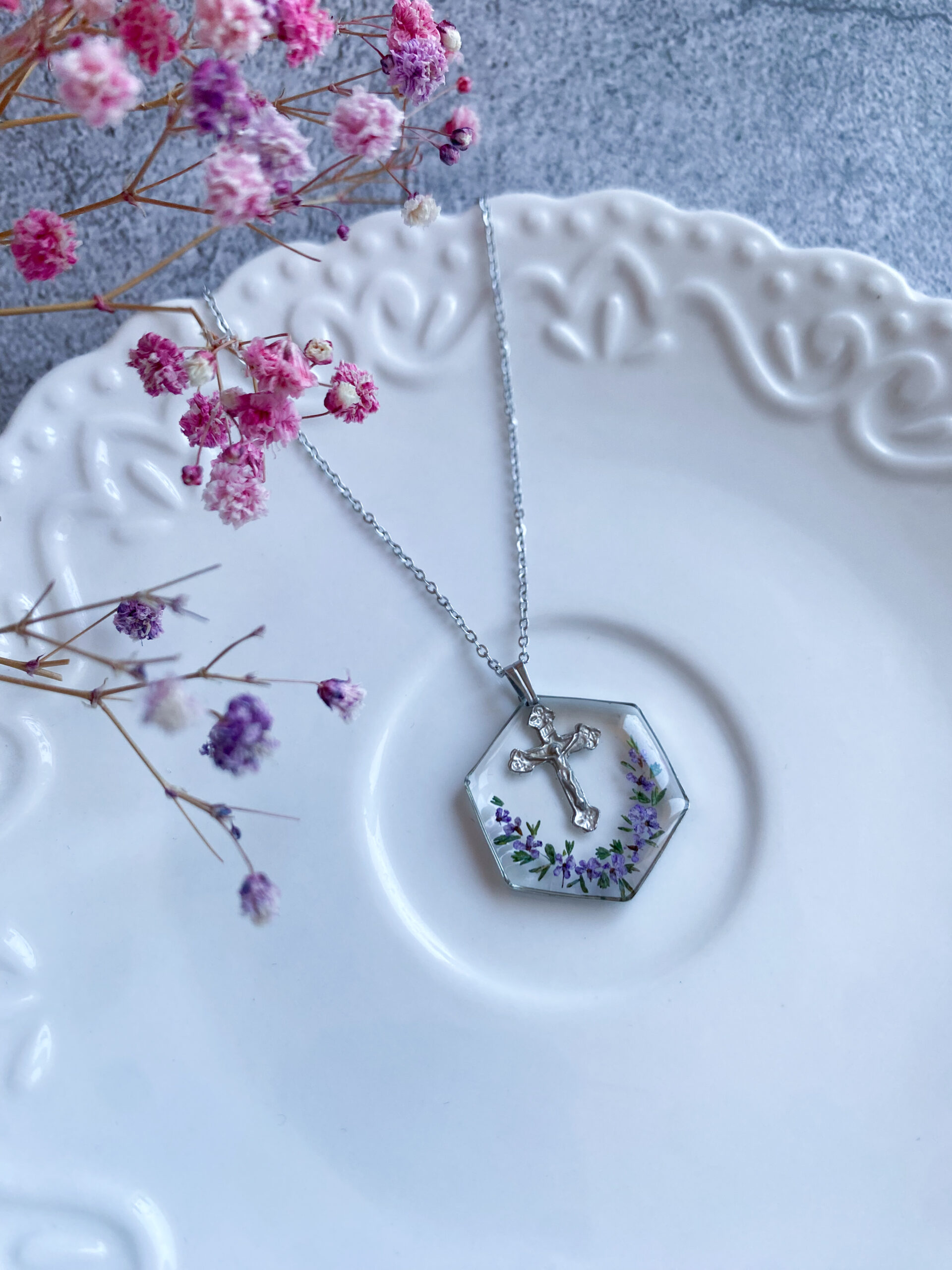 Opis: Ręcznie wykonana zawieszka w kształcie sześcianu z krzyżykiem. W biżuterii zatopione zostały kwiaty fioletowej marchwii.