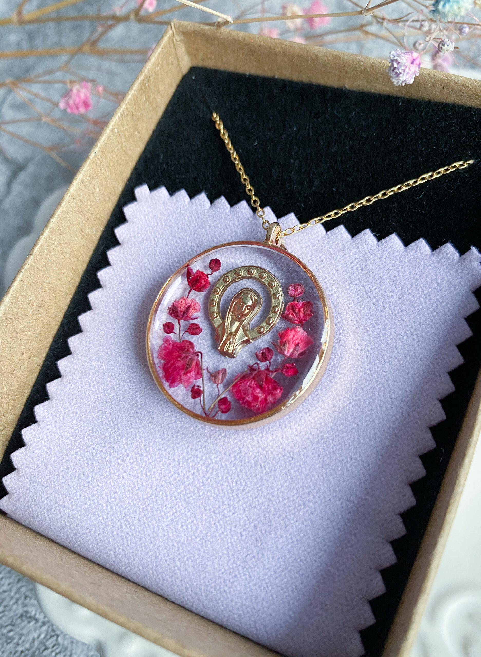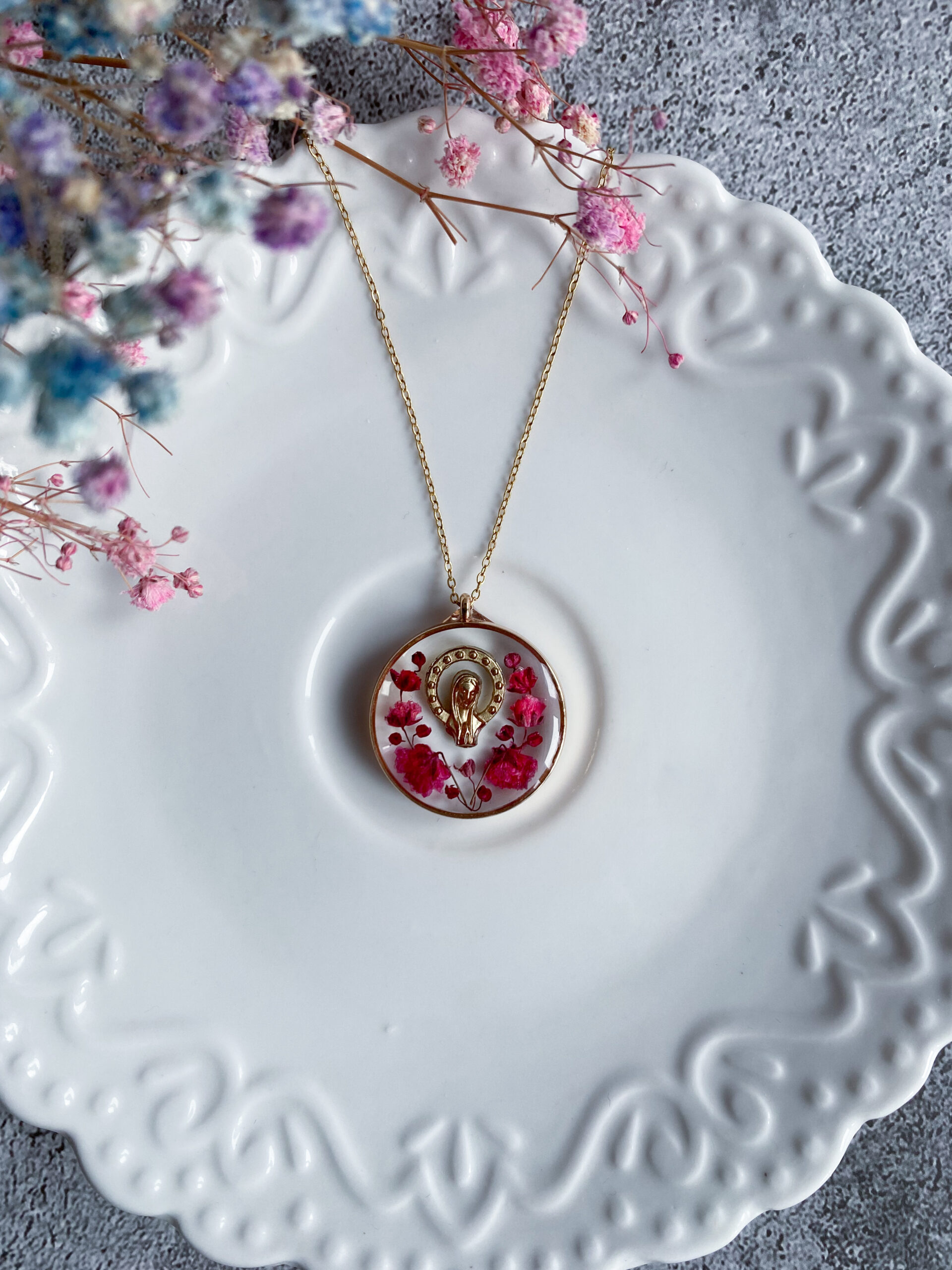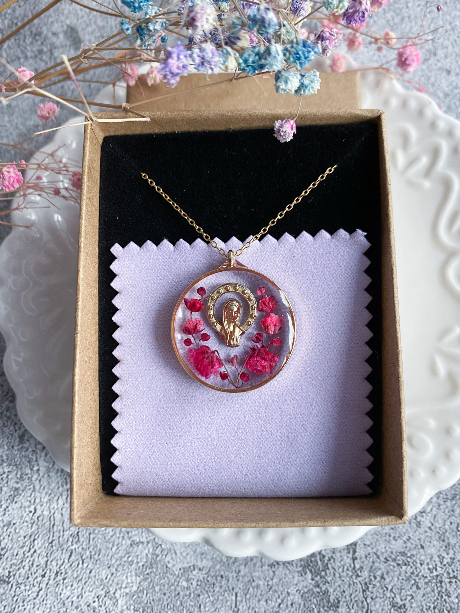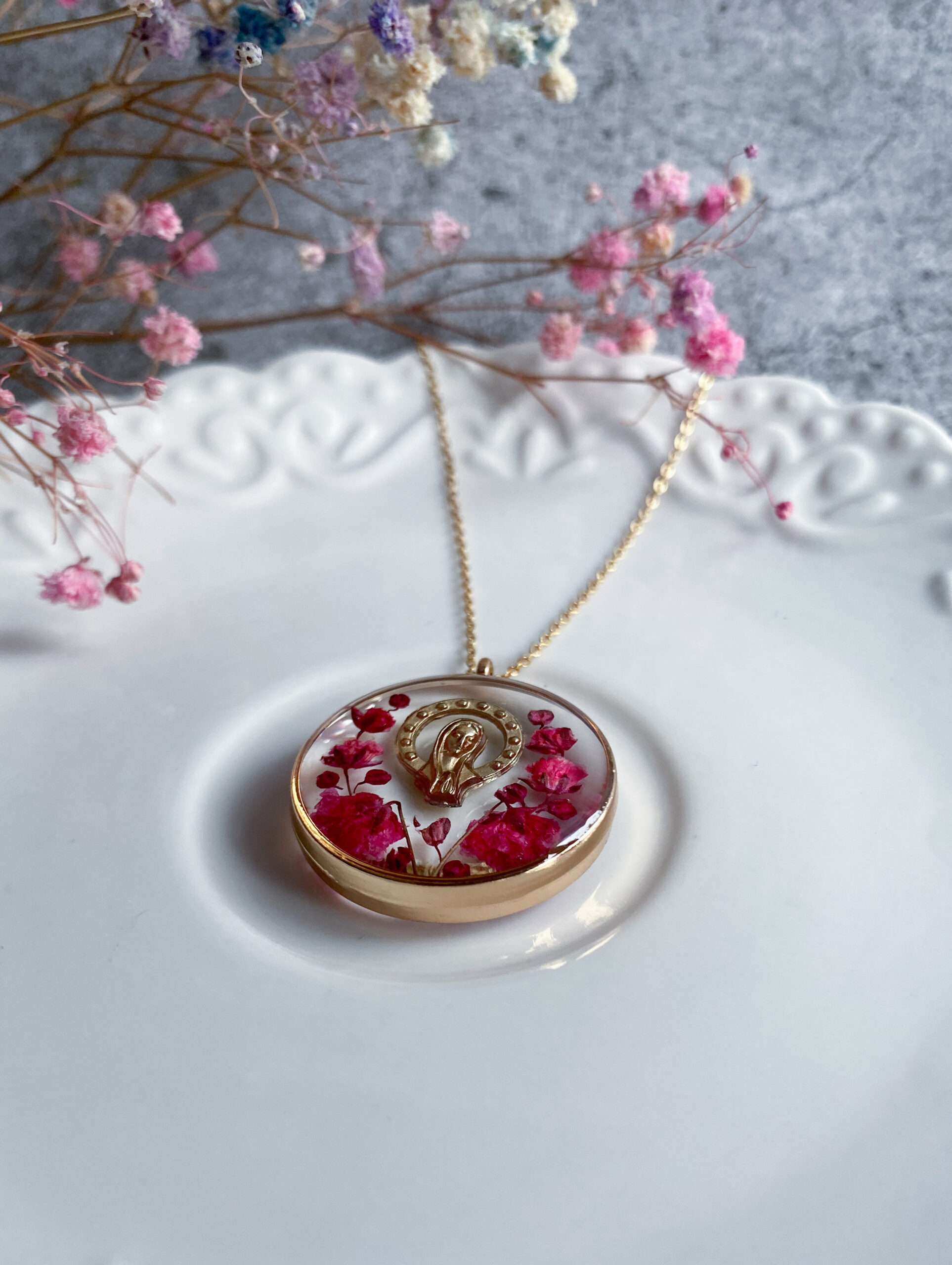 Opis: Ręcznie wykonana okrągła zawieszka z medalikiem Matki Bożej. W biżuterii zatopione zostały kwiaty malinowej gipsówki. Na tylnej warstwie zawieszki jest lekko wylana żywica poza obręb kółka, natomiast nie przeszkadza to w użytkowaniu.