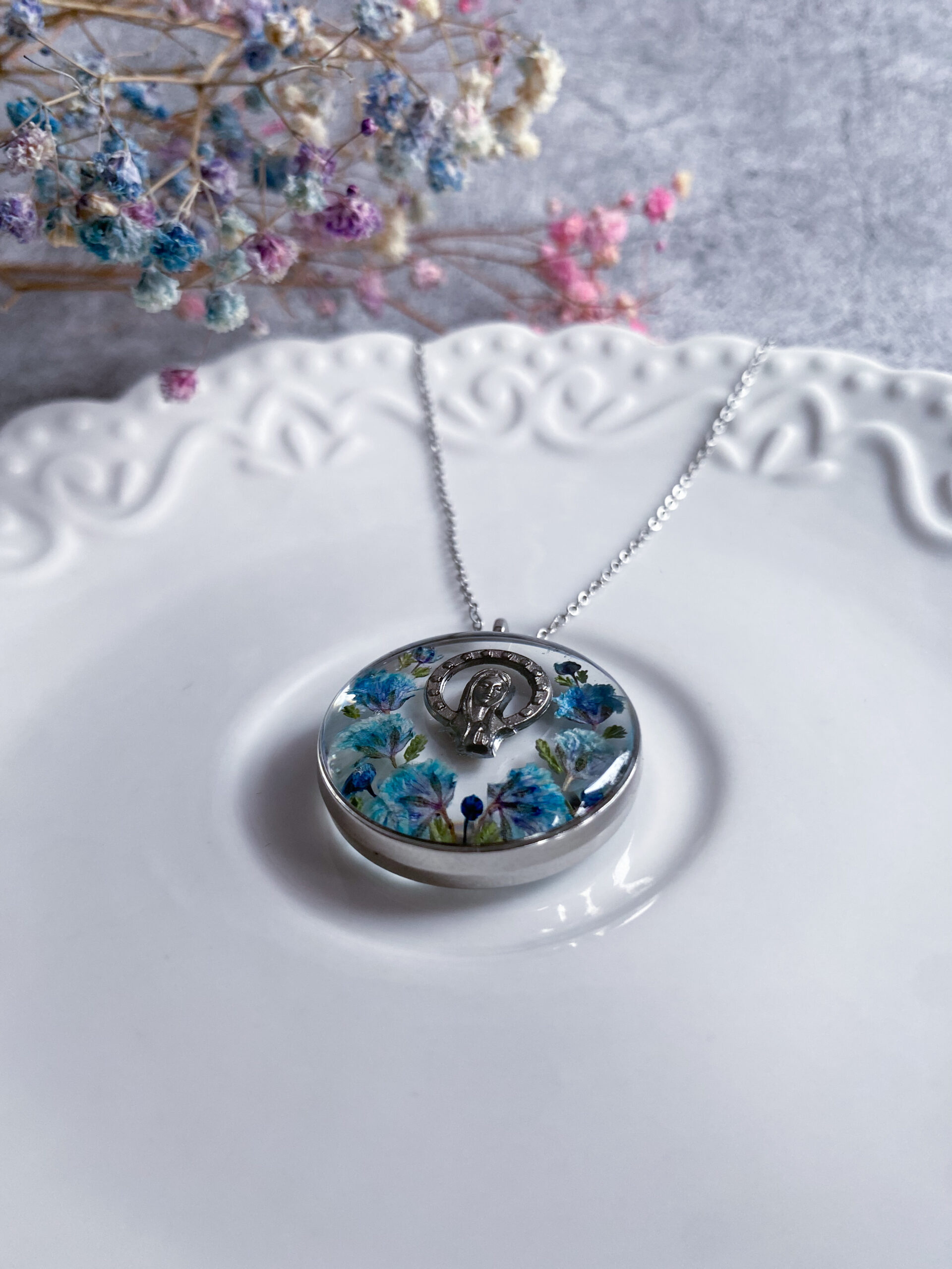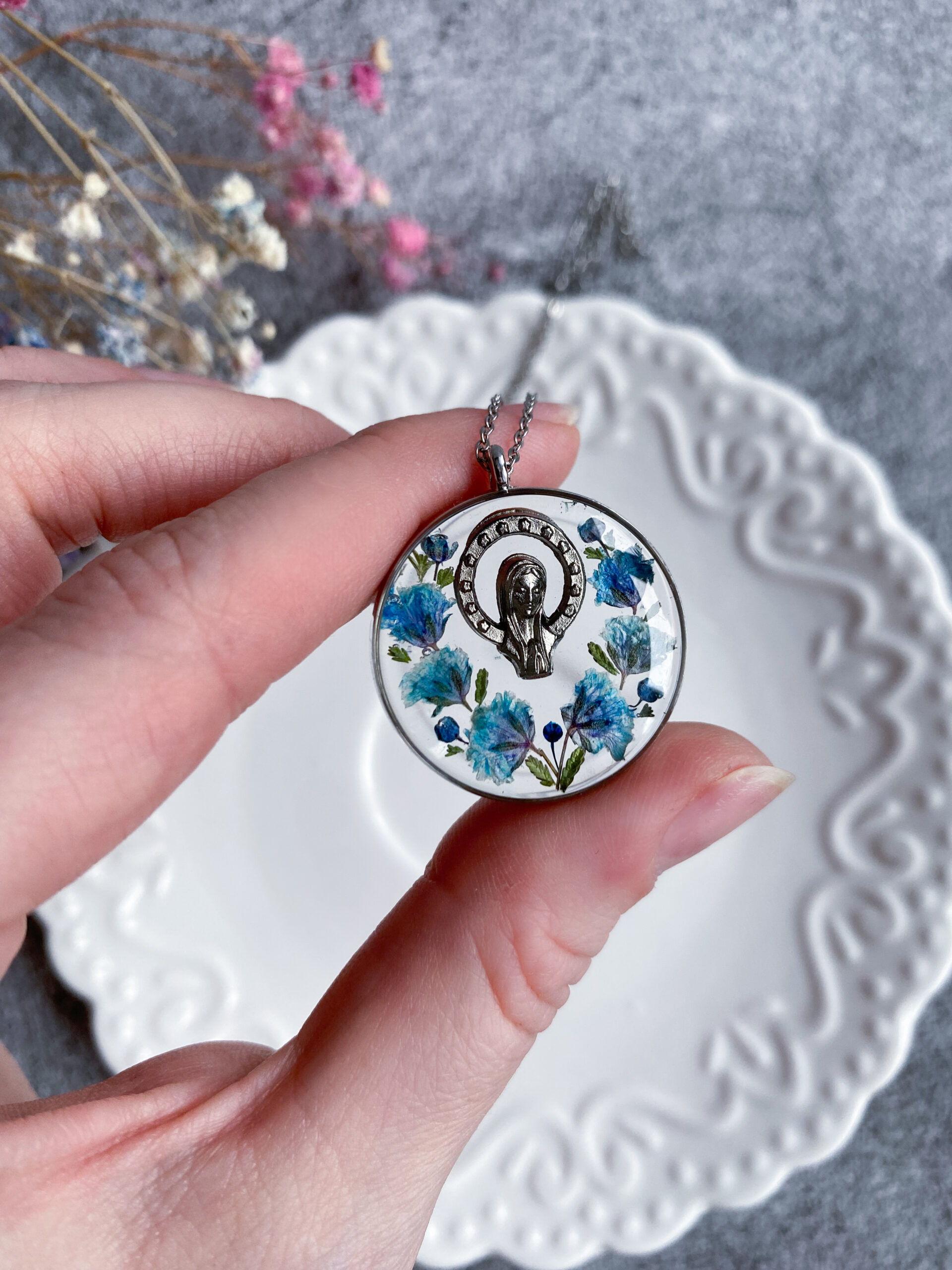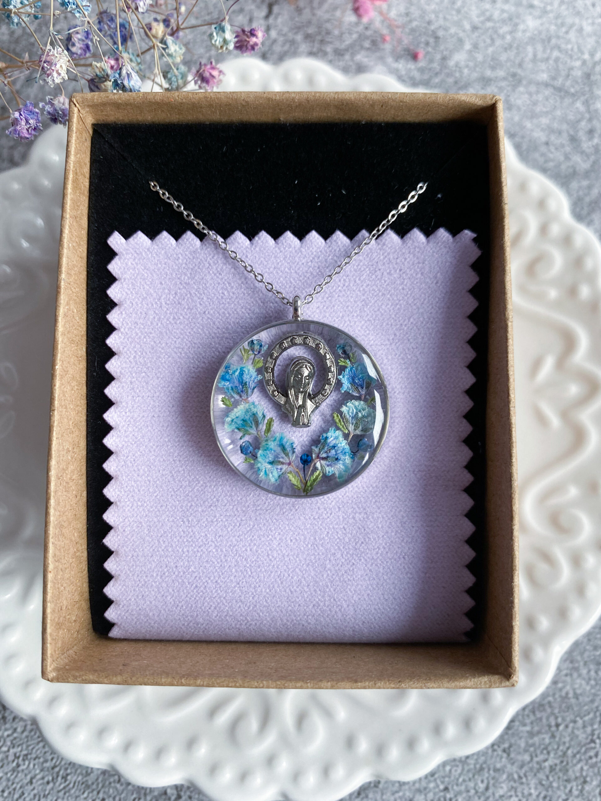 Opis: Ręcznie wykonana okrągła zawieszka z medalikiem Matki Bożej. W biżuterii zatopione zostały kwiaty niebieskiej gipsówki i gałązki zielonego wrzosu.
