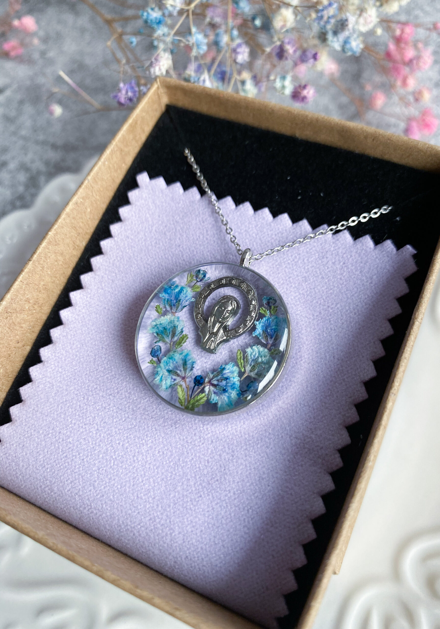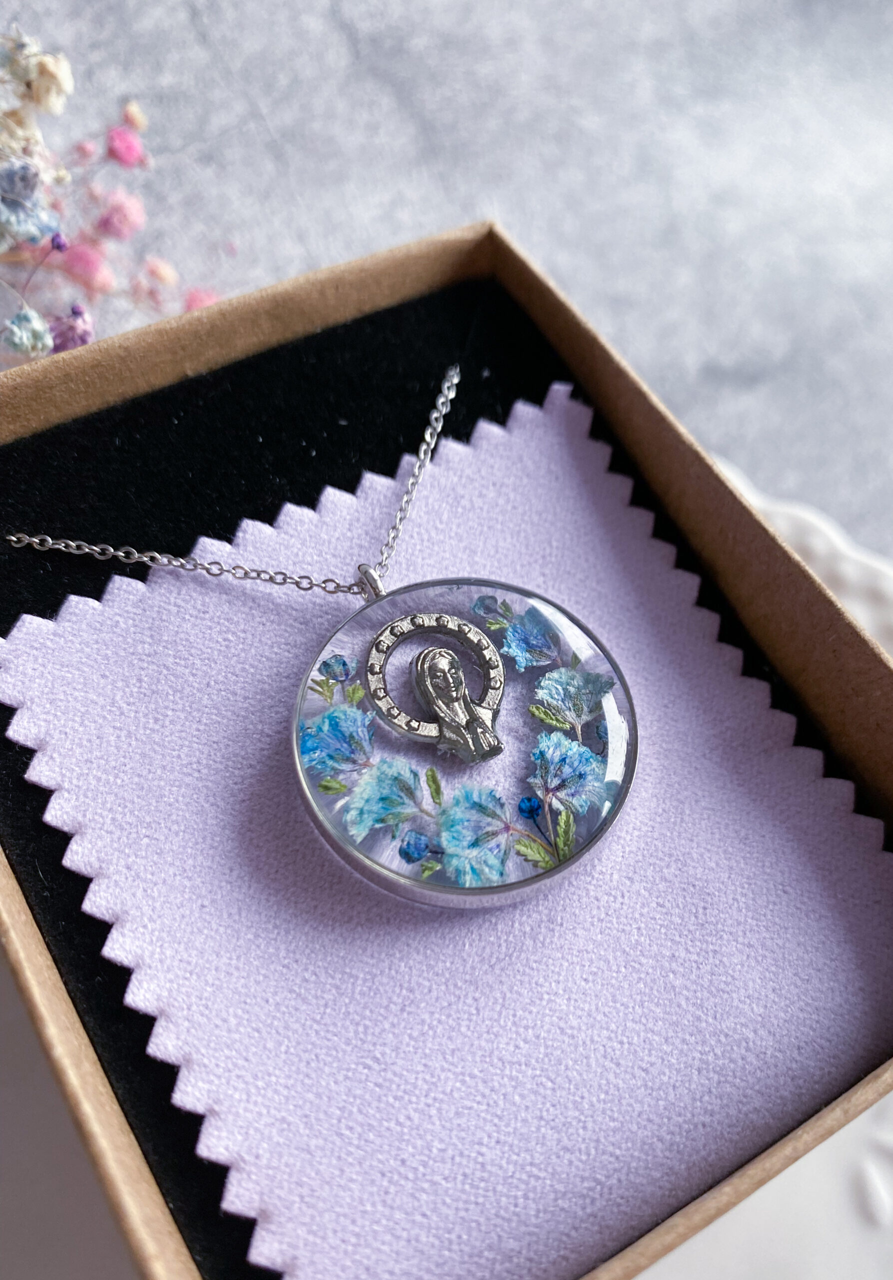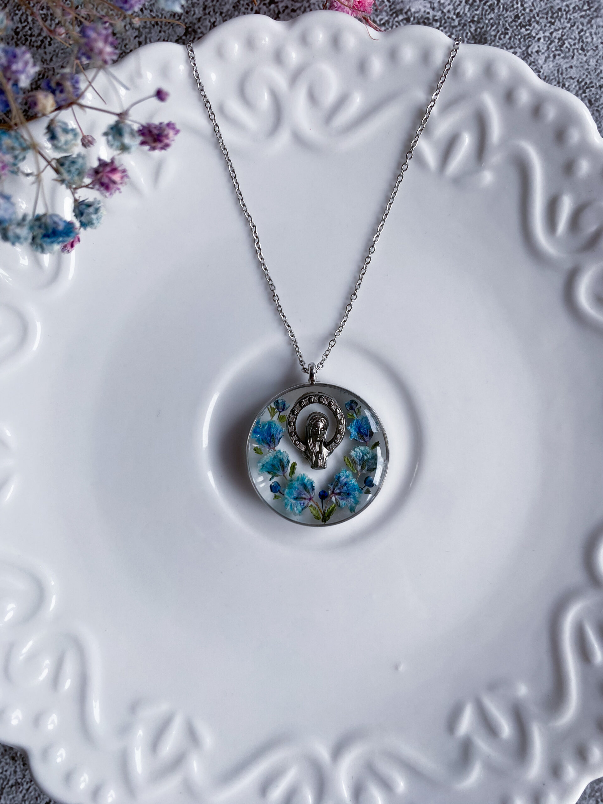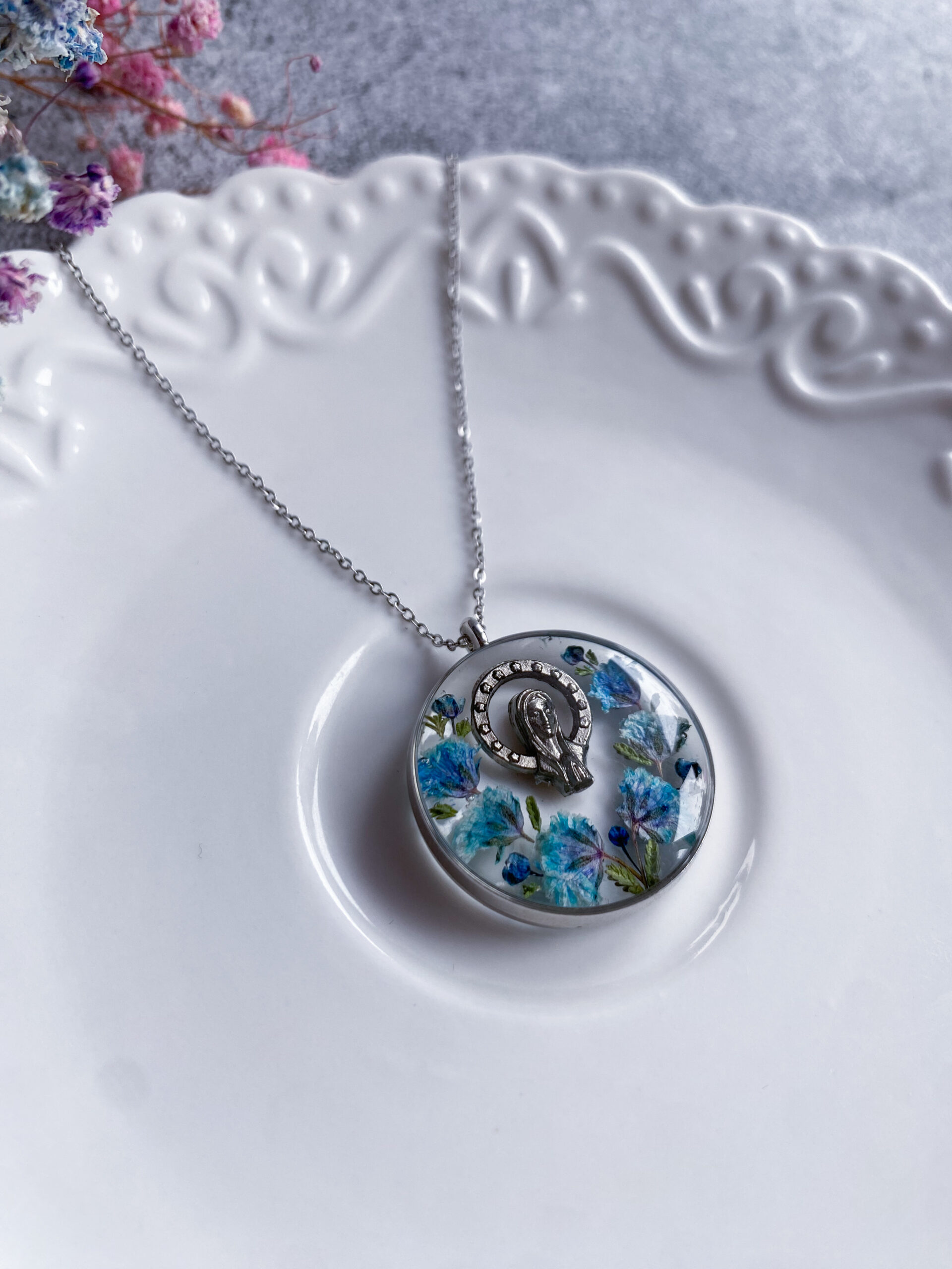 Opis: Ręcznie wykonana okrągła zawieszka z medalikiem Matki Bożej. W biżuterii zatopione zostały kwiaty niebieskiej gipsówki i gałązki zielonego wrzosu.