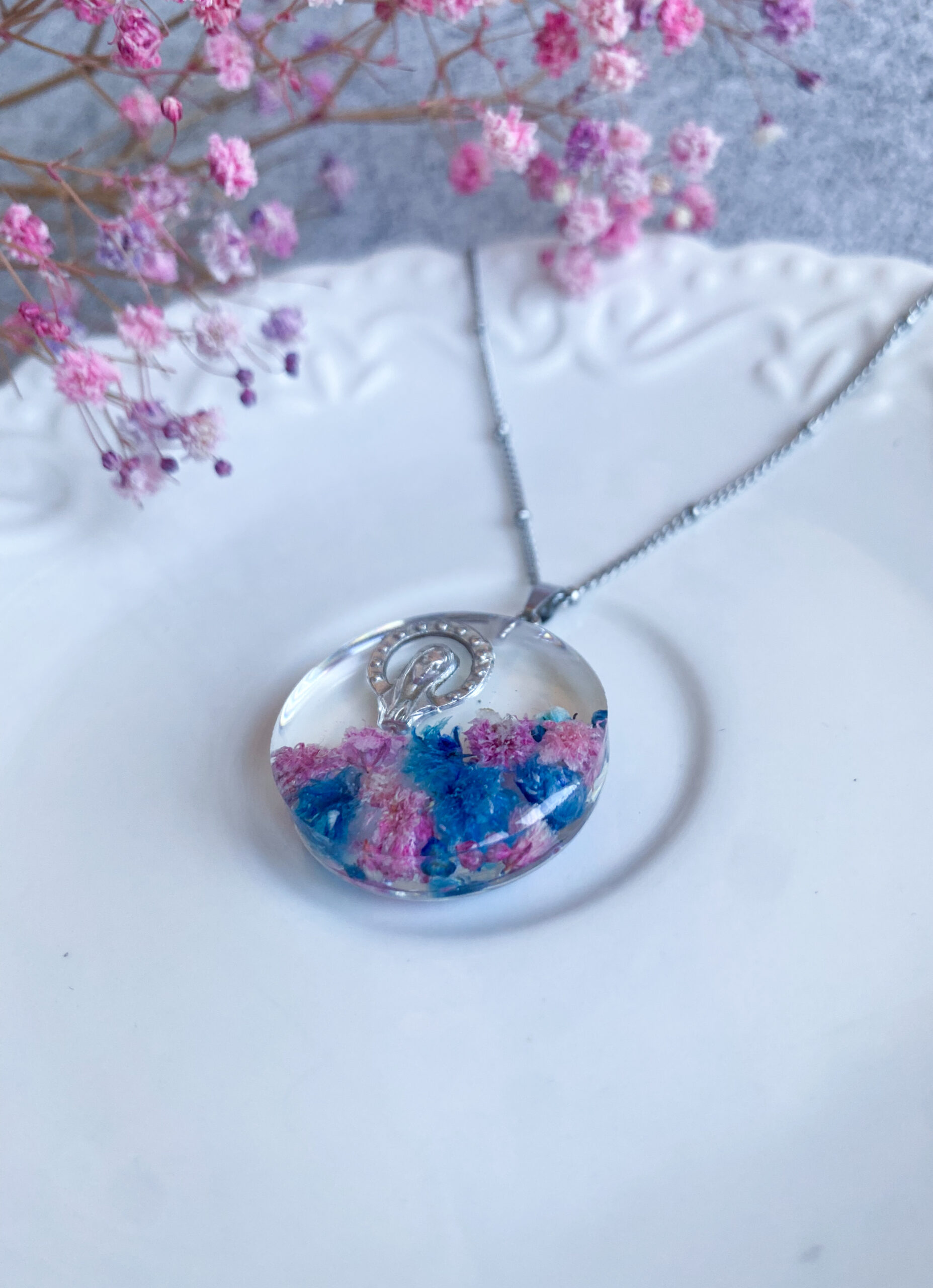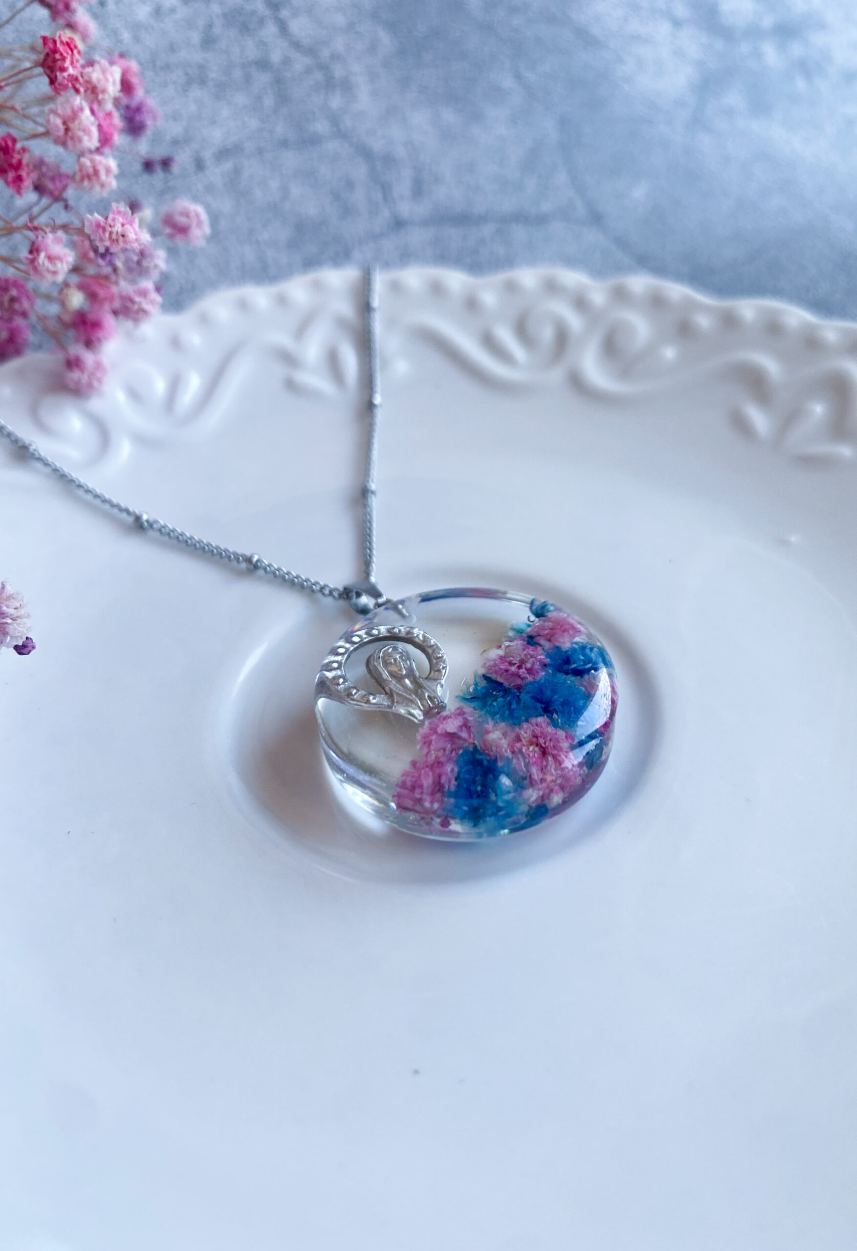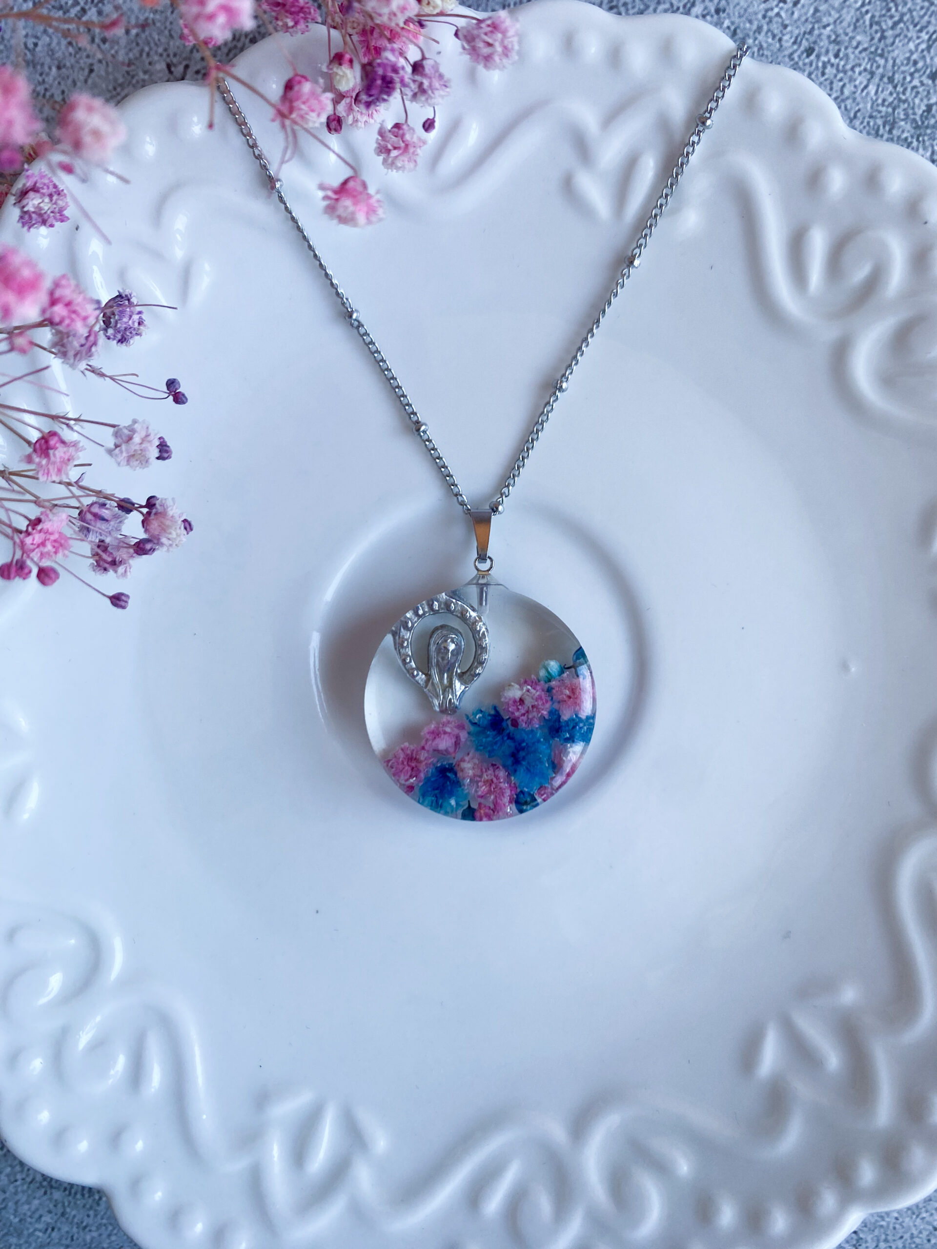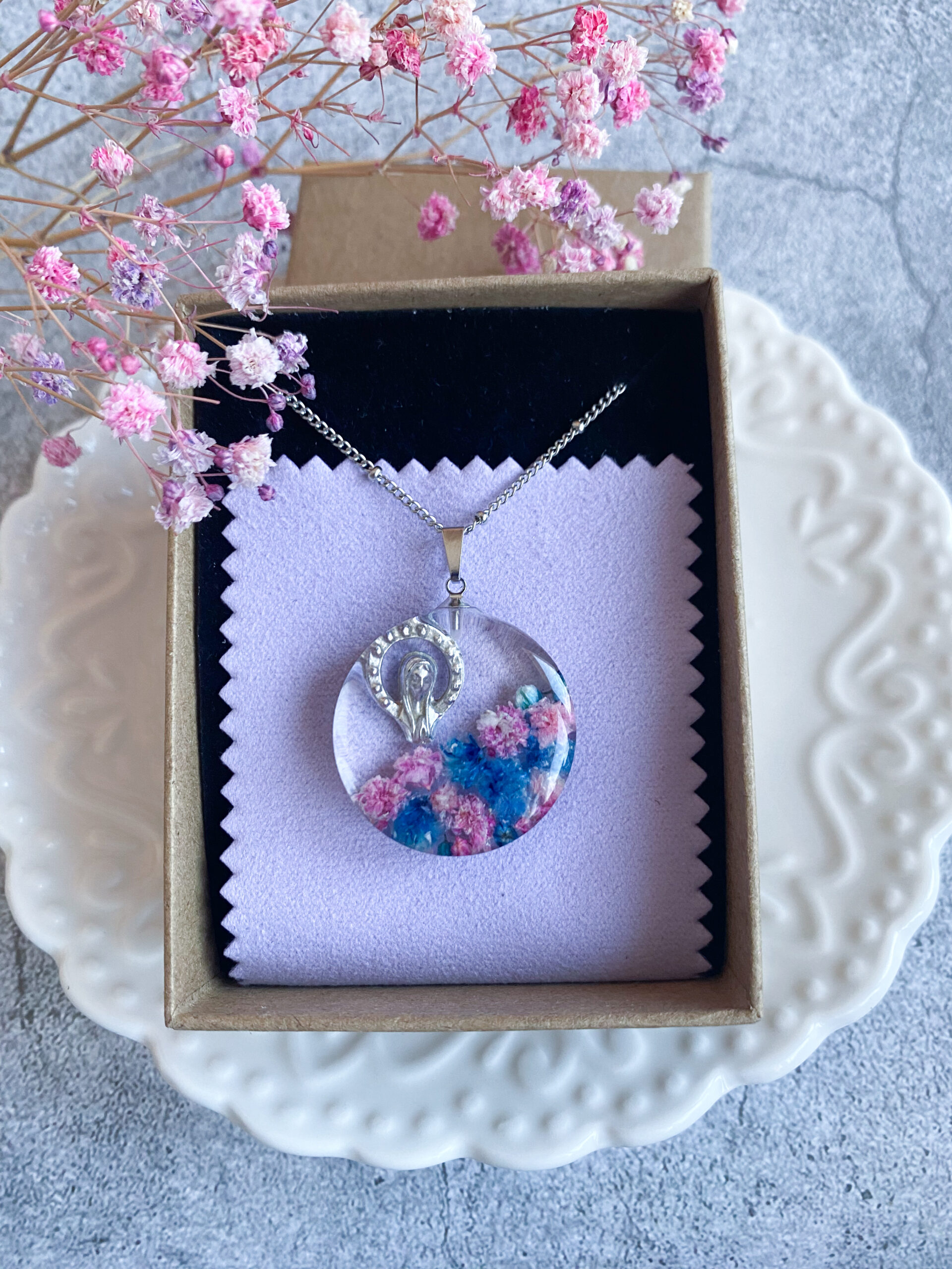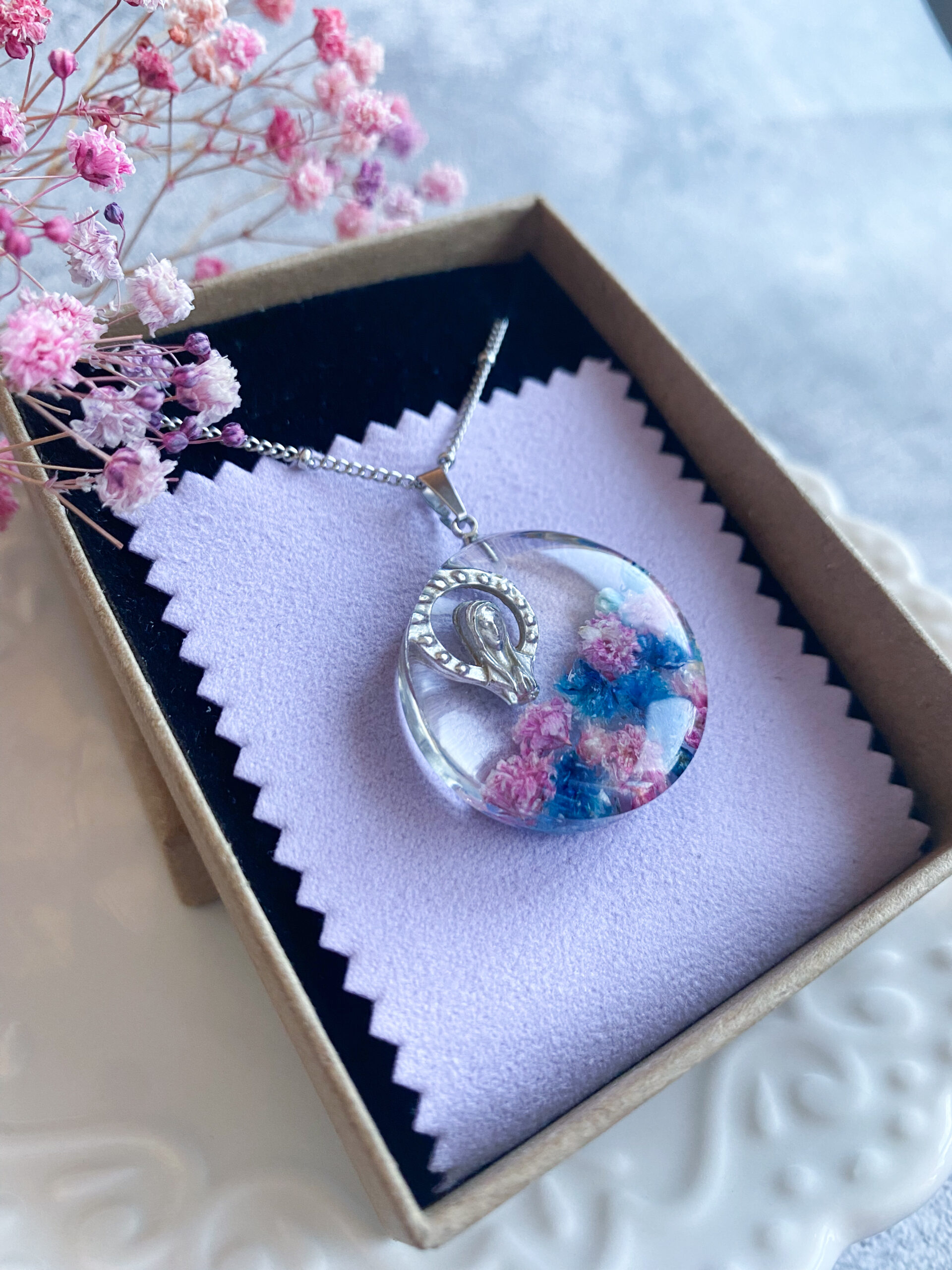 Opis: Ręcznie wykonana okrągła zawieszka z medalikiem Matki Bożej. W biżuterii zatopione zostały kwiaty różowej i niebieskiej gipsówki.
