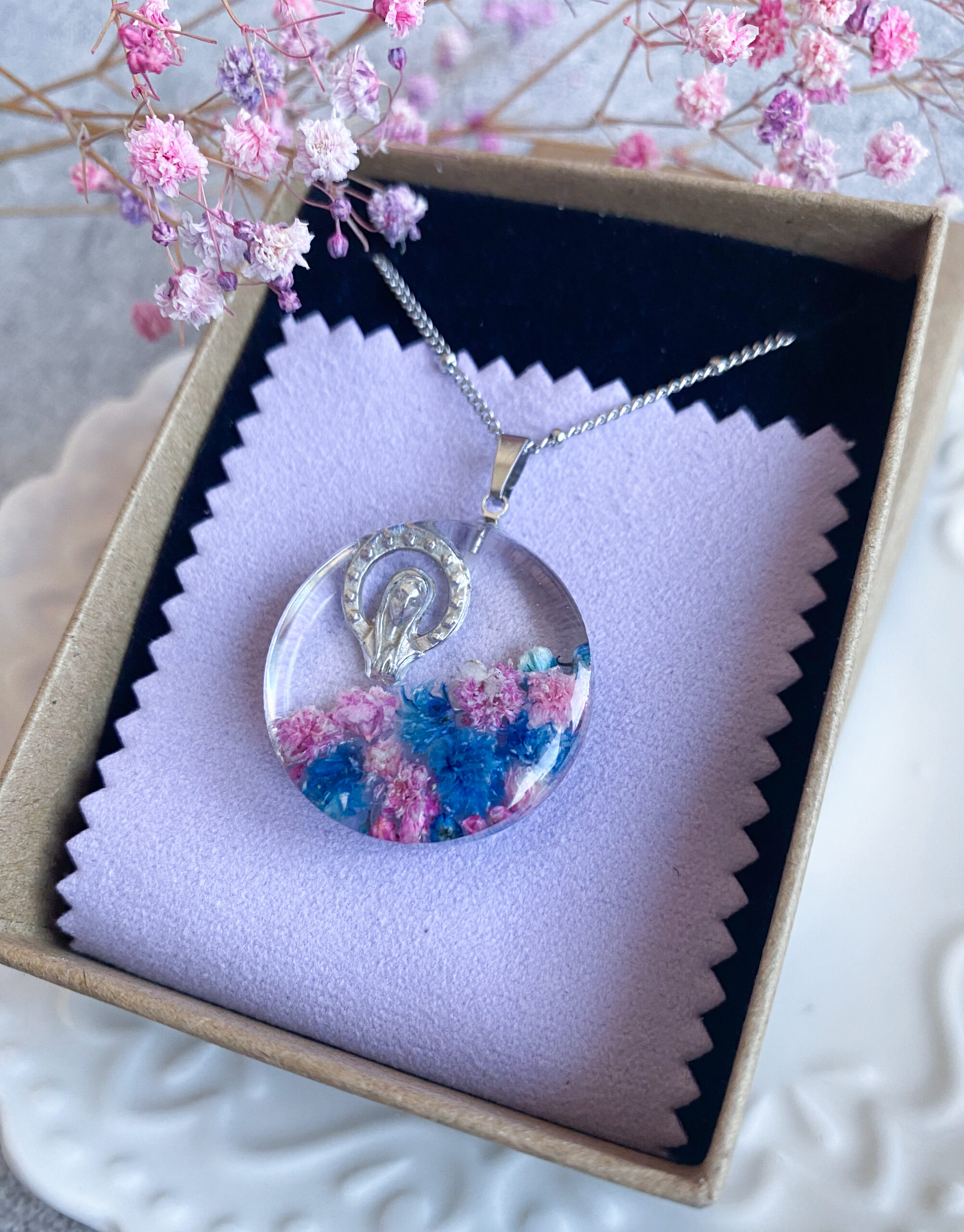 Materiały: żywica jubilerska, stal szlachetna, naturalne kwiaty;