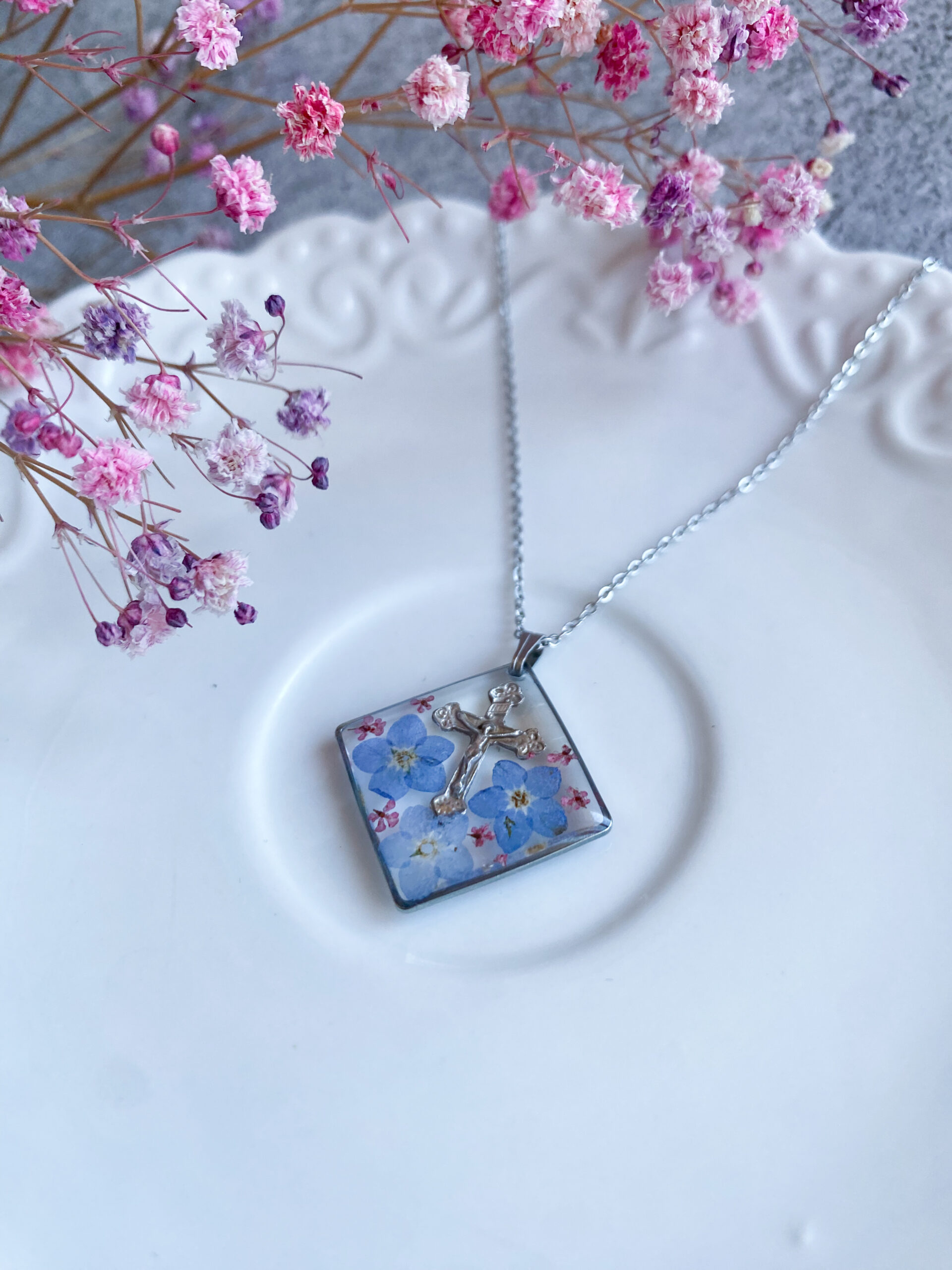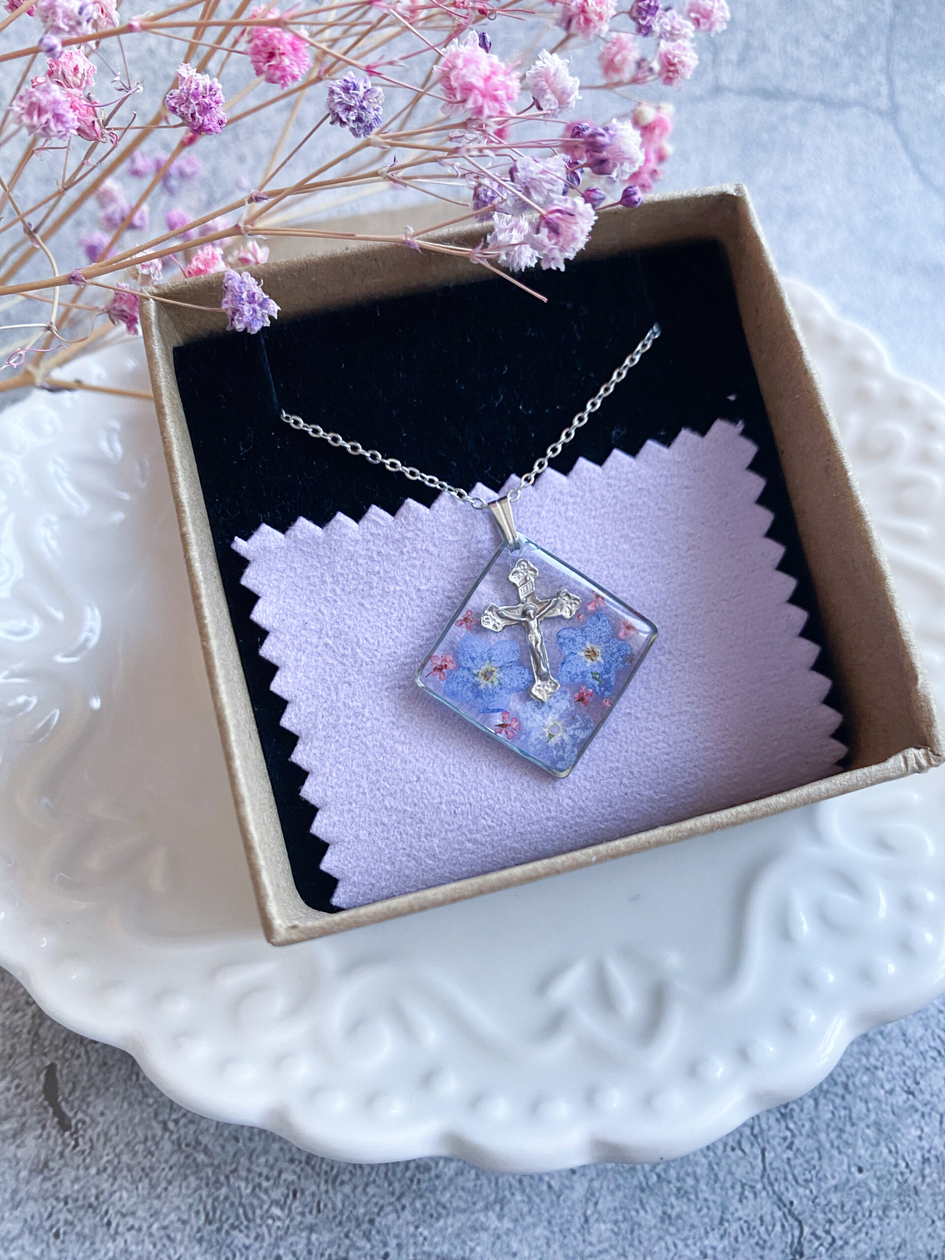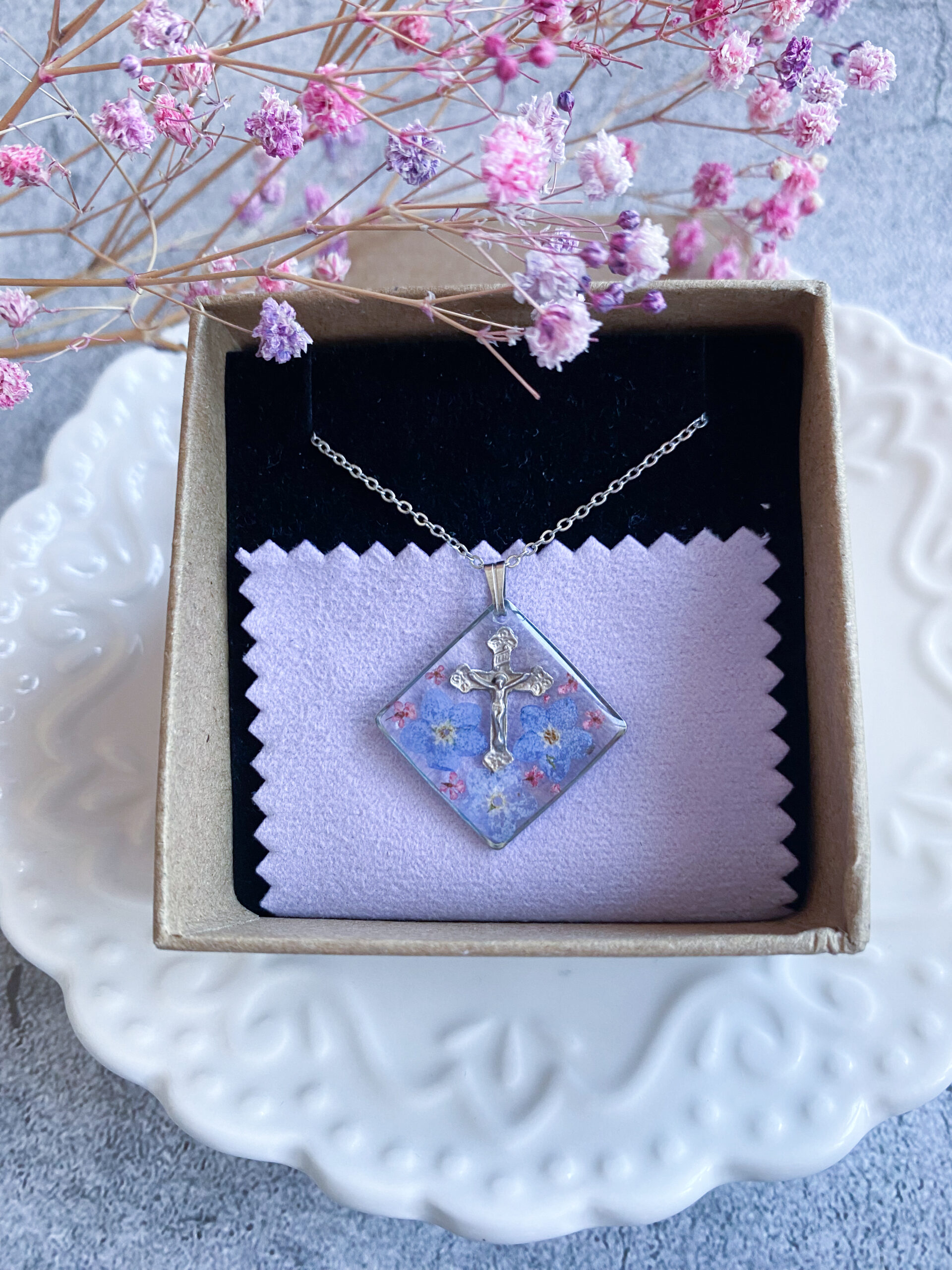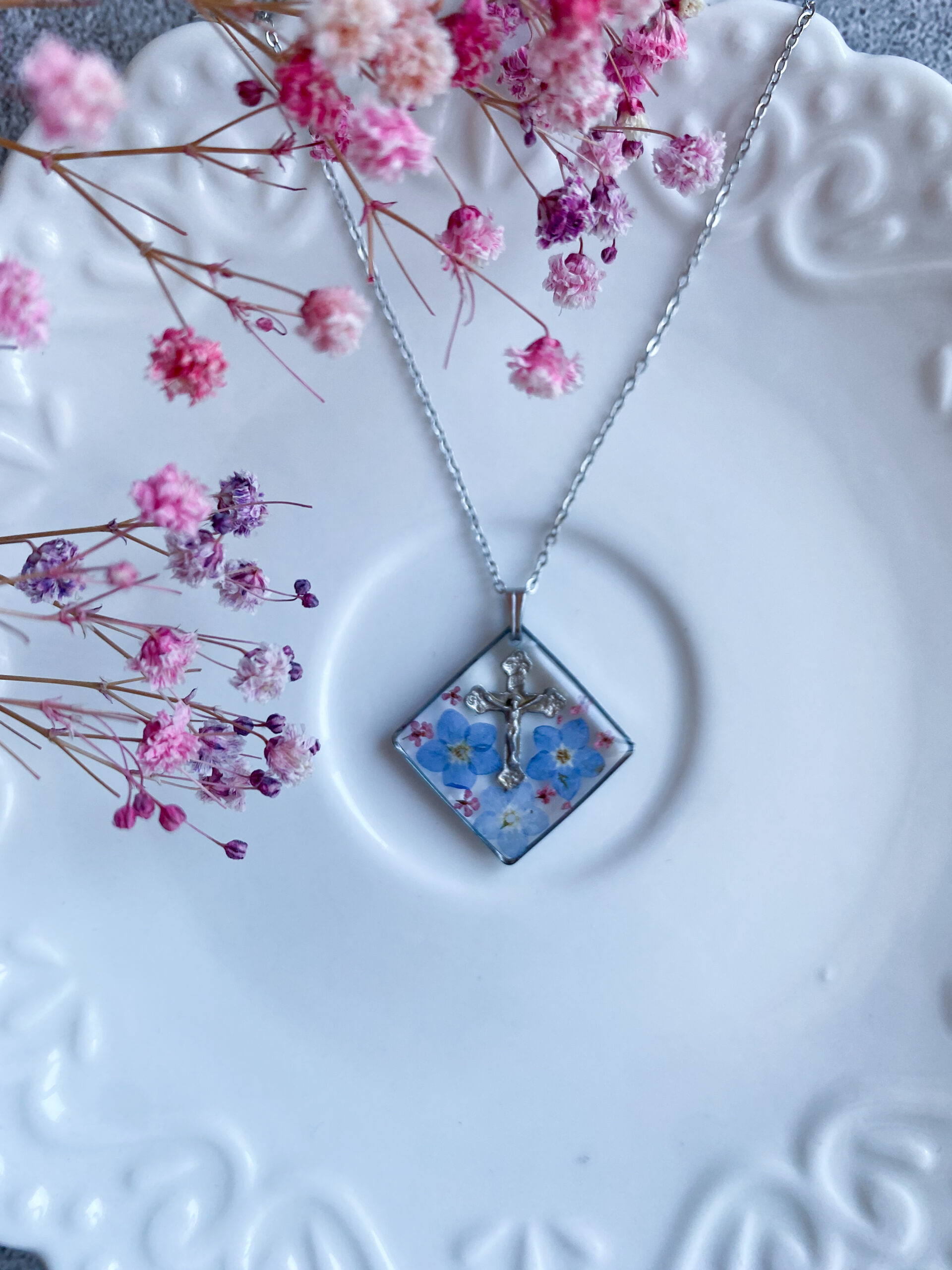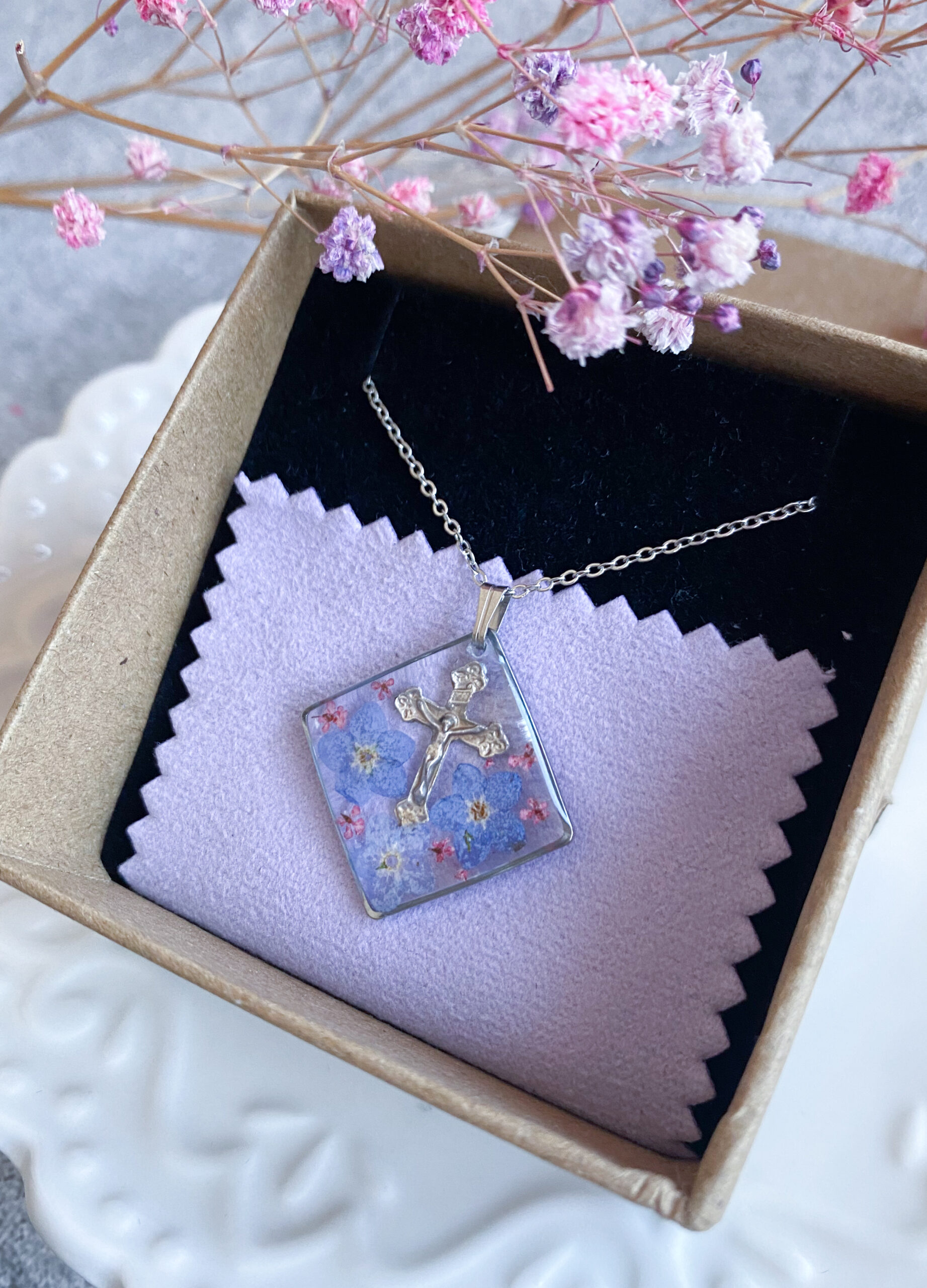 Opis: Ręcznie wykonana zawieszka w kształcie rombu z krzyżykiem. W biżuterii zatopione zostały z niezapominajkami i kwiatem różowej marchwii.