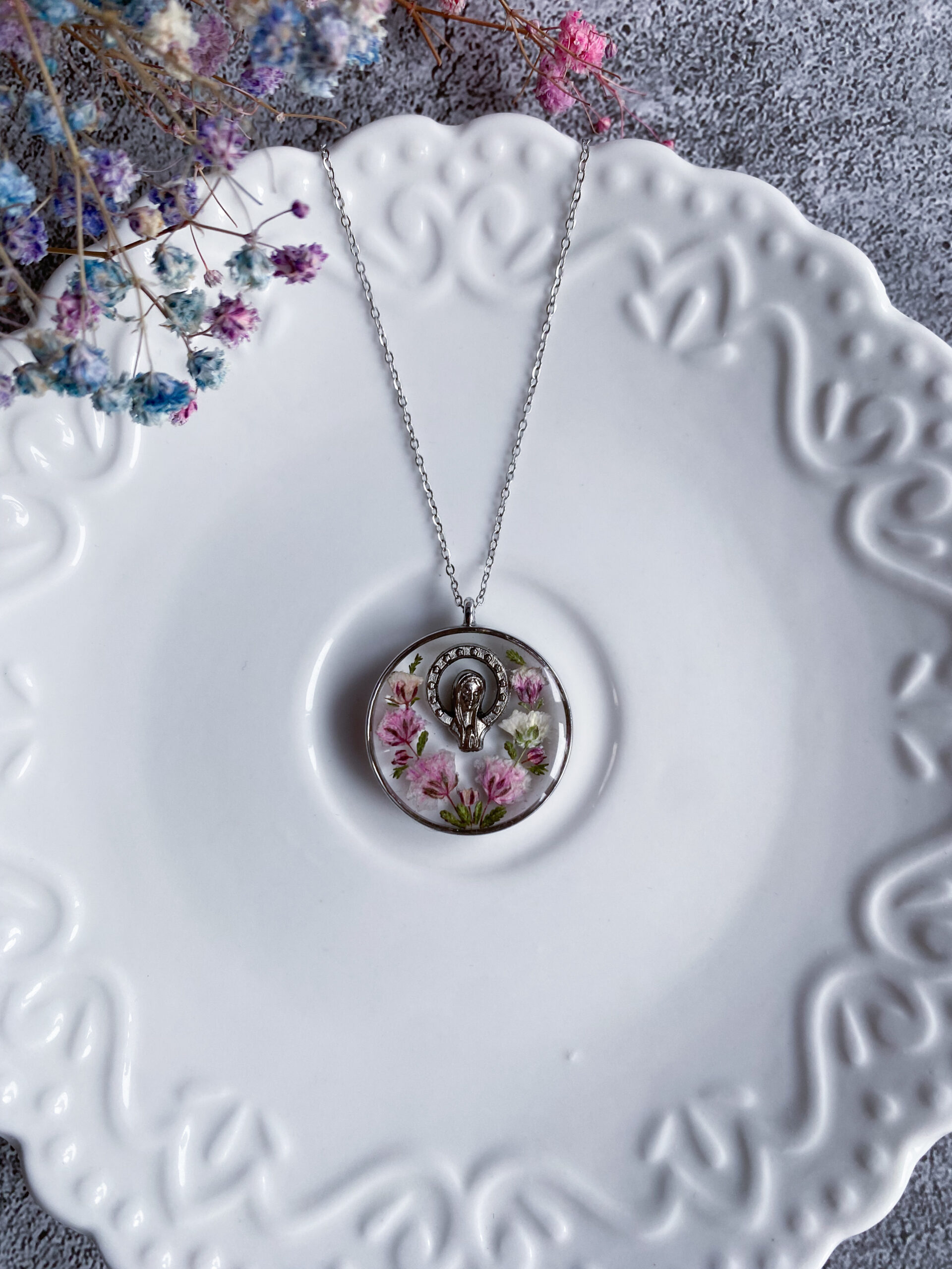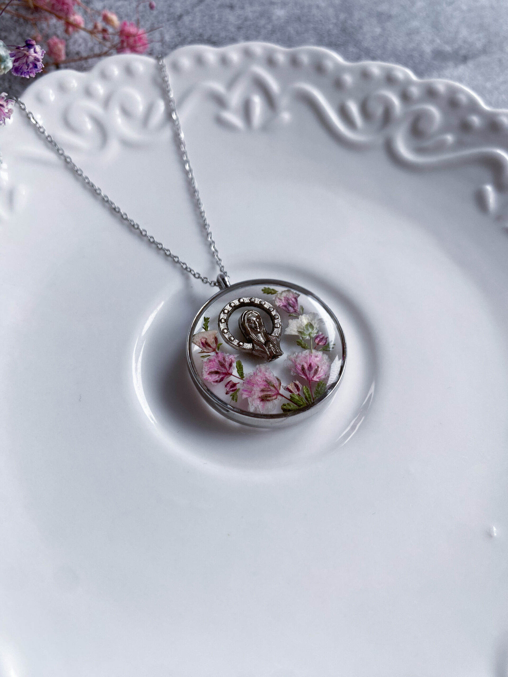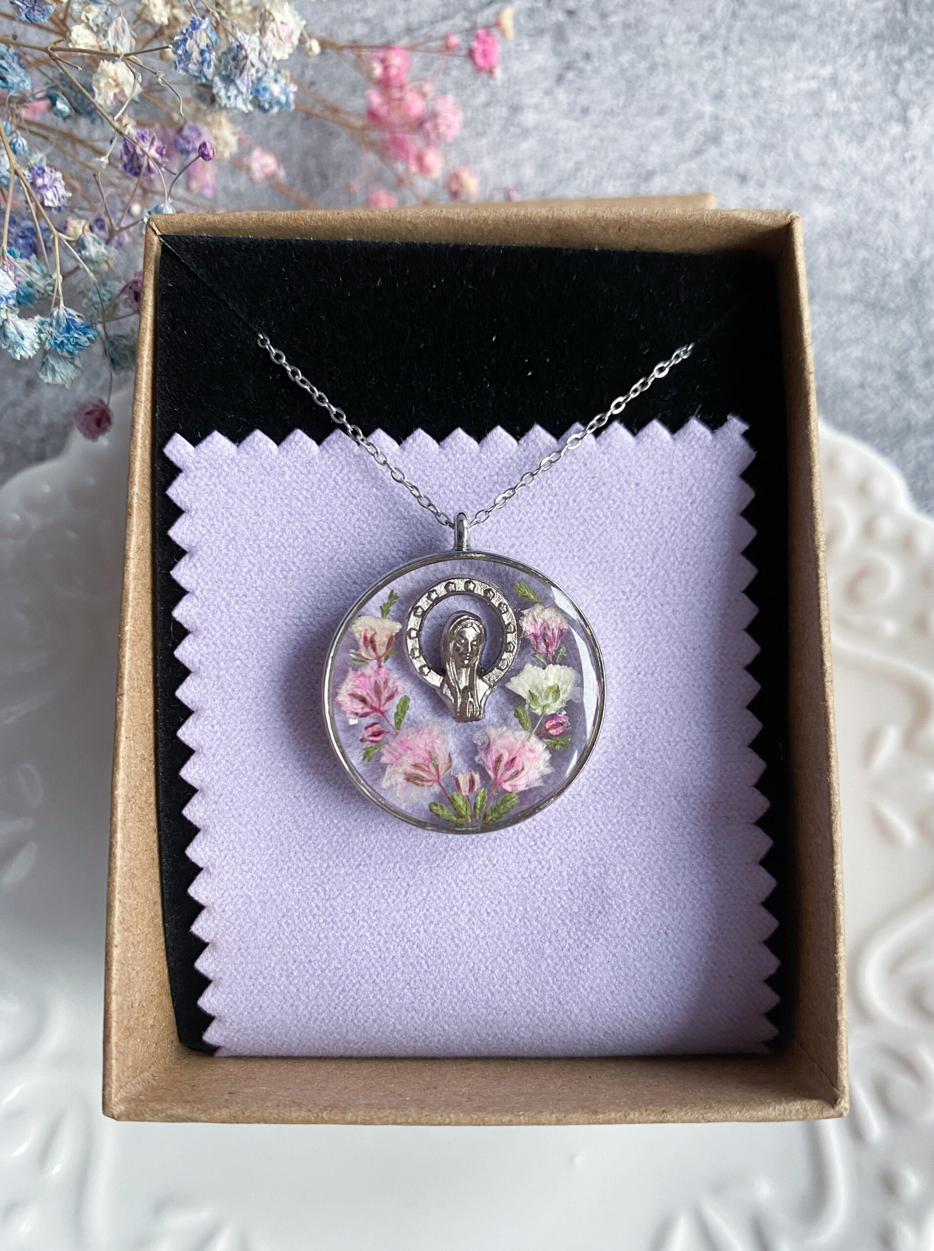 Opis: Ręcznie wykonana okrągła zawieszka z medalikiem Matki Bożej. W biżuterii zatopione zostały kwiaty różowej gipsówki i gałązki zielonego wrzosu.