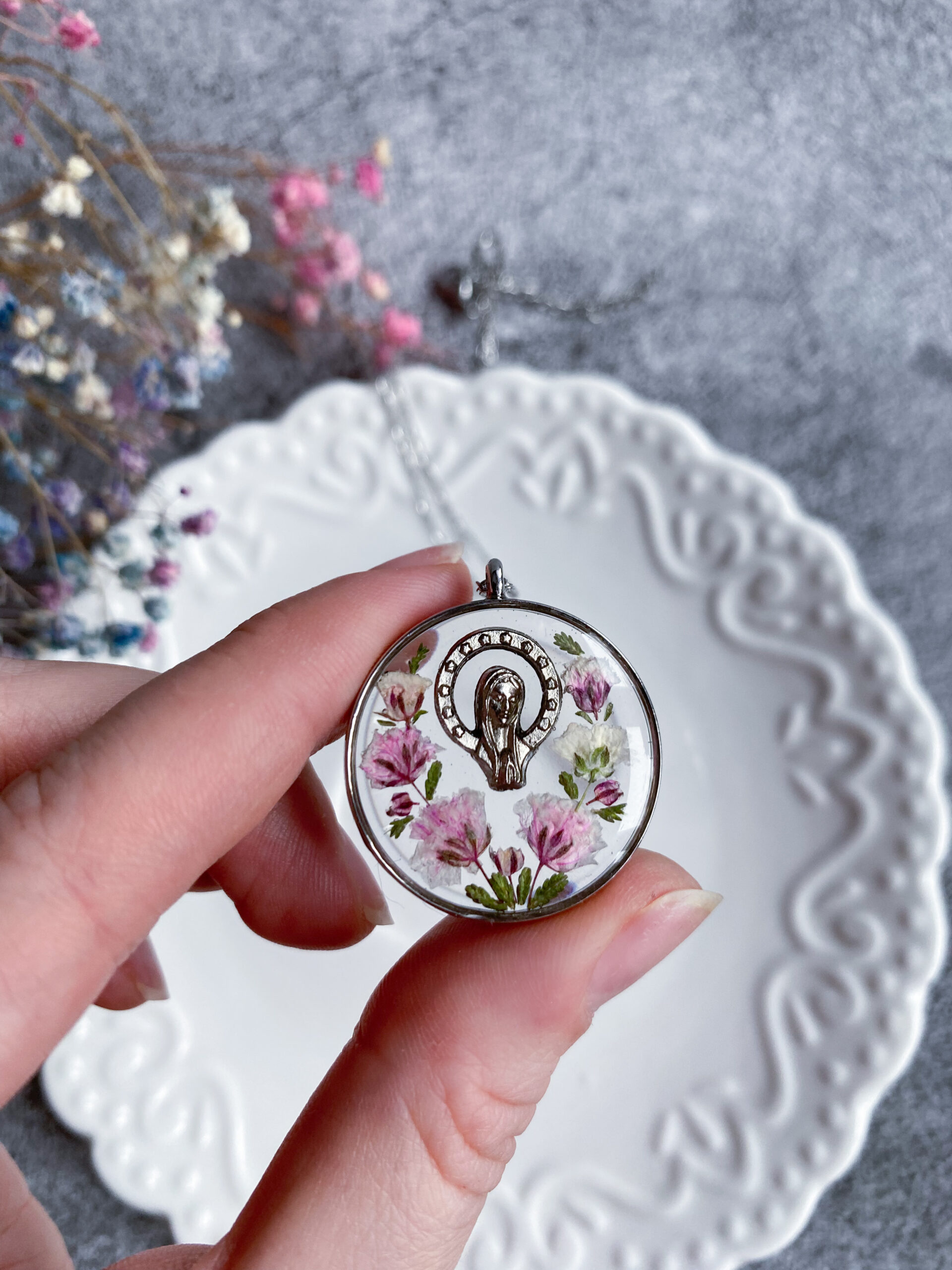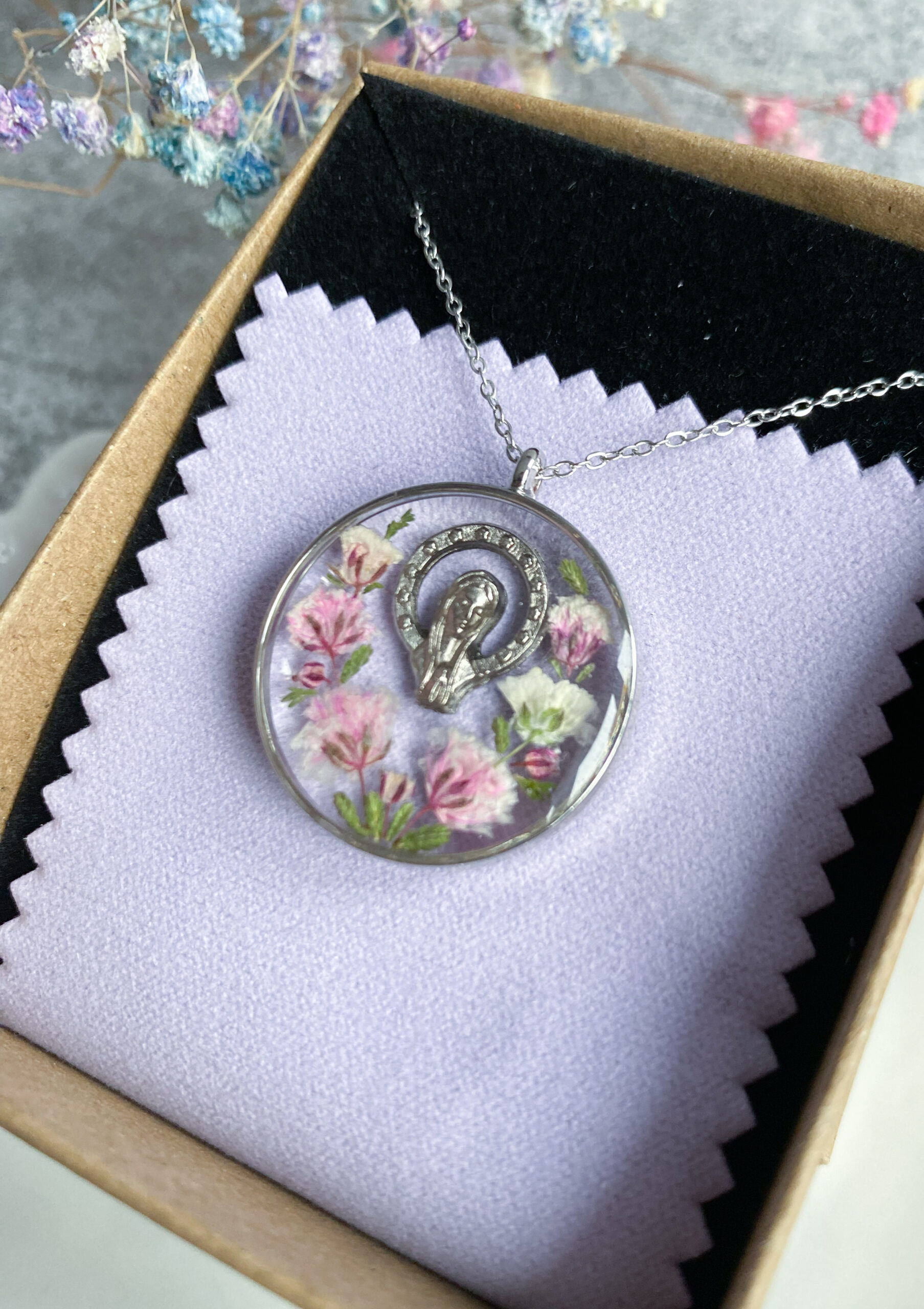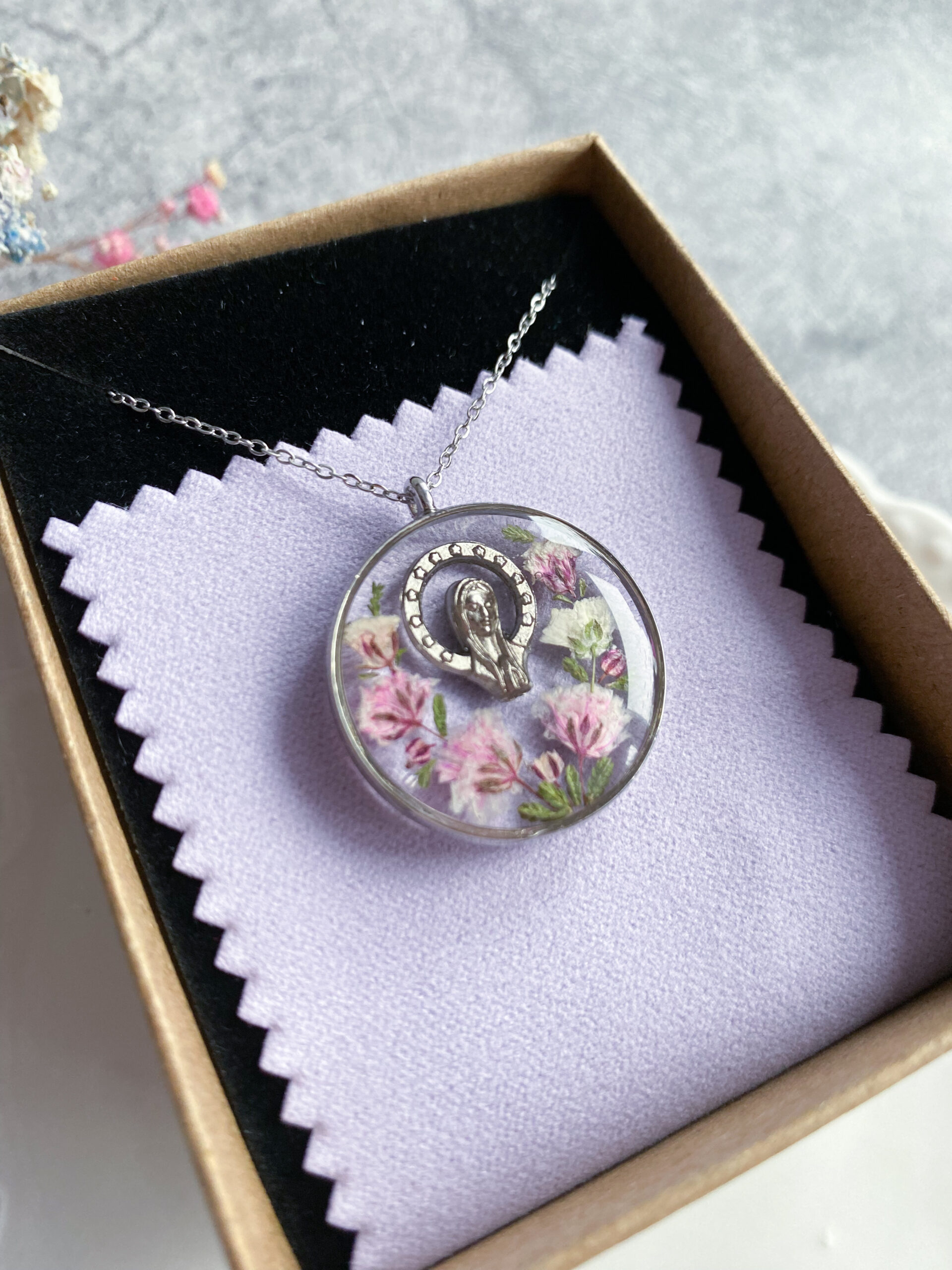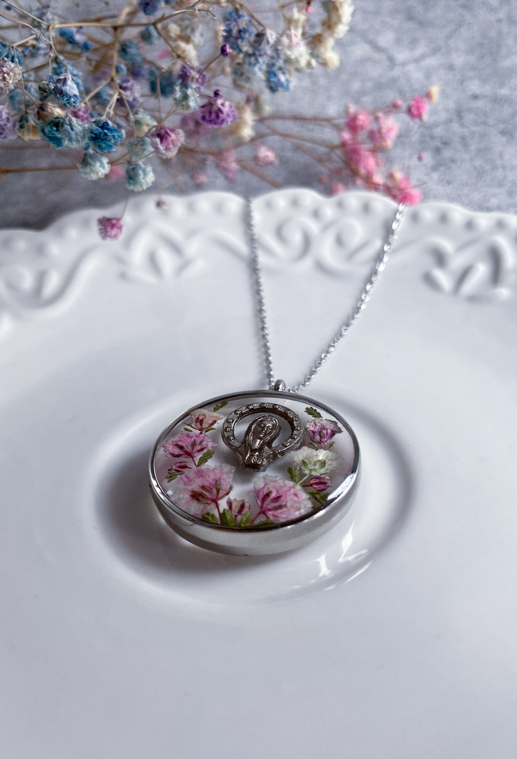 Opis: Ręcznie wykonana okrągła zawieszka z medalikiem Matki Bożej. W biżuterii zatopione zostały kwiaty różowej gipsówki i gałązki zielonego wrzosu.