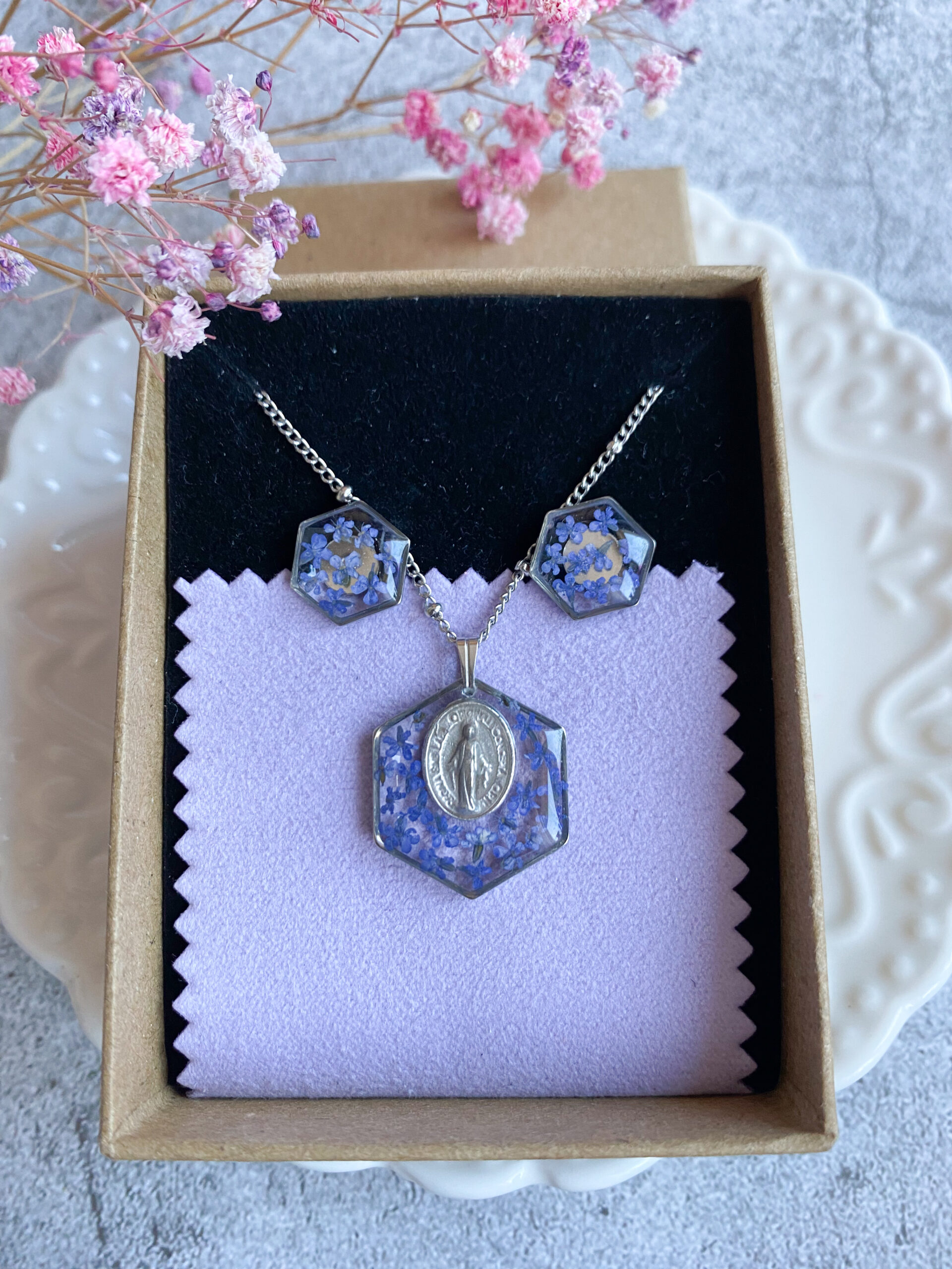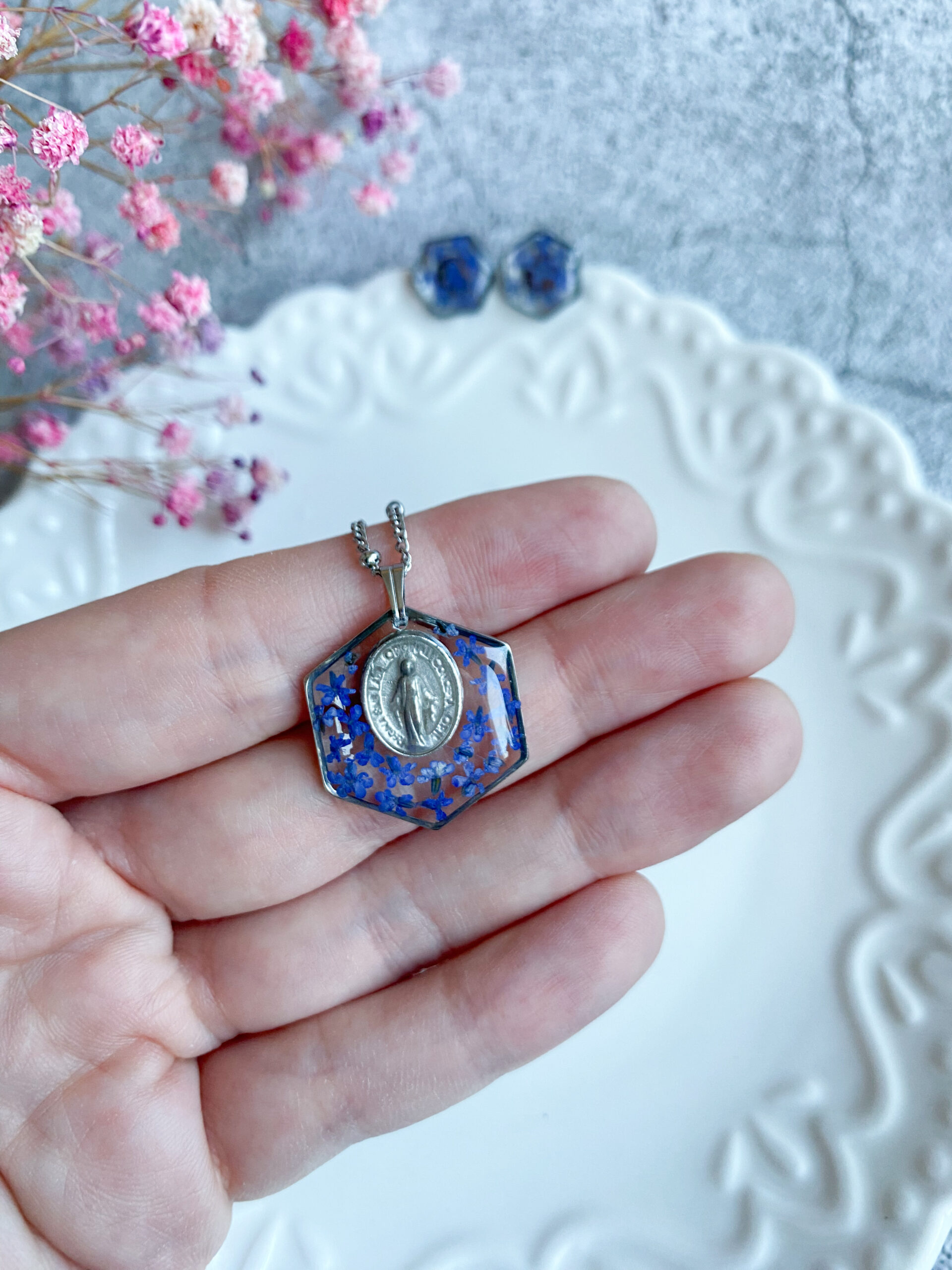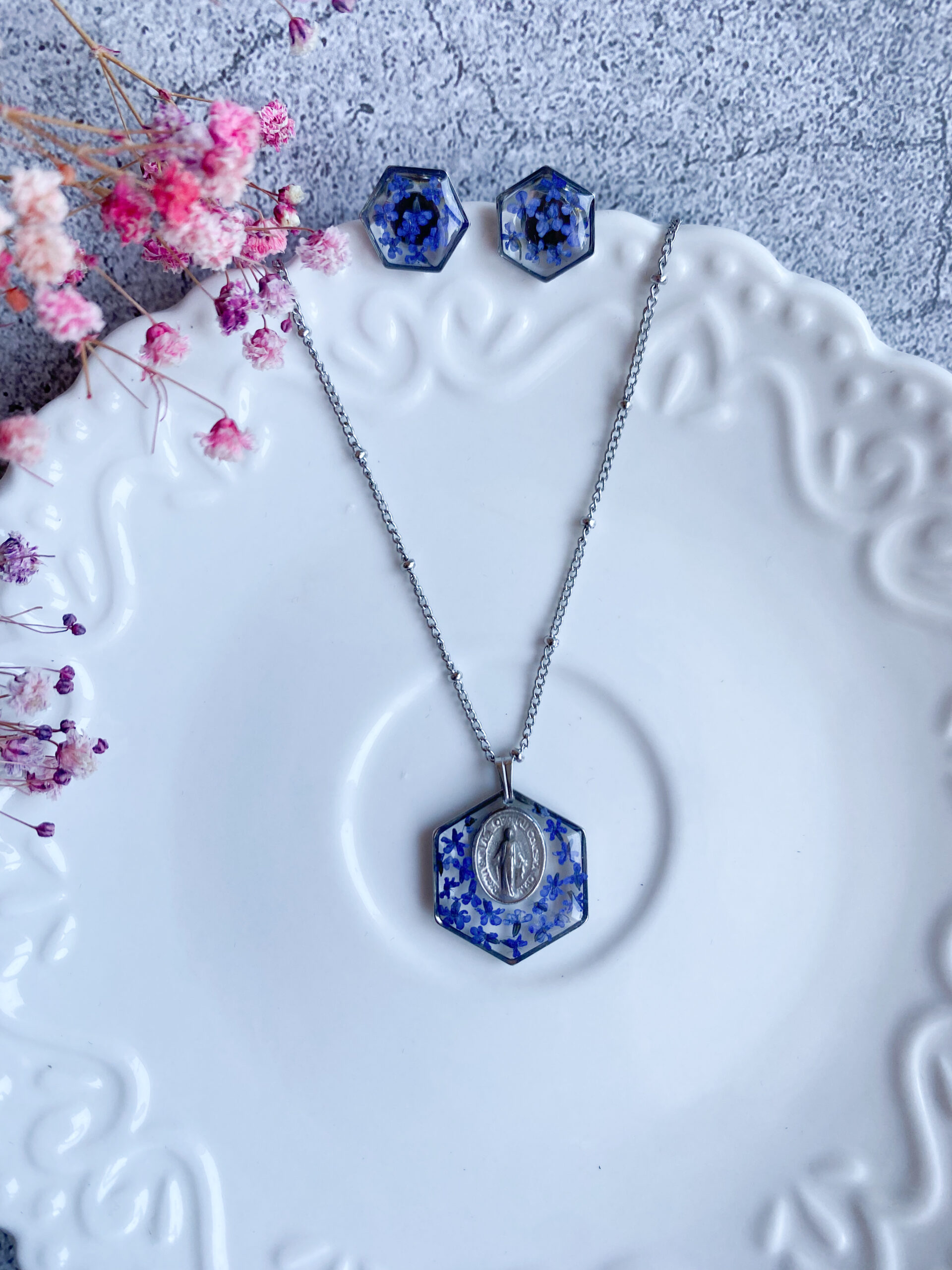 Opis: Ręcznie wykonany dwuelementowy zestaw biżuterii składający się z kolczyków wkrętek oraz zawieszki w kształcie heksagonu. W biżuterii zatopione zostały kwiaty granatowej marchwii oraz medalik Matki Bożej.