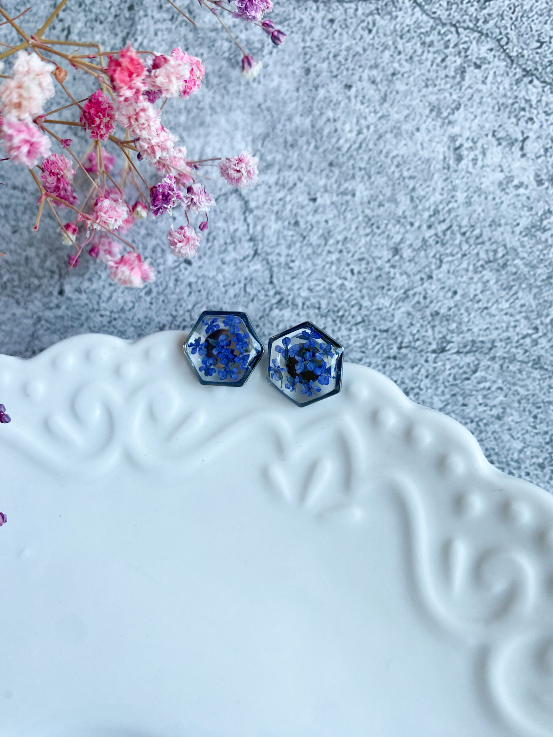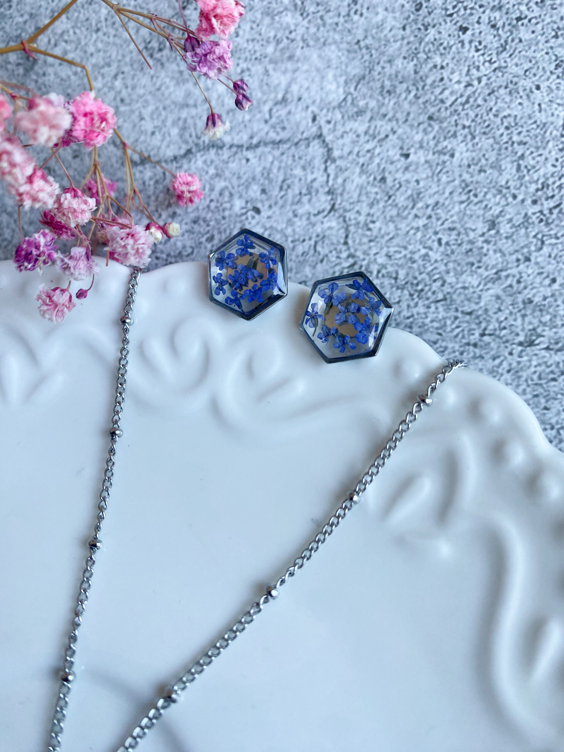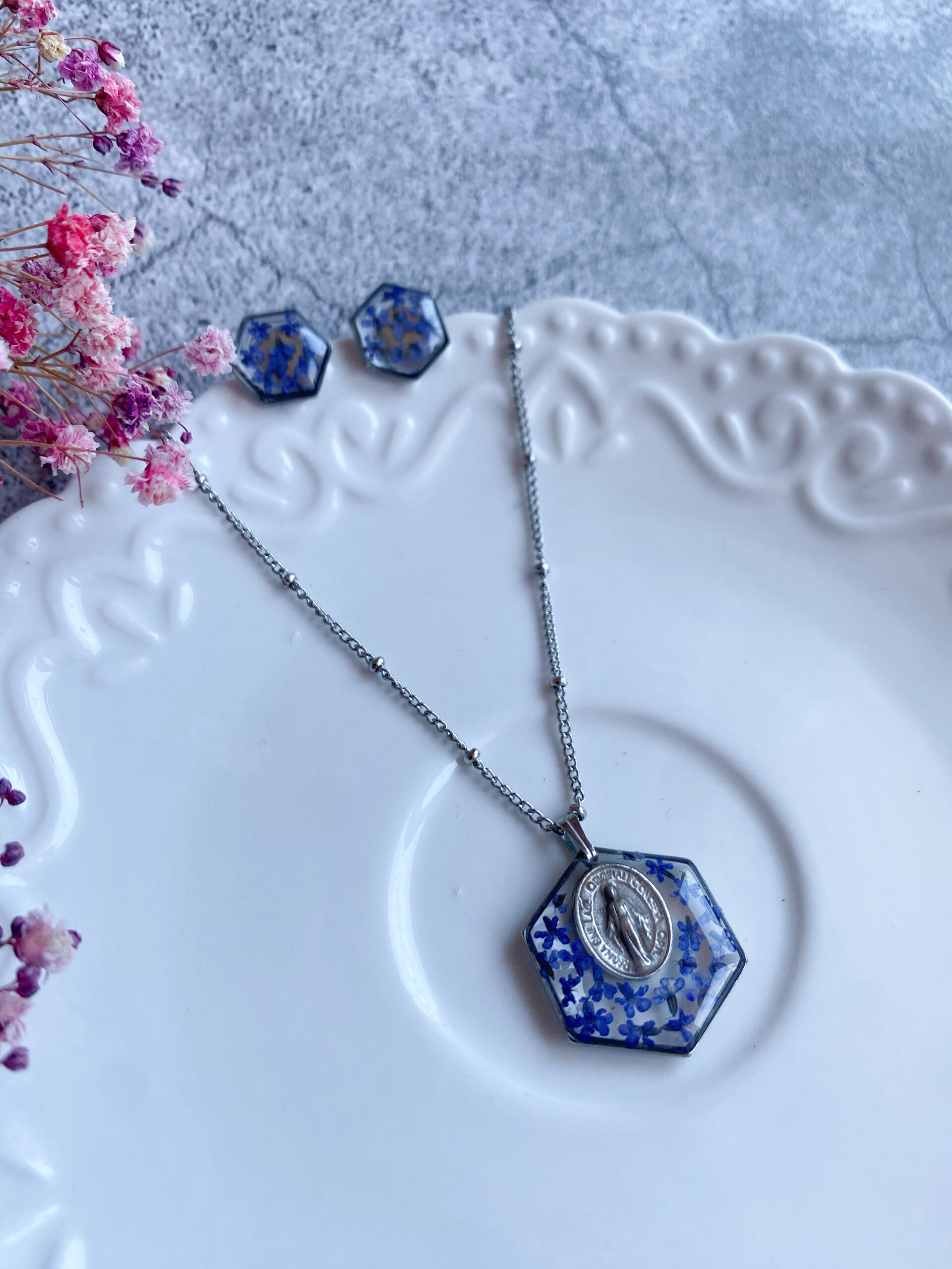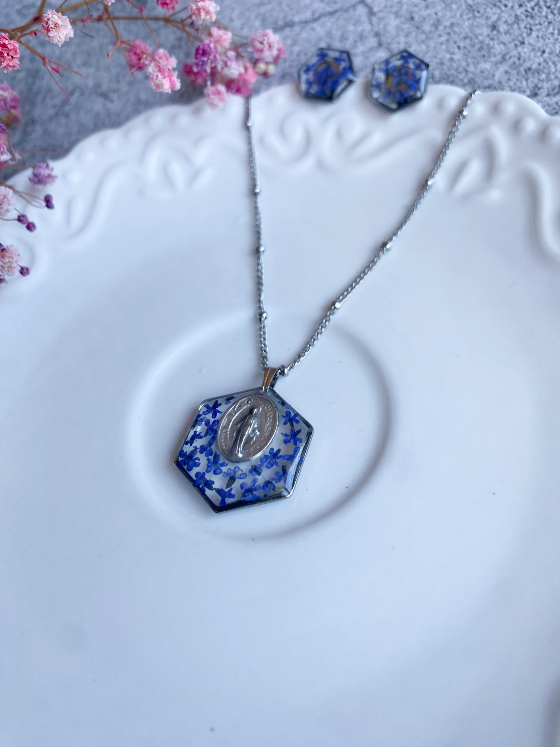 Opis: Ręcznie wykonany dwuelementowy zestaw biżuterii składający się z kolczyków wkrętek oraz zawieszki w kształcie heksagonu. W biżuterii zatopione zostały kwiaty granatowej marchwii oraz medalik Matki Bożej.