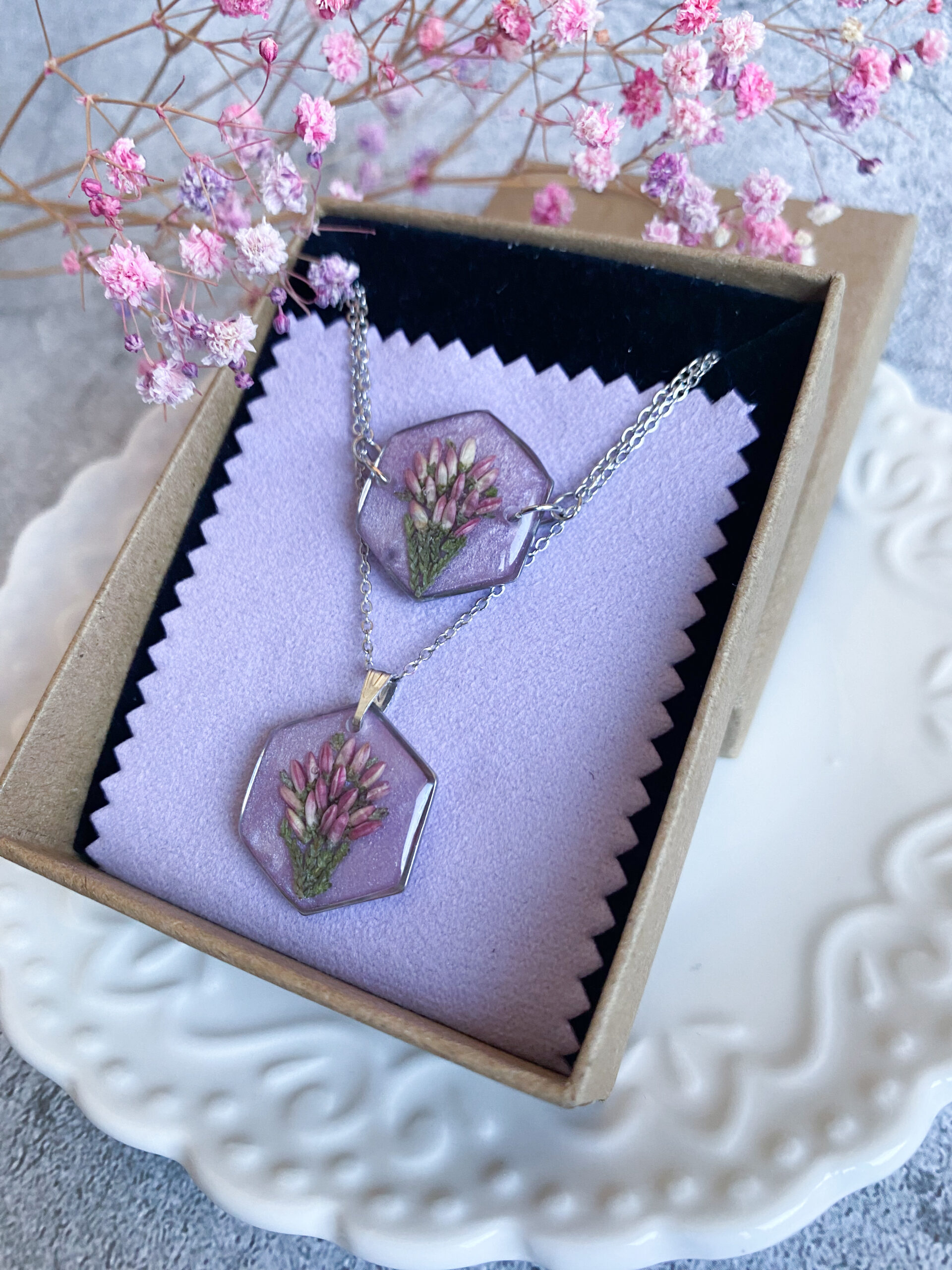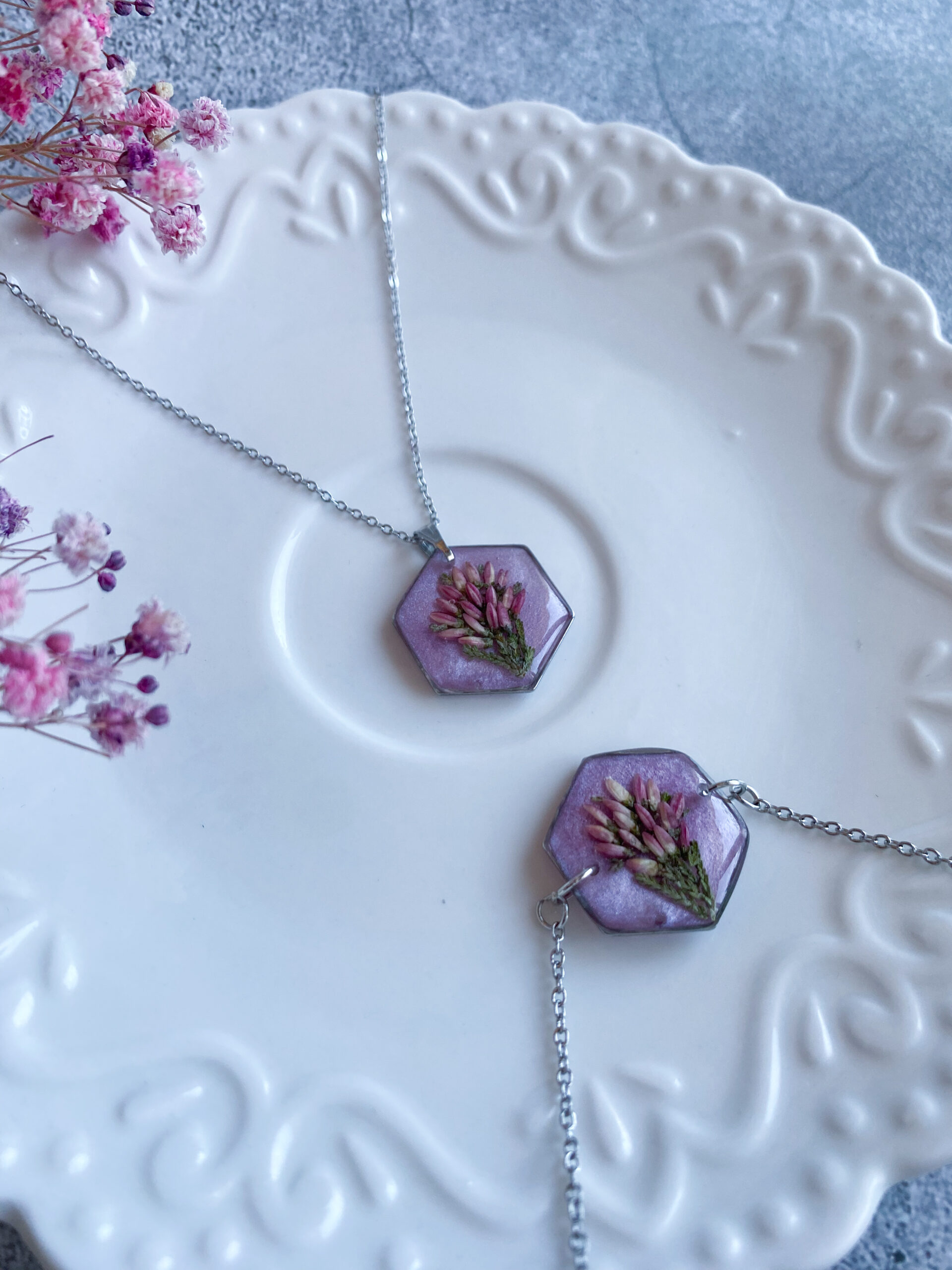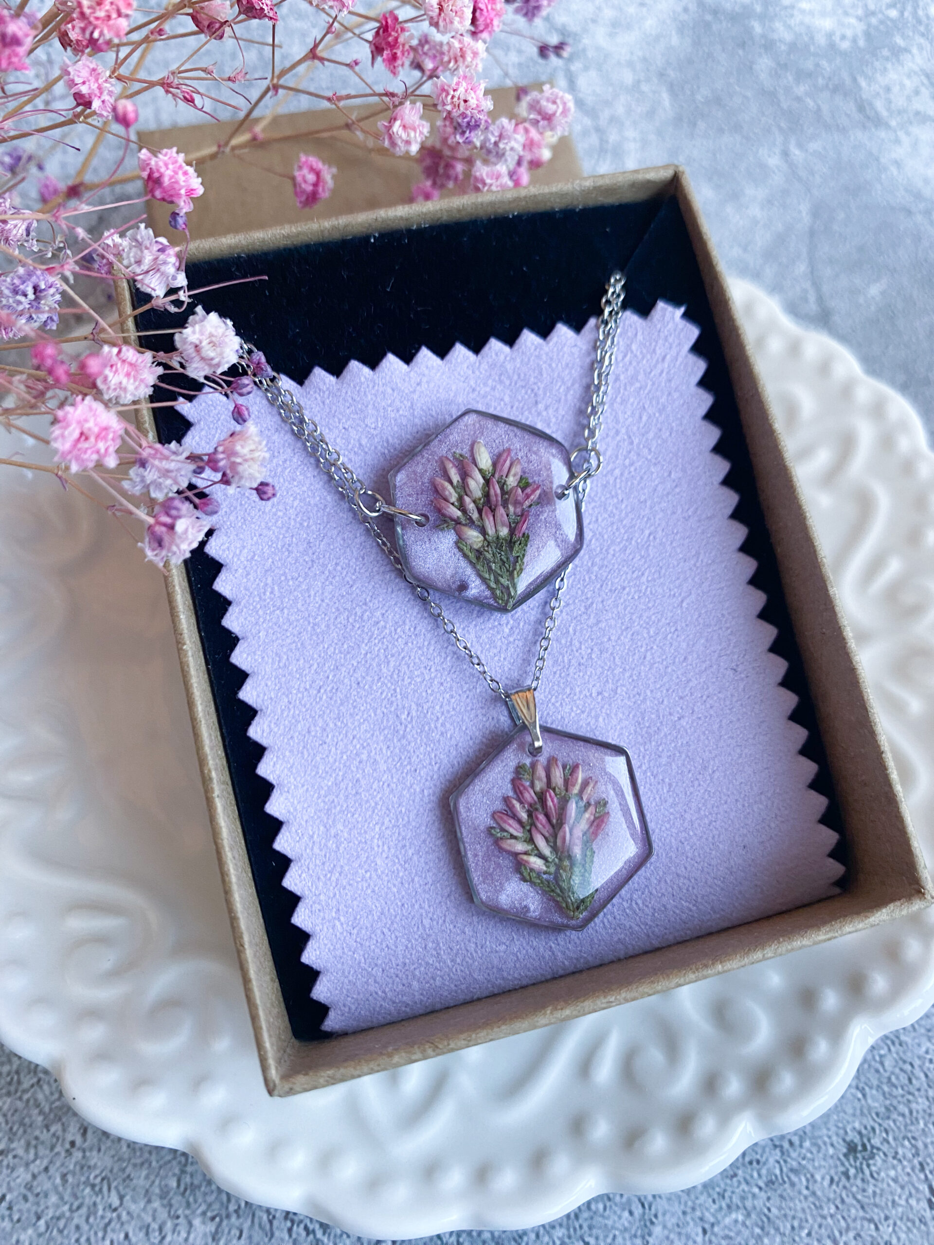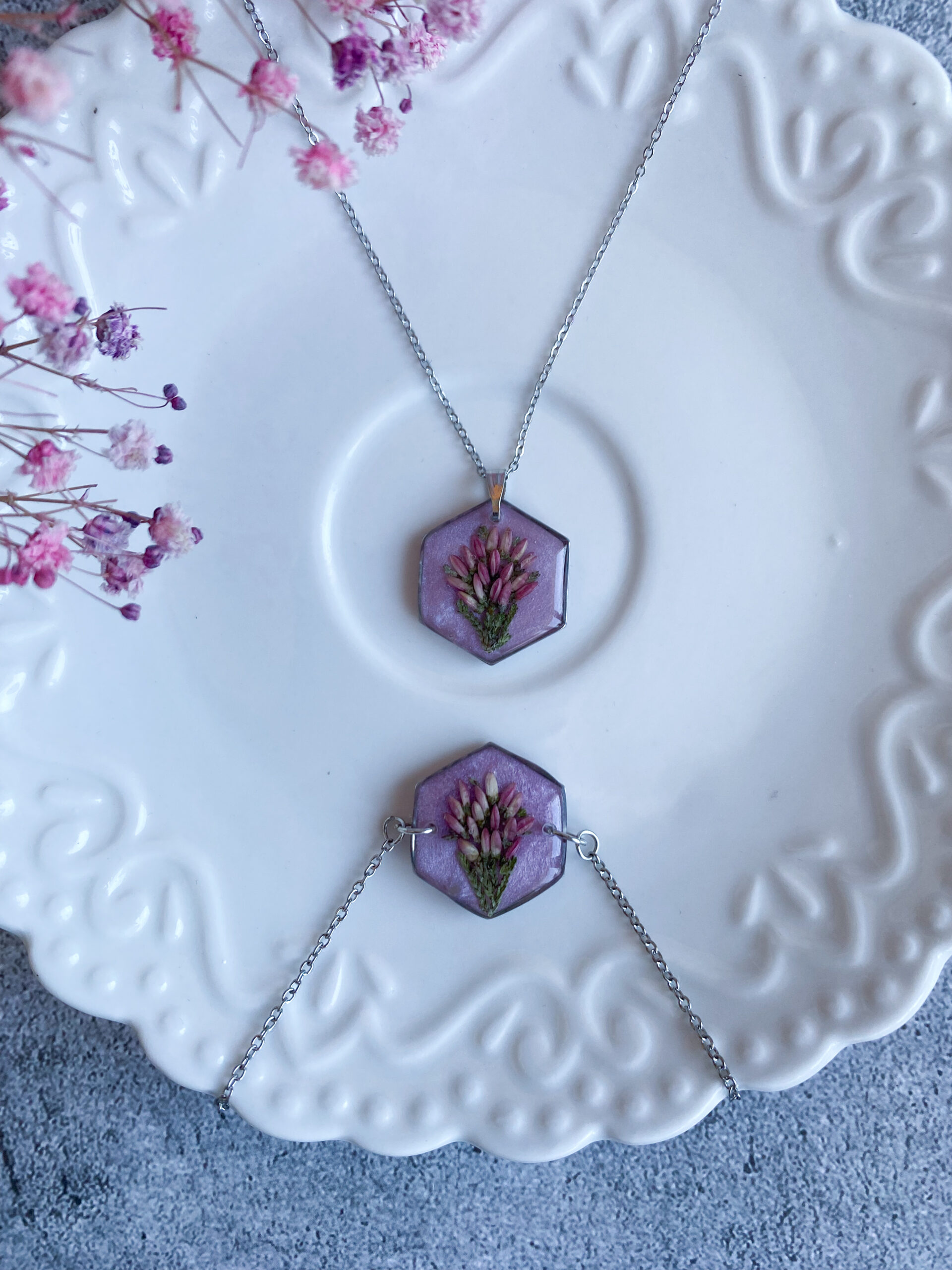 Opis: Ręcznie wykonany dwuelementowy zestaw biżuterii w kształcie sześcianu składający się z zawieszki oraz bransoletki. W biżuterii zatopione zostały różowych wrzosów na fioletowym tle.