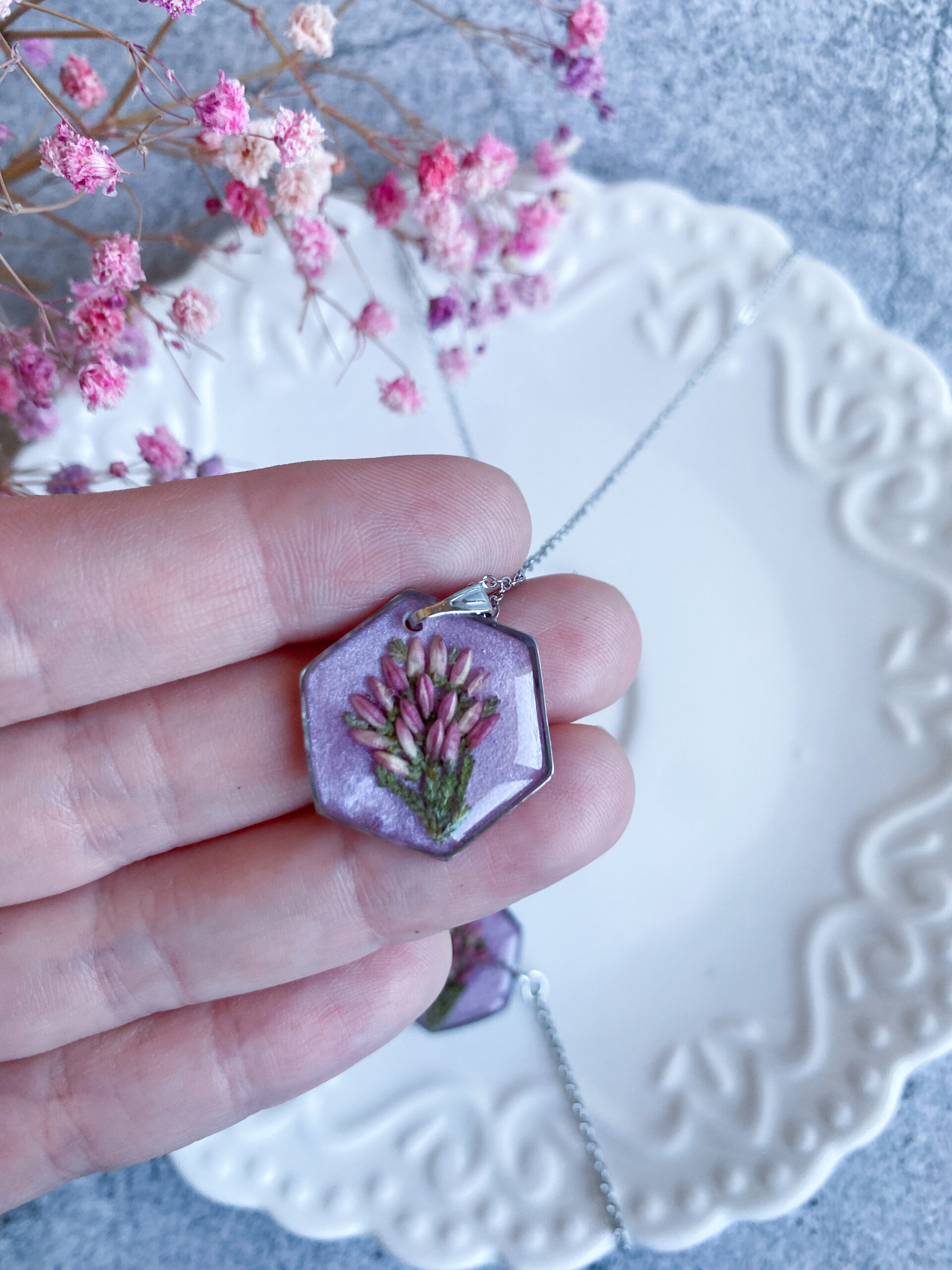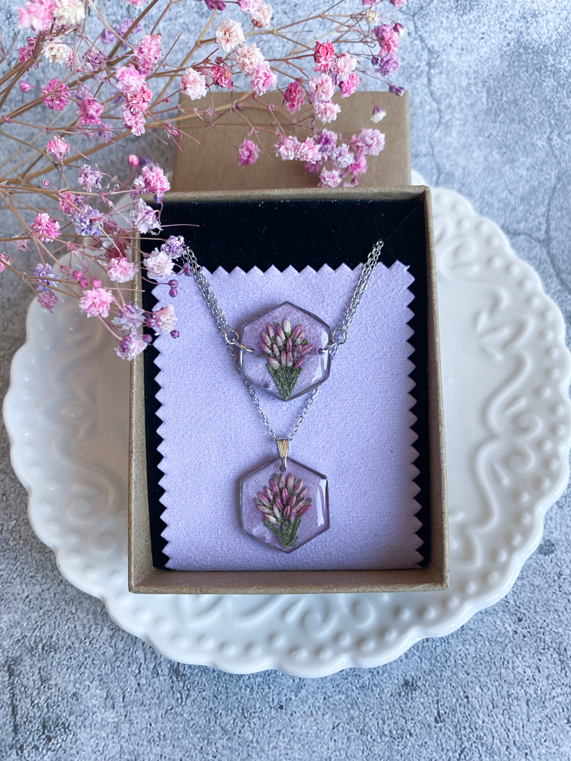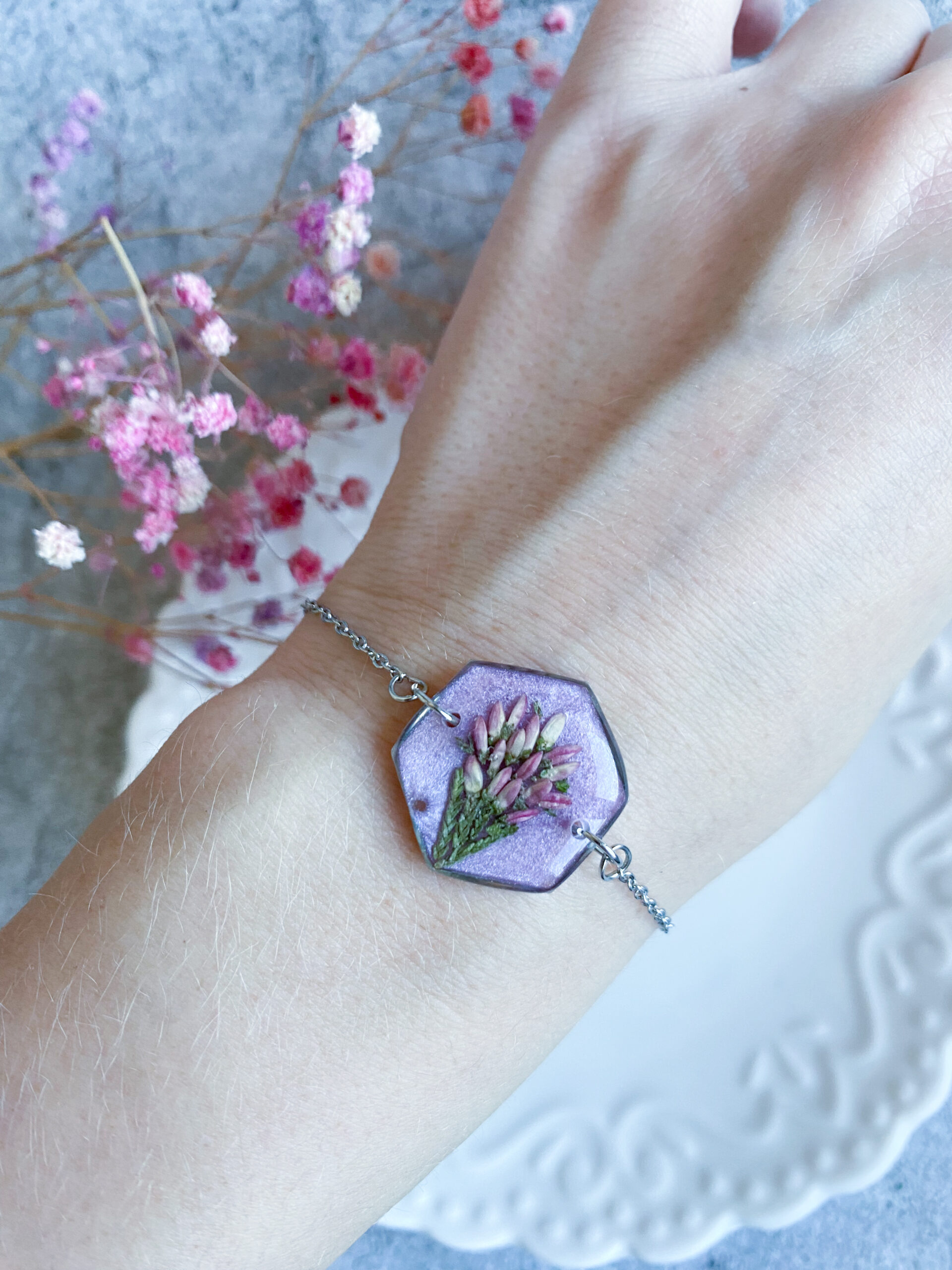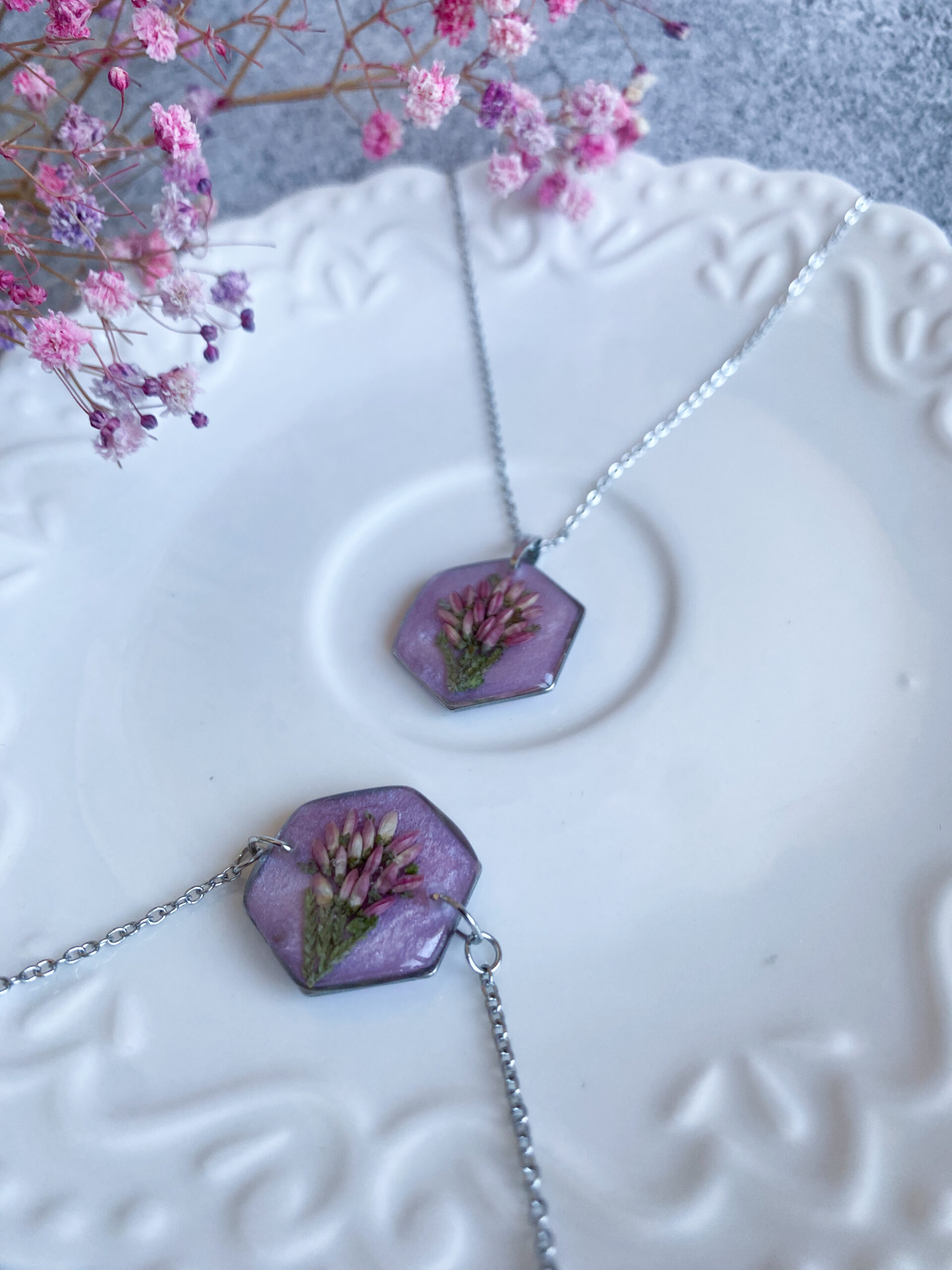 Opis: Ręcznie wykonany dwuelementowy zestaw biżuterii w kształcie sześcianu składający się z zawieszki oraz bransoletki. W biżuterii zatopione zostały różowych wrzosów na fioletowym tle.